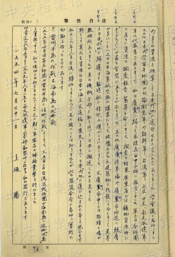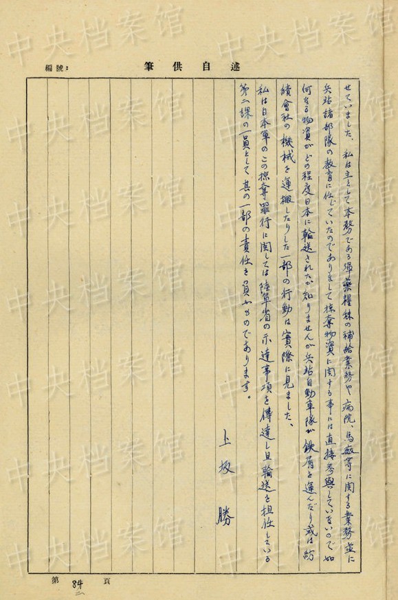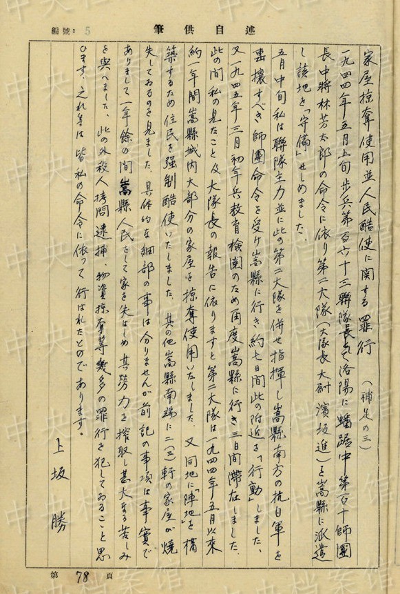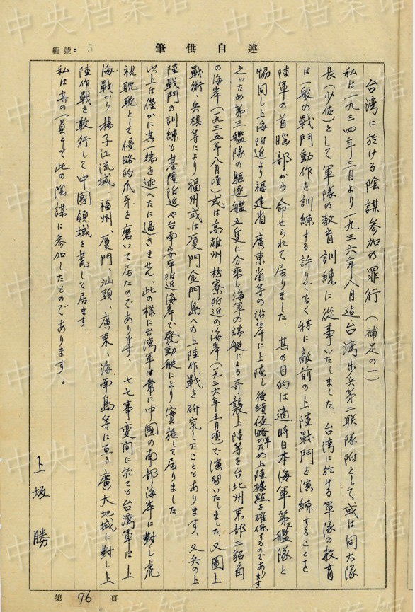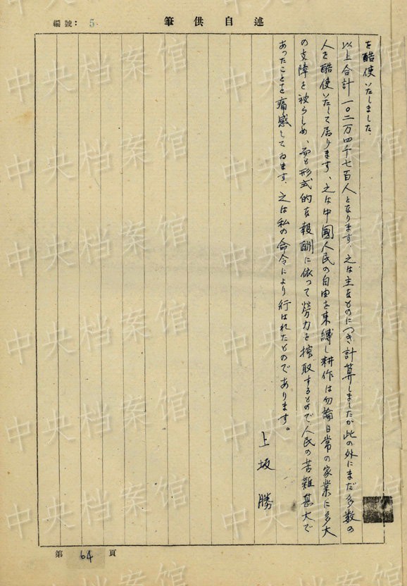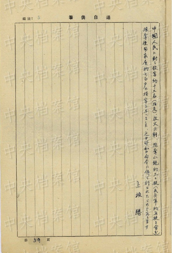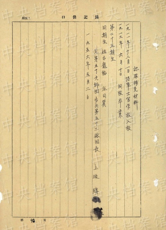 上坂勝の1954年7月の供述書によると、上坂は1892年大分県生まれ。1934年3月~1941年11月、臺灣で歩兵連隊の副隊長、大隊長を務(wù)め、階級は少佐、中佐。1945年6月に陸軍第五十九師団歩兵第五十三旅団長に任じられた。同年8月20日、朝鮮?咸興付近でソ連軍の俘虜となった。