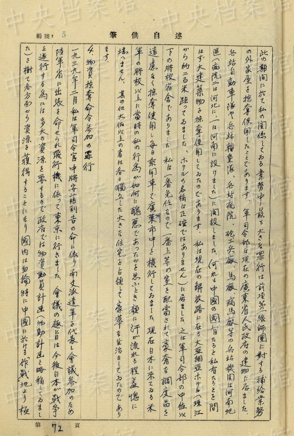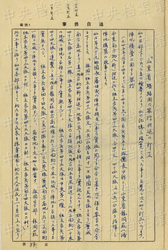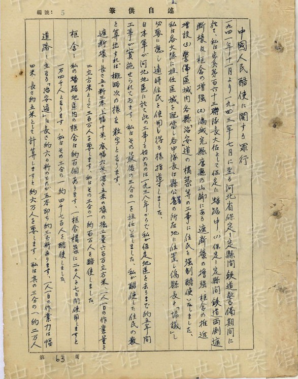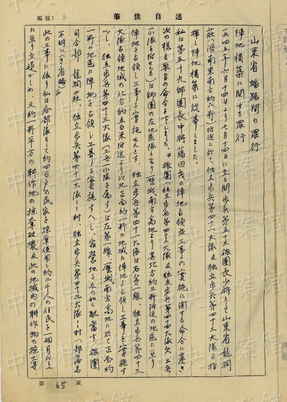 1942年5月27日、冀中作戦で「私は此の戰(zhàn)鬥に於て第一大隊をして八路軍及住民を殺害すること約八百人に上り」、「赤筒及緑筒の毒瓦斯を使用し機(jī)関銃の掃射と相俟って八路軍戰(zhàn)士のみならず逃げ迷ふ住民をも射殺しました、又部落內(nèi)を『掃蕩』し多數(shù)の住民が遁入せる地下壕內(nèi)に毒瓦斯赤筒、緑筒を投入して窒息せしめ或は苦痛のため飛び出す住民を射殺し刺殺し斬殺する等の殘虐行為をいたしました」?!复摔吻致宰鲬?zhàn)に於て聯(lián)隊が中國人民に與えた損害は殺人約一千一百名に及び家屋の破壊約十軒、焼失家屋約三軒、掠奪使用家屋約四五〇軒(約十日間)其の他中國人民約二四〇名を框舎構(gòu)築(八個)のため酷使しました(約十日間)」。