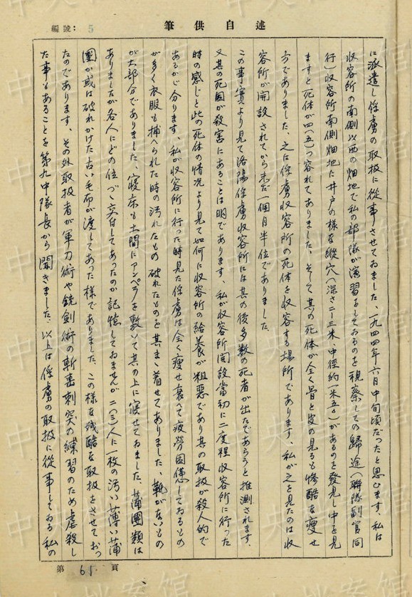 1945年6月、「此の轉(zhuǎn)進(jìn)間第一第二大隊は出發(fā)當(dāng)初より俘虜(約五十名位はあったと思ひます)を同行してゐましたが豆腐店南方地區(qū)で愈々前進(jìn)困難となりましたので私は各部隊に『邪魔になる俘虜は殺害し我方の戦死者は指を切り取り持ち歸るべし』と命じました」「俘虜は全部殺害したとの報告がありました」。(編集NA)