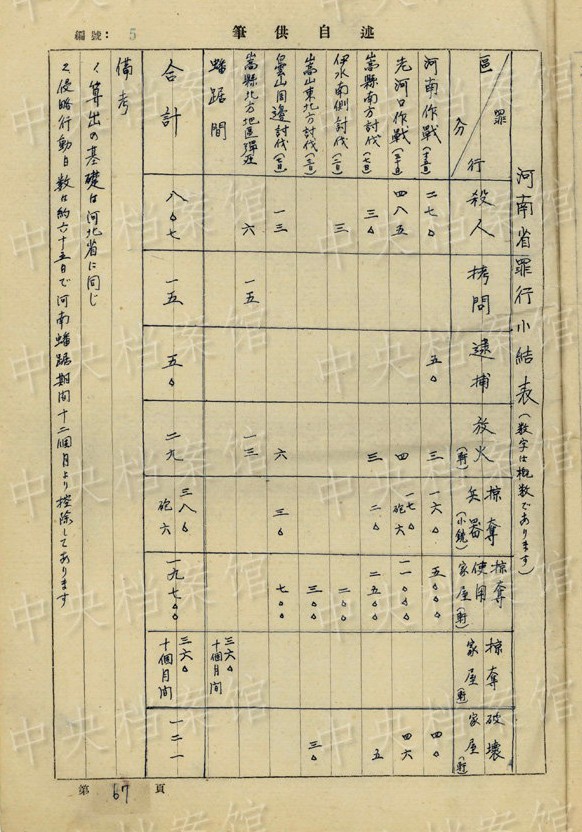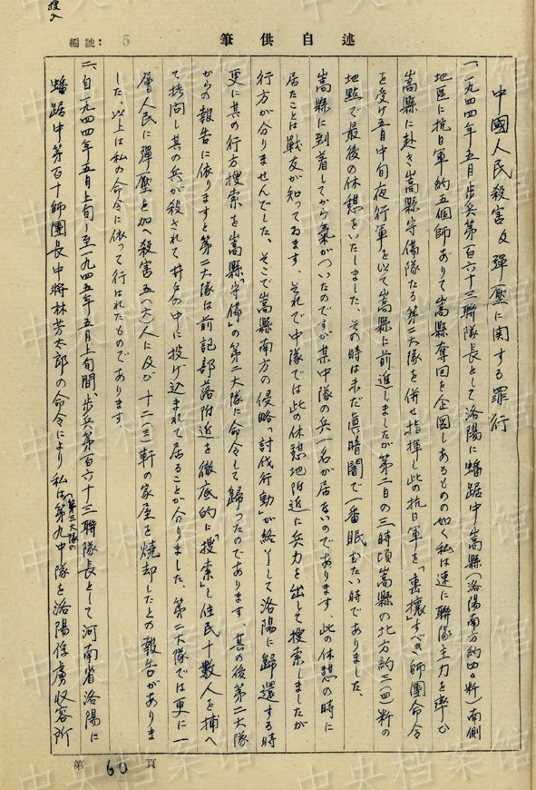 1944年5月、河南省嵩県で兵士一人が行方不明になったために「住民十?dāng)?shù)人を捕へて」「殺害五(六)人に及び十二(三)軒の家屋を焼卻したとの報告がありました」。