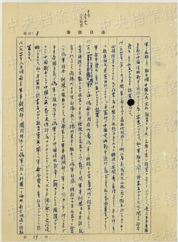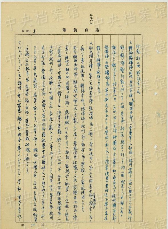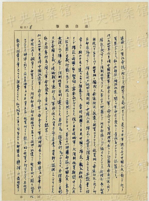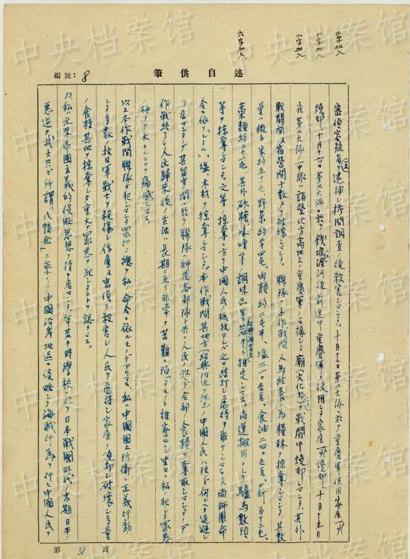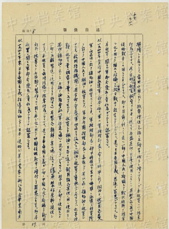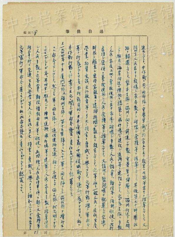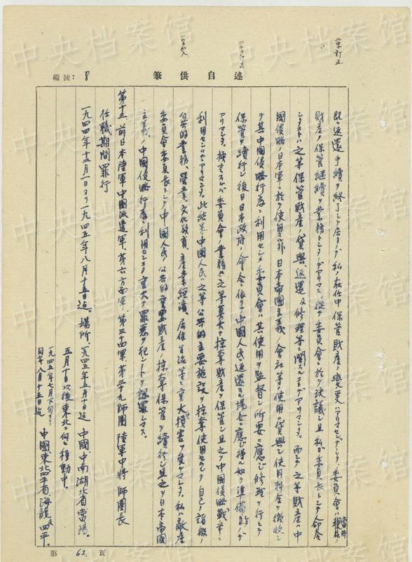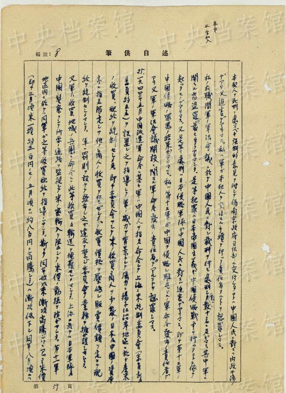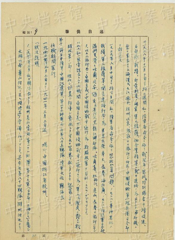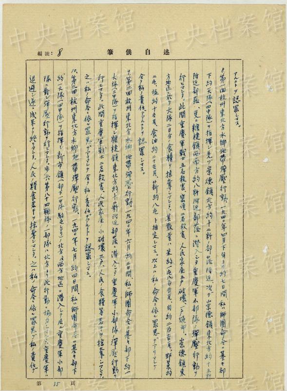 1940年8月、浙江省莫干山で「私ノ部下大隊(duì)ハ戰(zhàn)闘間毒瓦斯(緑筒)ヲ使用シテ重慶軍戰(zhàn)士ニ大ナル損害ヲ與ヘマシタ」。10月、浙江省諸曁で「重慶軍戰(zhàn)士約六百名ヲ殺害シマシタ。此中ニハ戰(zhàn)闘中重傷者及俘虜戰(zhàn)士殺害推定約四十名ヲ含ミマス。此罪悪ハ私ガ平素之等俘虜ヲ殺害スベキコトヲ教育シタ結(jié)果デアリマス。又各大隊(duì)ハ戰(zhàn)闘間毒瓦斯(緑筒)ヲ使用イ重慶軍戰(zhàn)士ニ大ナル損害ヲ與ヘマシタ」。