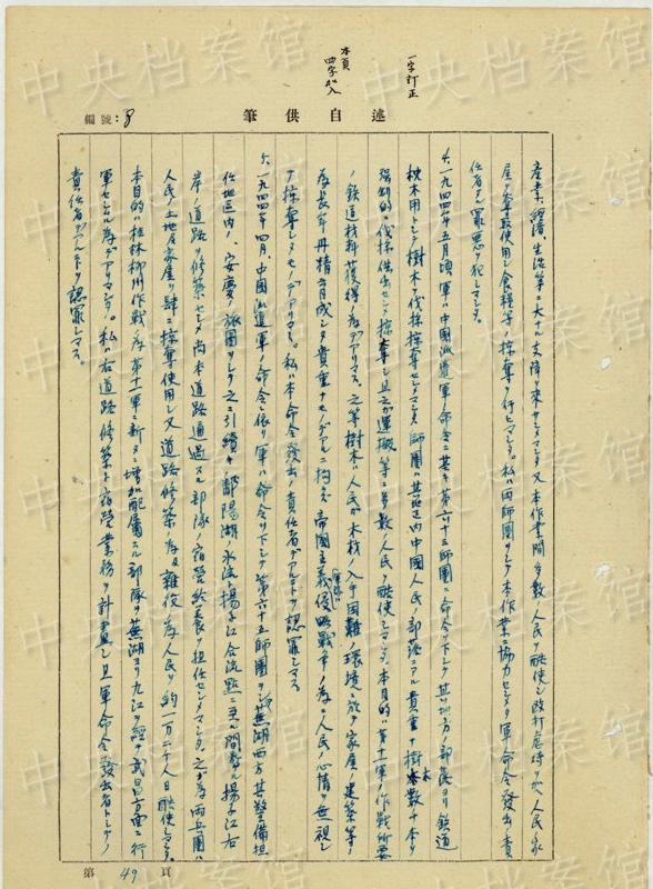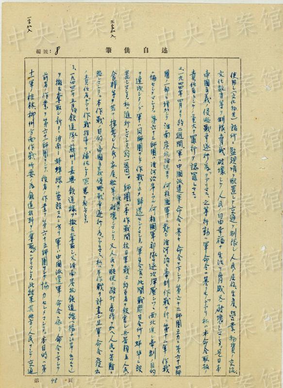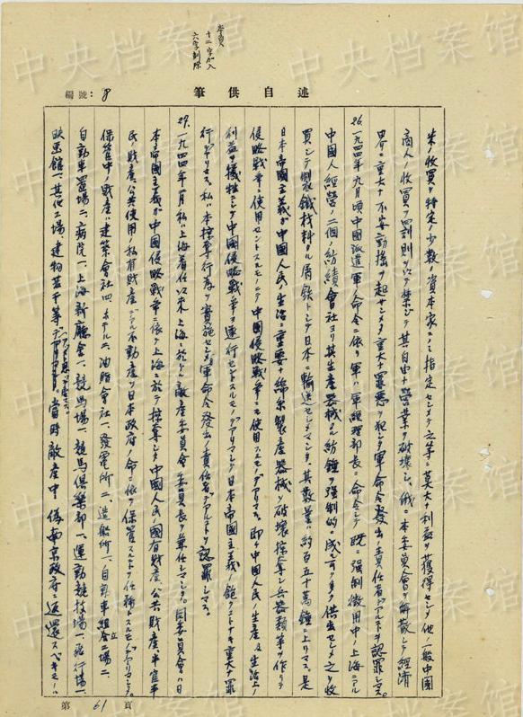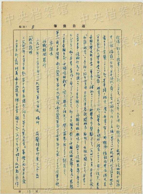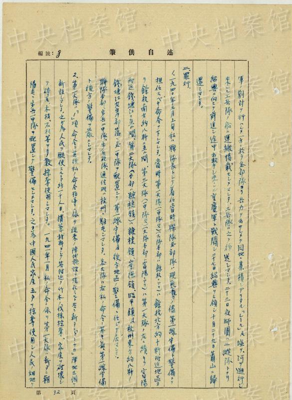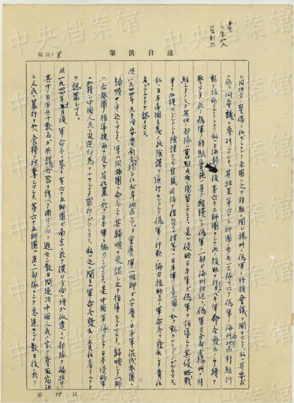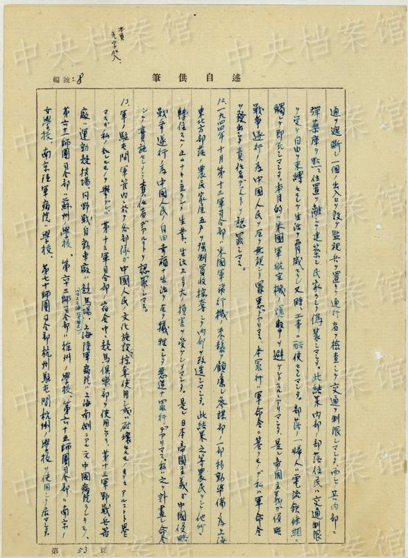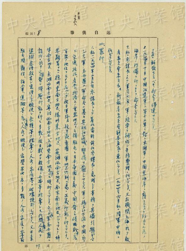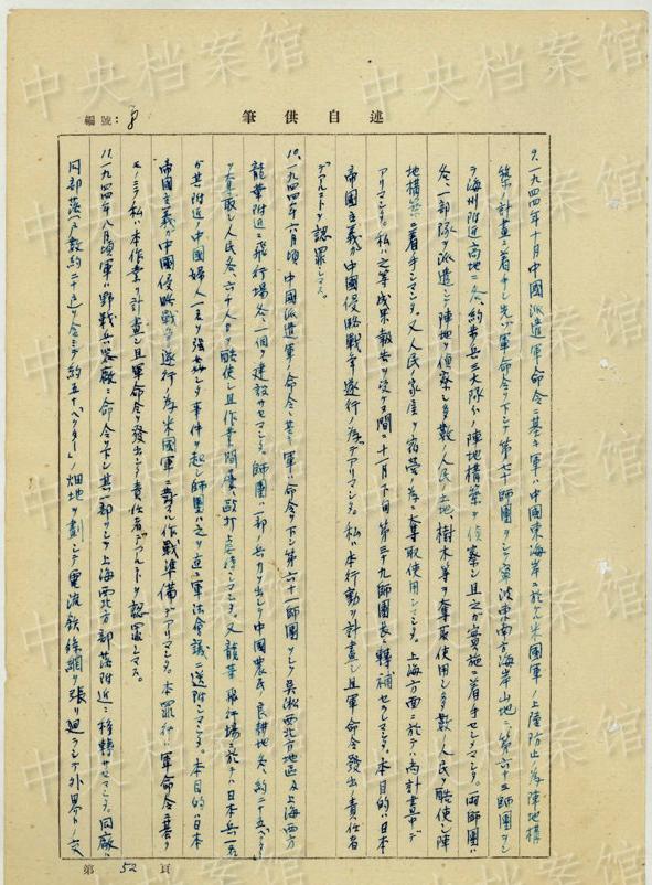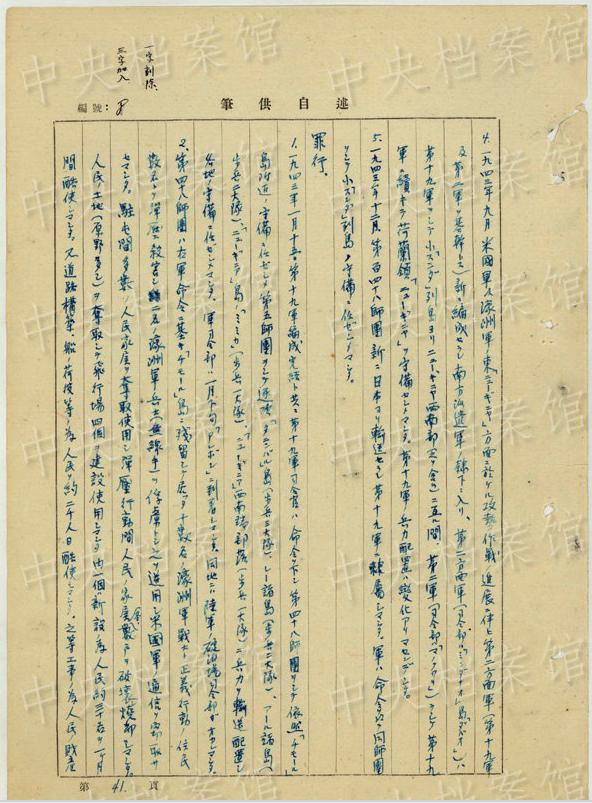 1940年8月、浙江省莫干山で「私ノ部下大隊(duì)ハ戰(zhàn)闘間毒瓦斯(緑筒)ヲ使用シテ重慶軍戰(zhàn)士ニ大ナル損害ヲ與ヘマシタ」。10月、浙江省諸曁で「重慶軍戰(zhàn)士約六百名ヲ殺害シマシタ。此中ニハ戰(zhàn)闘中重傷者及俘虜戰(zhàn)士殺害推定約四十名ヲ含ミマス。此罪悪ハ私ガ平素之等俘虜ヲ殺害スベキコトヲ教育シタ結(jié)果デアリマス。又各大隊(duì)ハ戰(zhàn)闘間毒瓦斯(緑筒)ヲ使用イ重慶軍戰(zhàn)士ニ大ナル損害ヲ與ヘマシタ」。