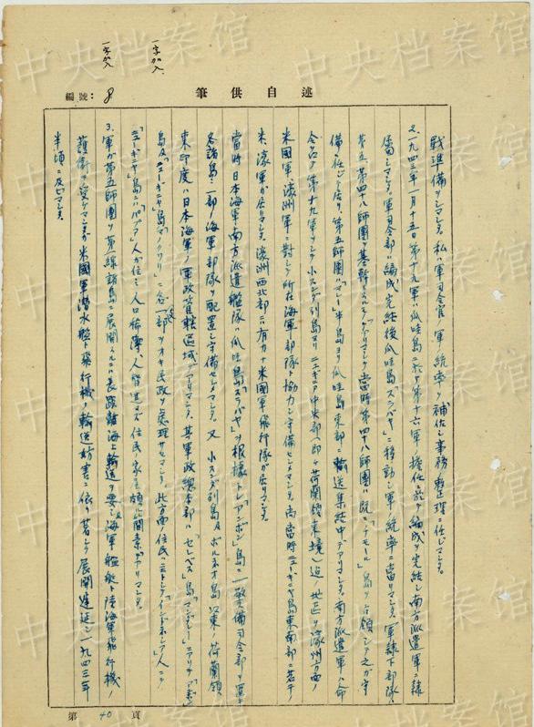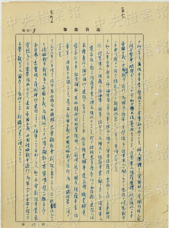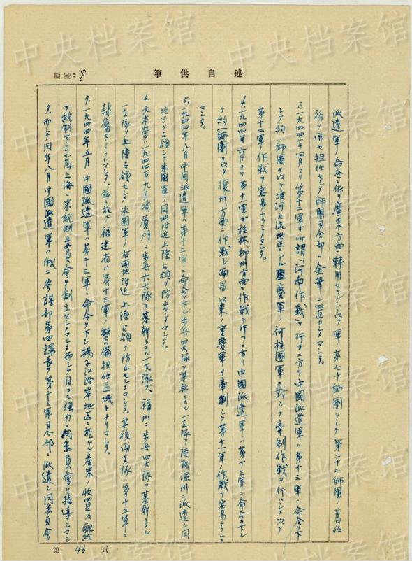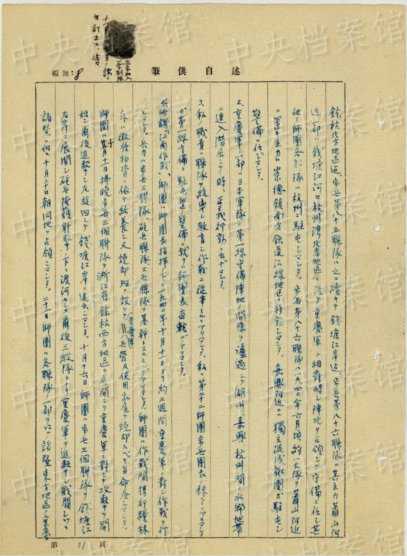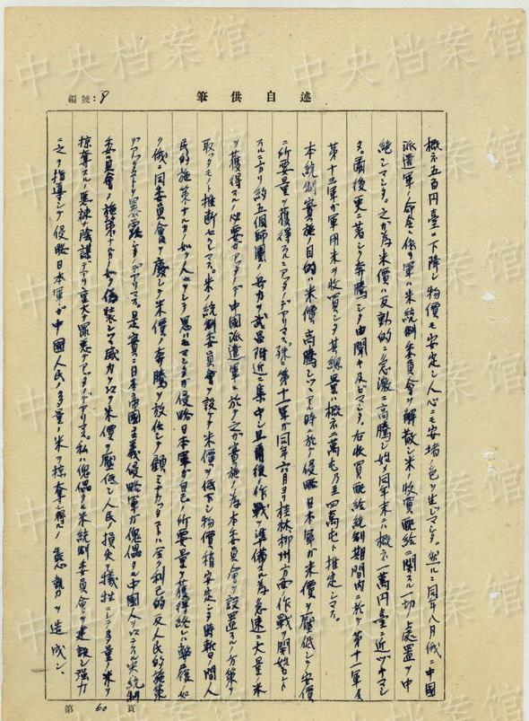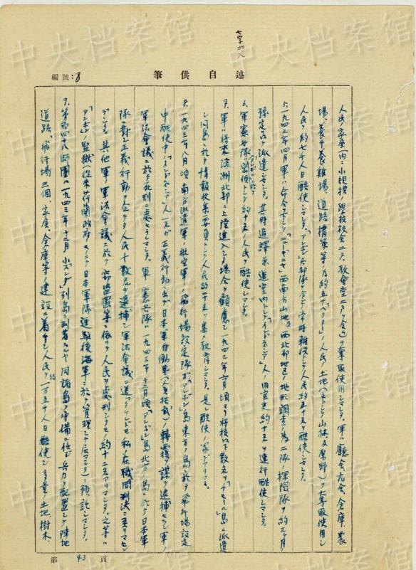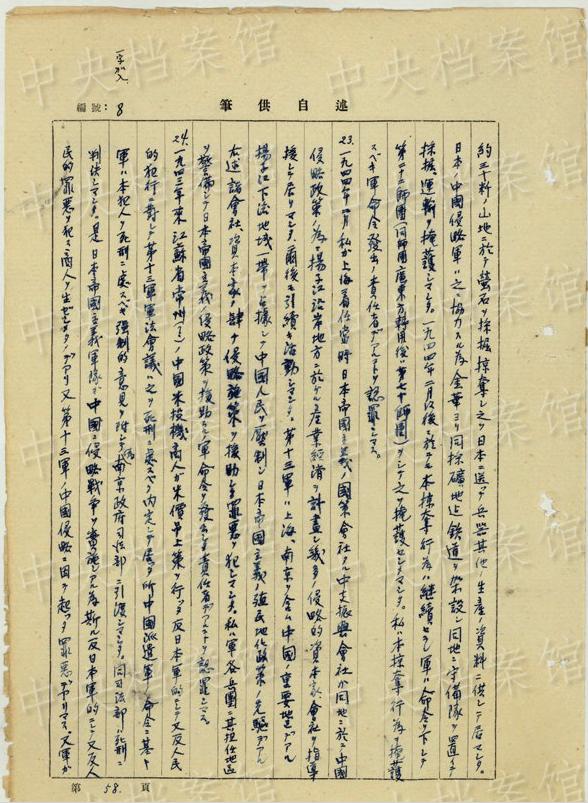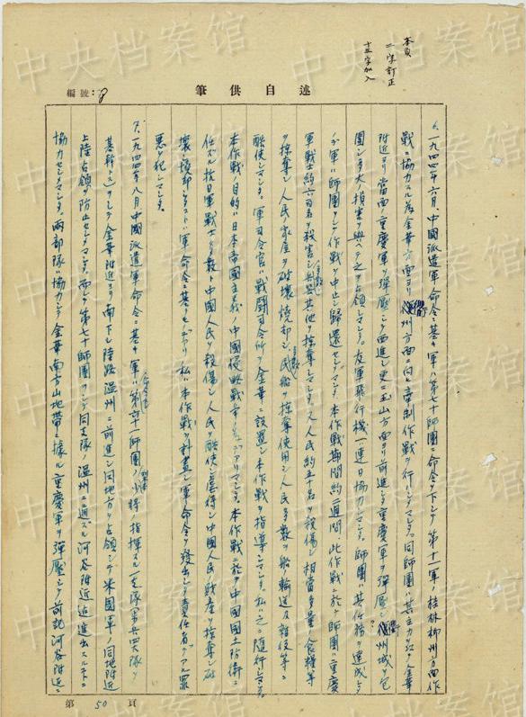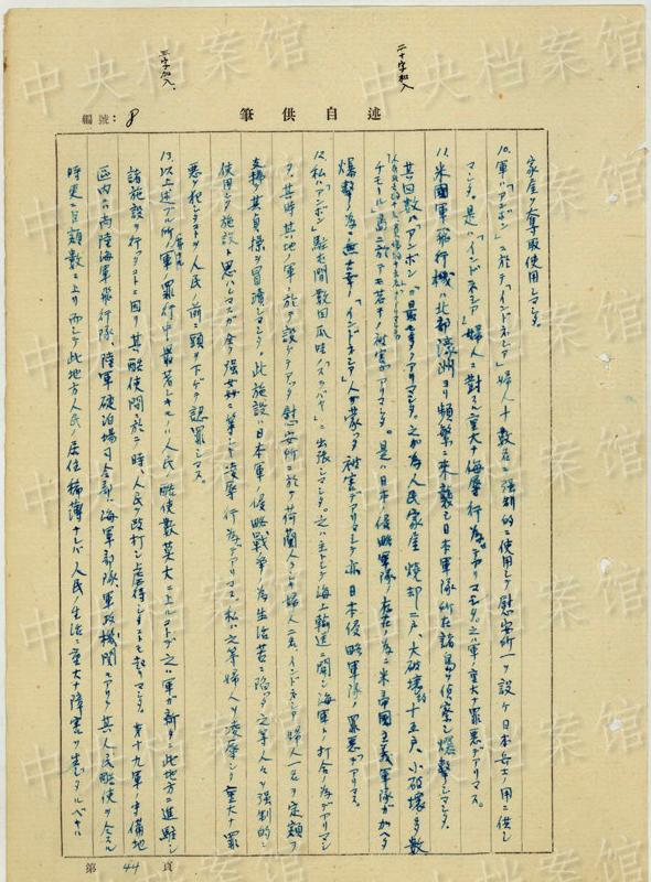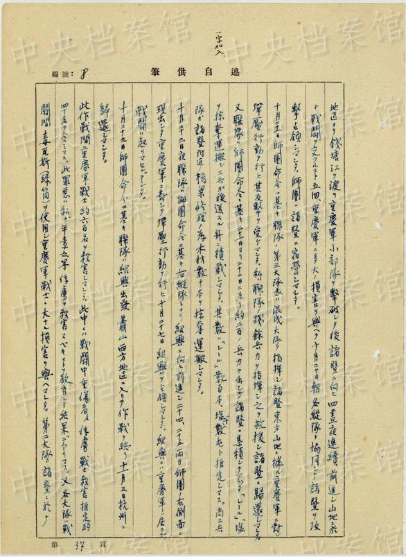 1940年8月、浙江省莫干山で「私ノ部下大隊(duì)ハ戰(zhàn)闘間毒瓦斯(緑筒)ヲ使用シテ重慶軍戰(zhàn)士ニ大ナル損害ヲ與ヘマシタ」。10月、浙江省諸曁で「重慶軍戰(zhàn)士約六百名ヲ殺害シマシタ。此中ニハ戰(zhàn)闘中重傷者及俘虜戰(zhàn)士殺害推定約四十名ヲ含ミマス。此罪悪ハ私ガ平素之等俘虜ヲ殺害スベキコトヲ教育シタ結(jié)果デアリマス。又各大隊(duì)ハ戰(zhàn)闘間毒瓦斯(緑筒)ヲ使用イ重慶軍戰(zhàn)士ニ大ナル損害ヲ與ヘマシタ」。