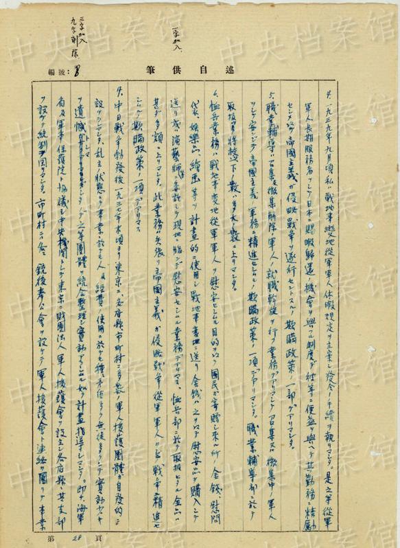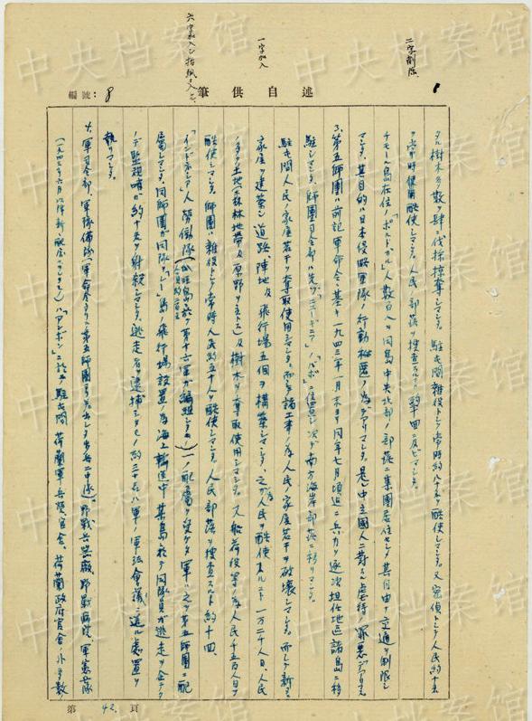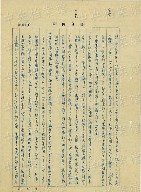 1932年10月、「佳木斯駐屯間密偵容疑者トシテ中國人民約三十名ヲ逮捕シマシタ」?!竷?nèi)抗日戰(zhàn)士十五名、人民六名ヲ拷問ノ上殺害シマシタ」?!讣涯舅箹|北方約十粁ノ部落ニ於テ」「戰(zhàn)場ノ部落ノ人民ニ與ヘタ損害、私ノ命令ニ依ル殺害五名」。