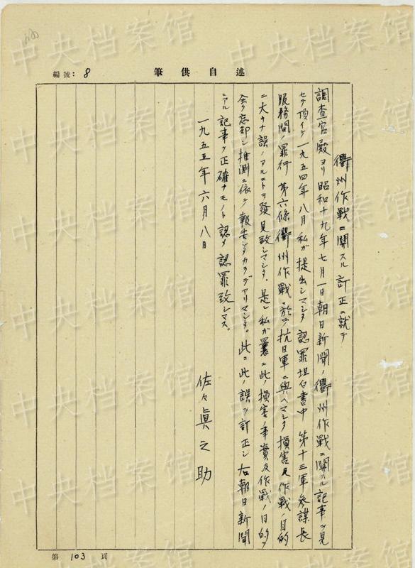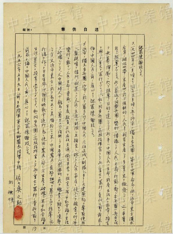 佐々眞之助は1932年から中國侵略戦爭に參加。供述によると計(jì)5回、5年の長きにわたり中國侵略戦爭に參加し、その範(fàn)囲は北は東北部、南は揚(yáng)子江に至る。犯した罪行は「滔天」と形容できる。佐々眞の法廷での供述によると、彼と部下はかつて捕えた中國平民を針金で數(shù)珠繋ぎにして殺害した。捕えた中國人を針金で縛って川に投げ込み溺死させた。生きている中國人を毒ガス室に入れて実験した。中國人女性數(shù)十人を強(qiáng)姦した。湖北省襄樊の戦いで重慶軍3500人を殺害した。