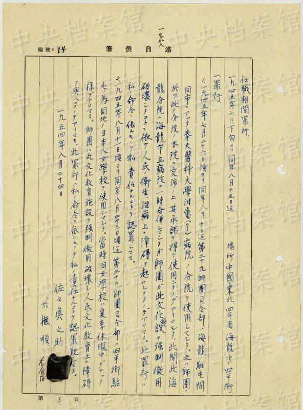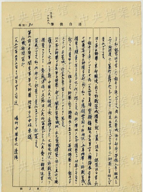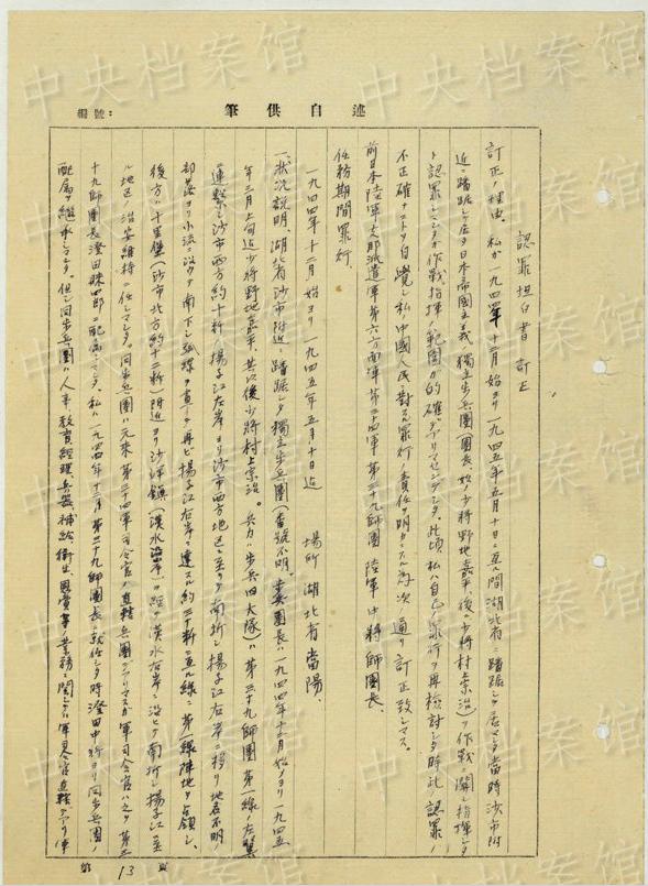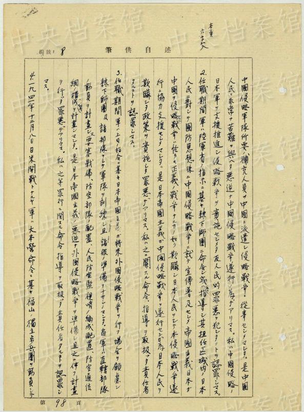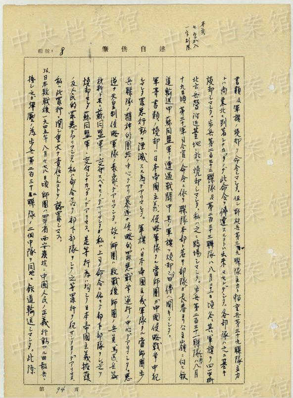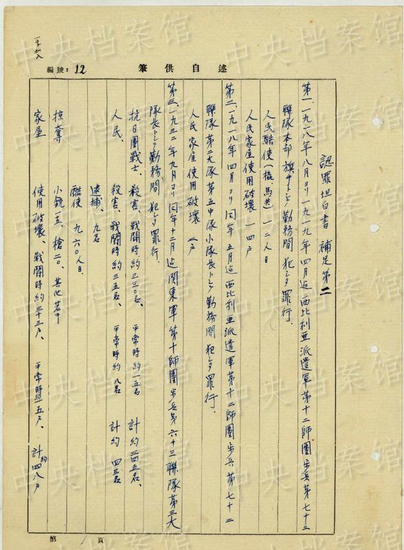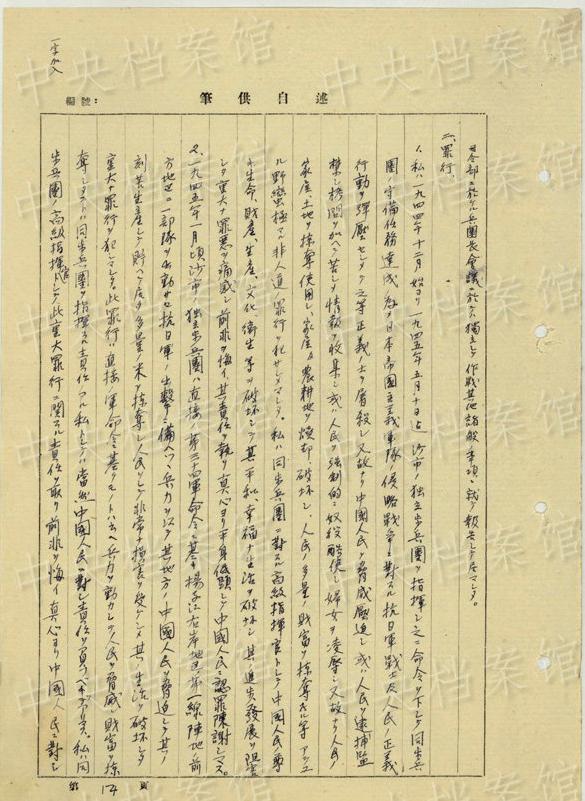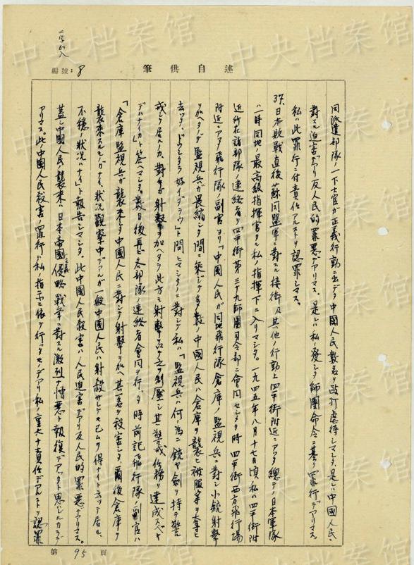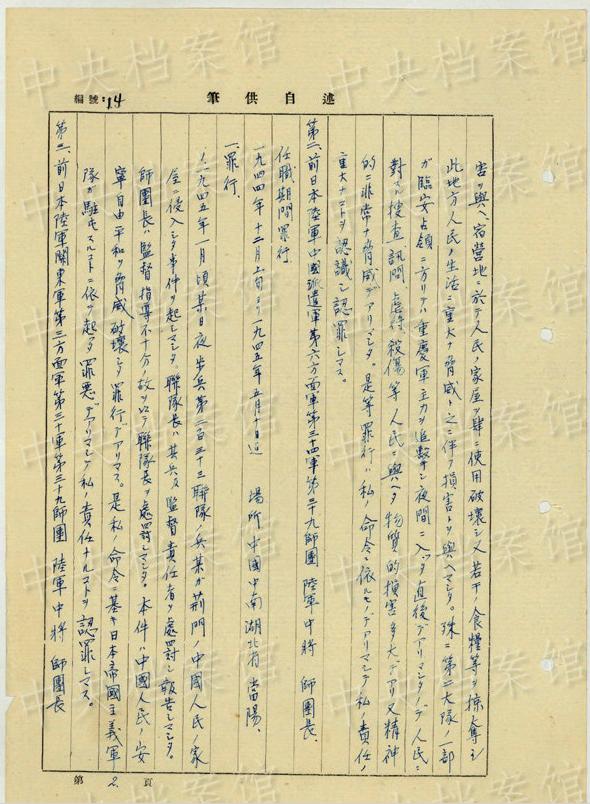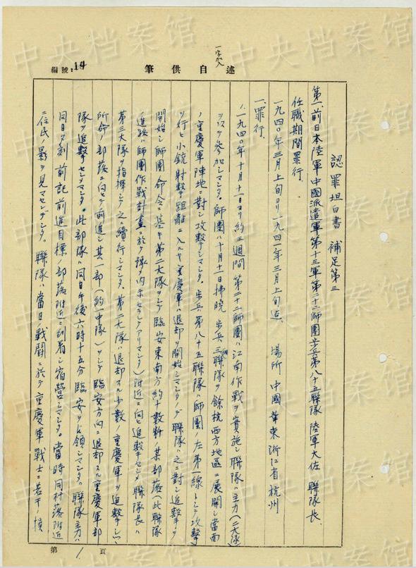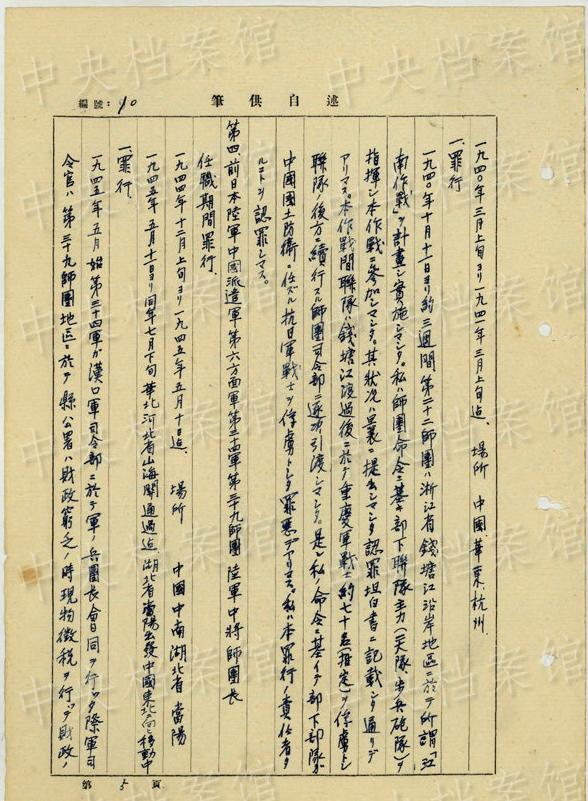 1940年8月、浙江省莫干山で「私ノ部下大隊(duì)ハ戰(zhàn)闘間毒瓦斯(緑筒)ヲ使用シテ重慶軍戰(zhàn)士ニ大ナル損害ヲ與ヘマシタ」。10月、浙江省諸曁で「重慶軍戰(zhàn)士約六百名ヲ殺害シマシタ。此中ニハ戰(zhàn)闘中重傷者及俘虜戰(zhàn)士殺害推定約四十名ヲ含ミマス。此罪悪ハ私ガ平素之等俘虜ヲ殺害スベキコトヲ教育シタ結(jié)果デアリマス。又各大隊(duì)ハ戰(zhàn)闘間毒瓦斯(緑筒)ヲ使用イ重慶軍戰(zhàn)士ニ大ナル損害ヲ與ヘマシタ」。