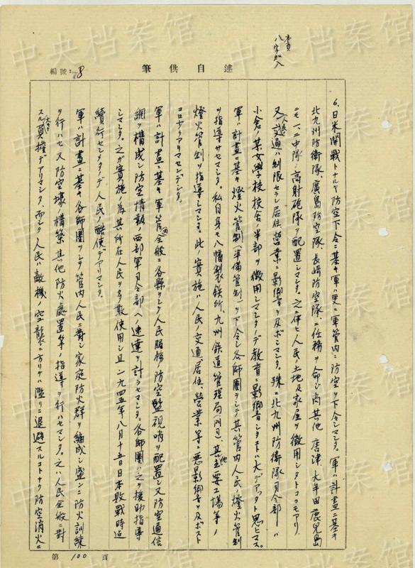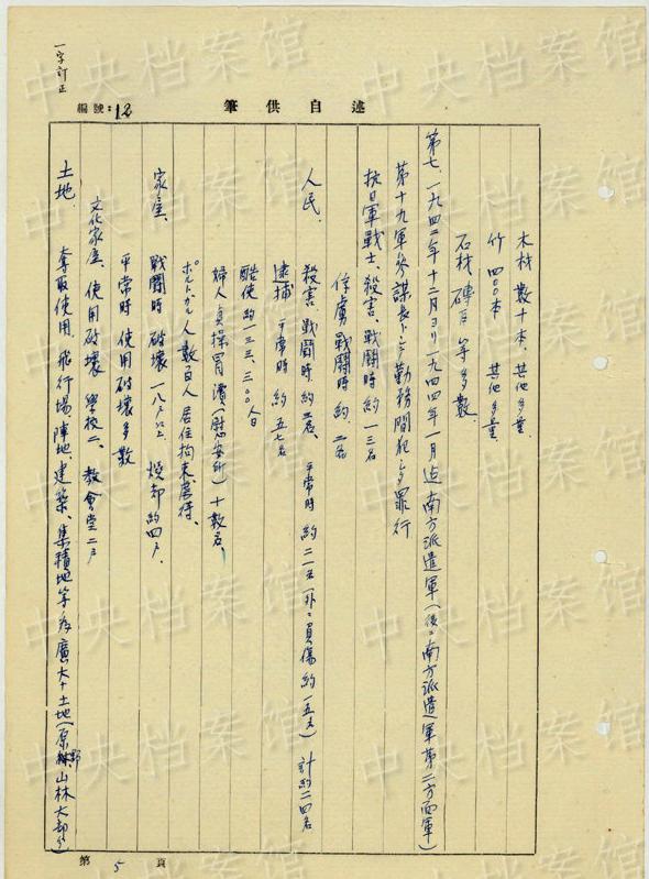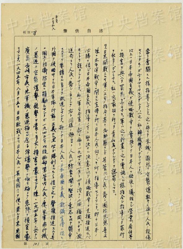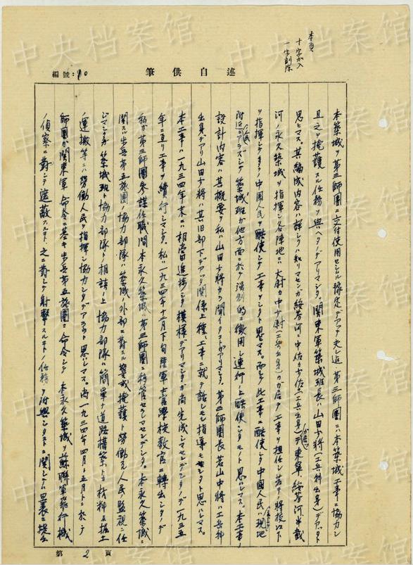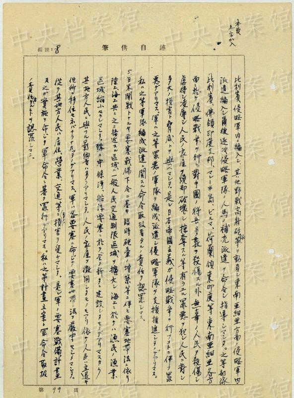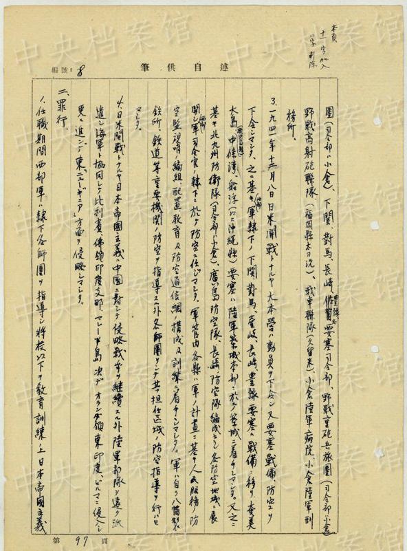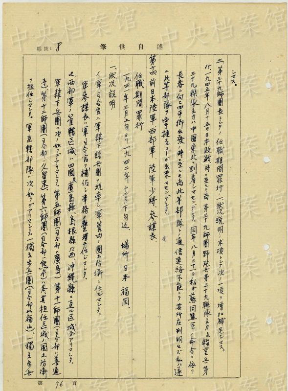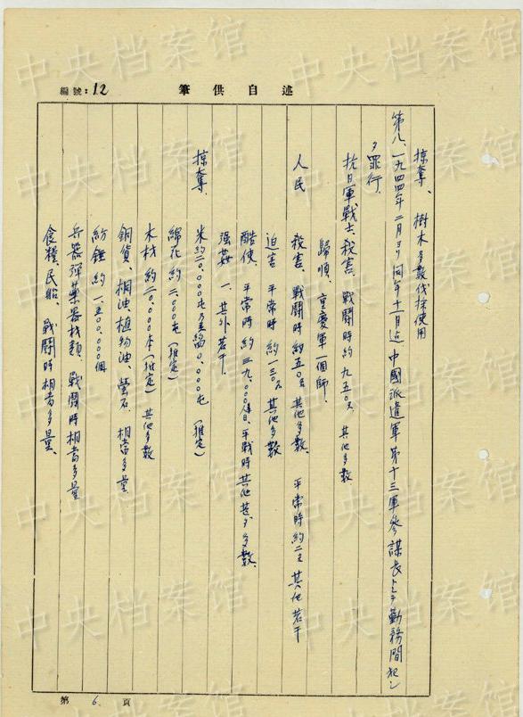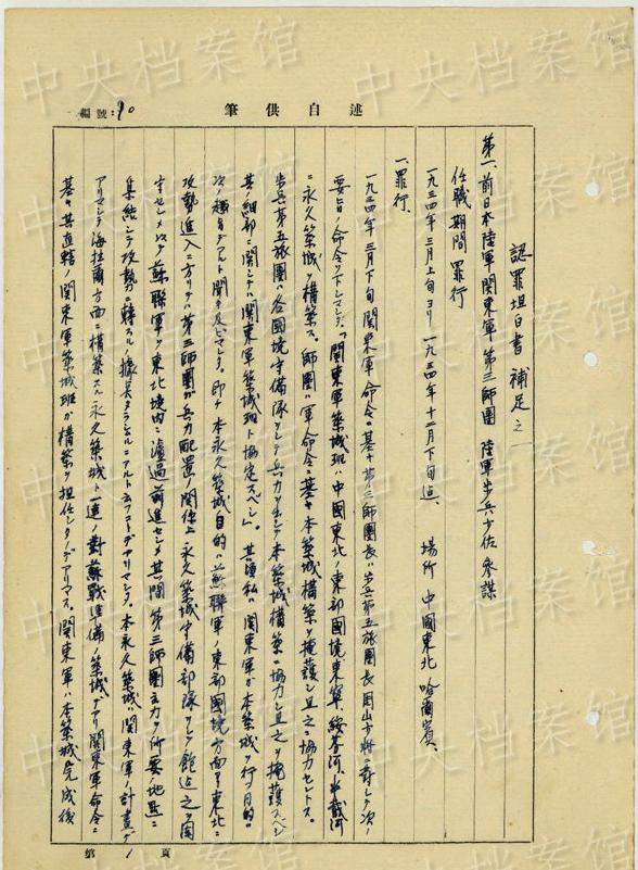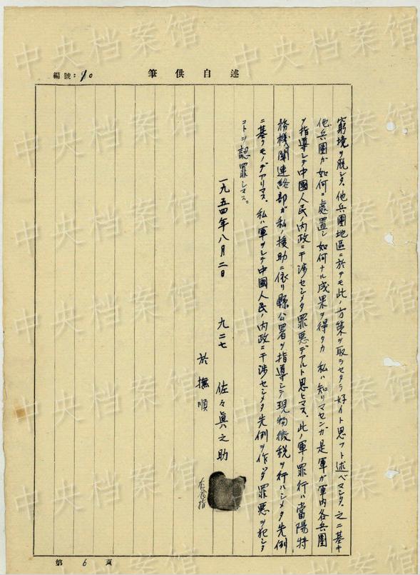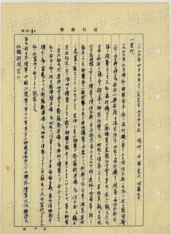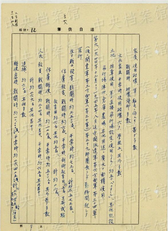 1940年8月、浙江省莫干山で「私ノ部下大隊(duì)ハ戰(zhàn)闘間毒瓦斯(緑筒)ヲ使用シテ重慶軍戰(zhàn)士ニ大ナル損害ヲ與ヘマシタ」。10月、浙江省諸曁で「重慶軍戰(zhàn)士約六百名ヲ殺害シマシタ。此中ニハ戰(zhàn)闘中重傷者及俘虜戰(zhàn)士殺害推定約四十名ヲ含ミマス。此罪悪ハ私ガ平素之等俘虜ヲ殺害スベキコトヲ教育シタ結(jié)果デアリマス。又各大隊(duì)ハ戰(zhàn)闘間毒瓦斯(緑筒)ヲ使用イ重慶軍戰(zhàn)士ニ大ナル損害ヲ與ヘマシタ」。