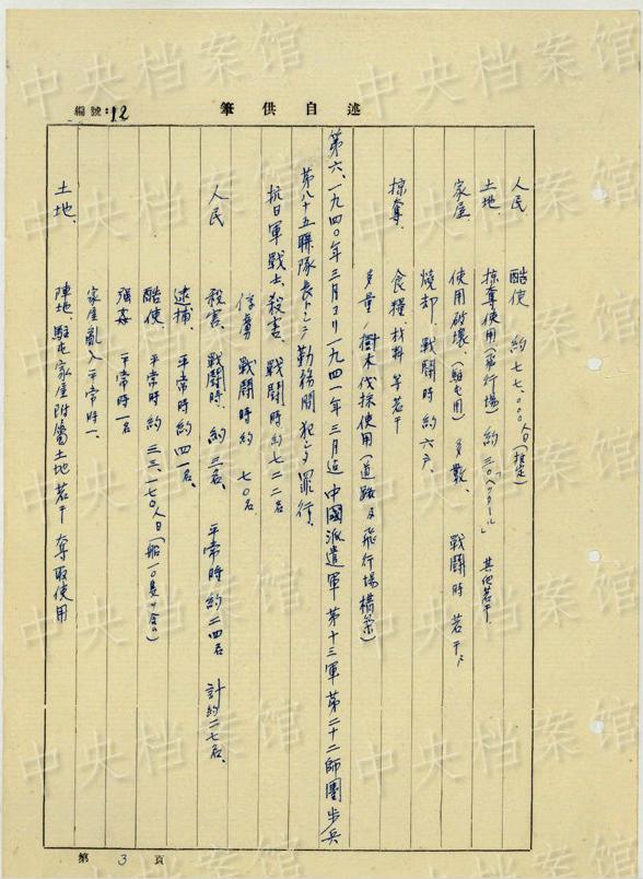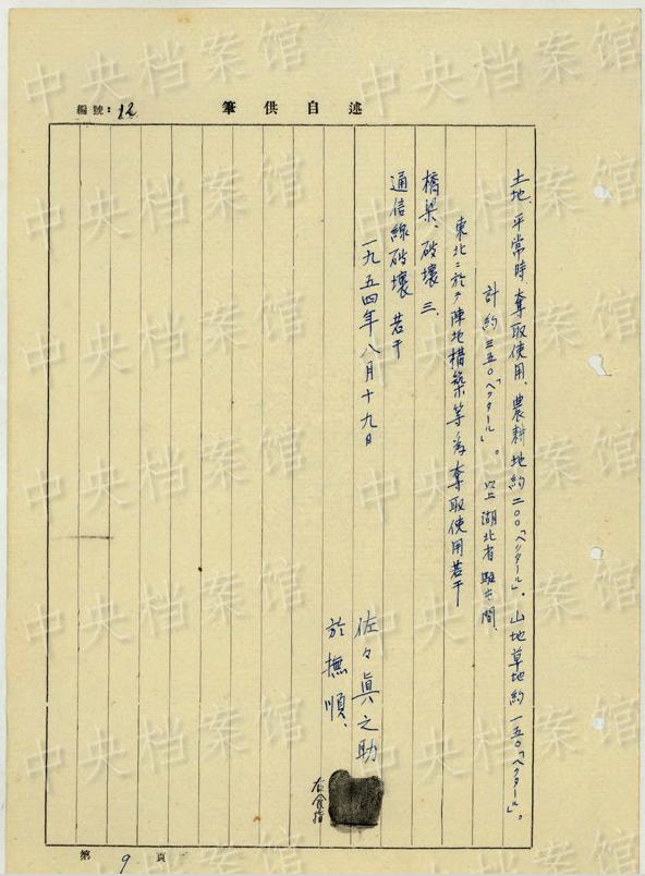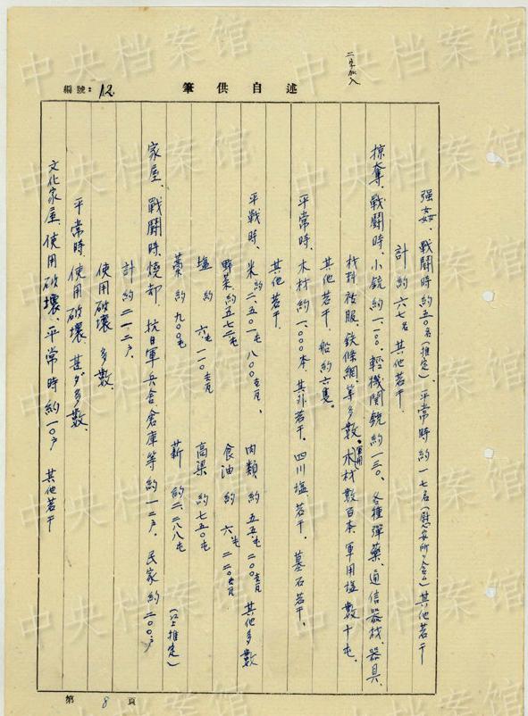 1932年10月、「佳木斯駐屯間密偵容疑者トシテ中國人民約三十名ヲ逮捕シマシタ」?!竷?nèi)抗日戰(zhàn)士十五名、人民六名ヲ拷問ノ上殺害シマシタ」?!讣涯舅箹|北方約十粁ノ部落ニ於テ」「戰(zhàn)場ノ部落ノ人民ニ與ヘタ損害、私ノ命令ニ依ル殺害五名」。