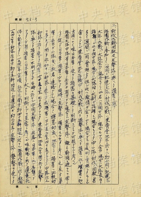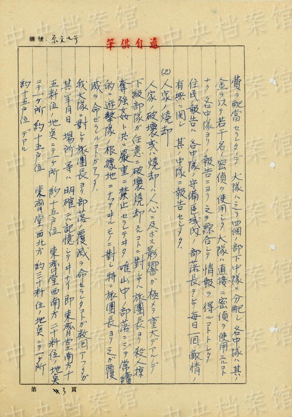 「我大隊ニ対シテ旅団長ヨリ部落ノ覆滅ヲ命セラレタコトガ數(shù)回アツタガ其年月日場所等ハ明確ニハ記憶シテヰナイ。即東斎堂南方十五粁位ノ地點ニテ一ヶ所約一五戸位、東斎堂西南方二十粁位ノ地點ニテ一ヶ所約一五戸位、東斎堂西北方約三十粁位ノ地點ニテ一ヶ所約一五戸位デアル」