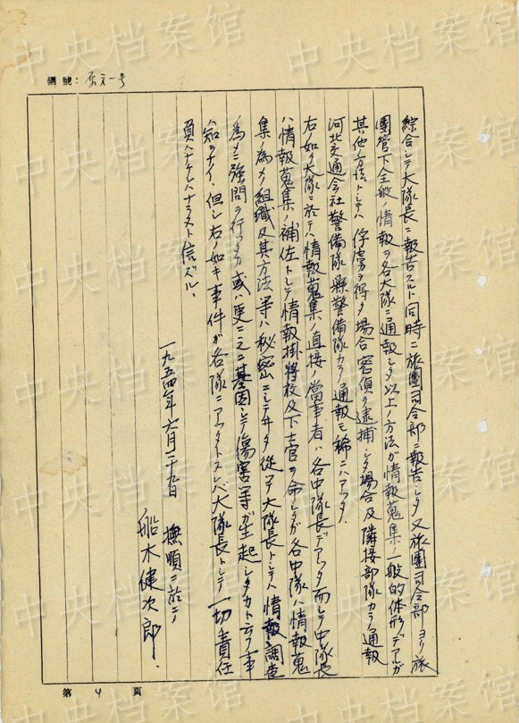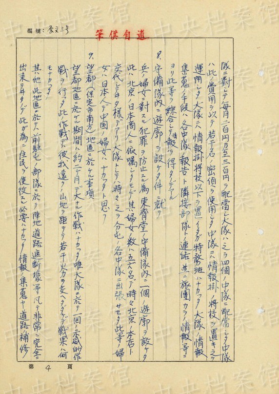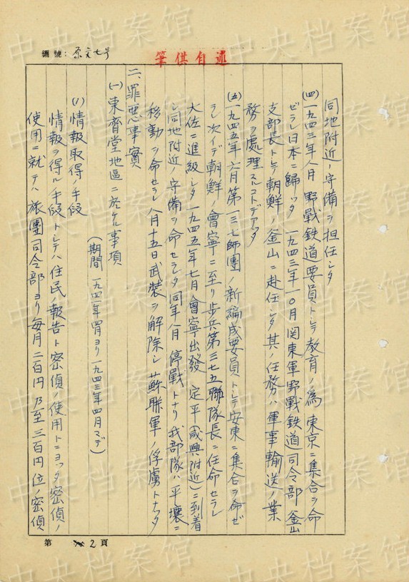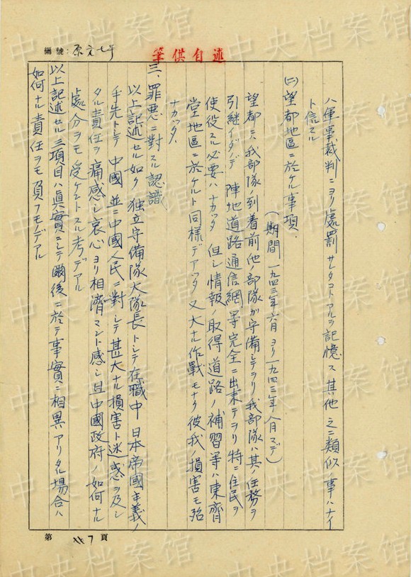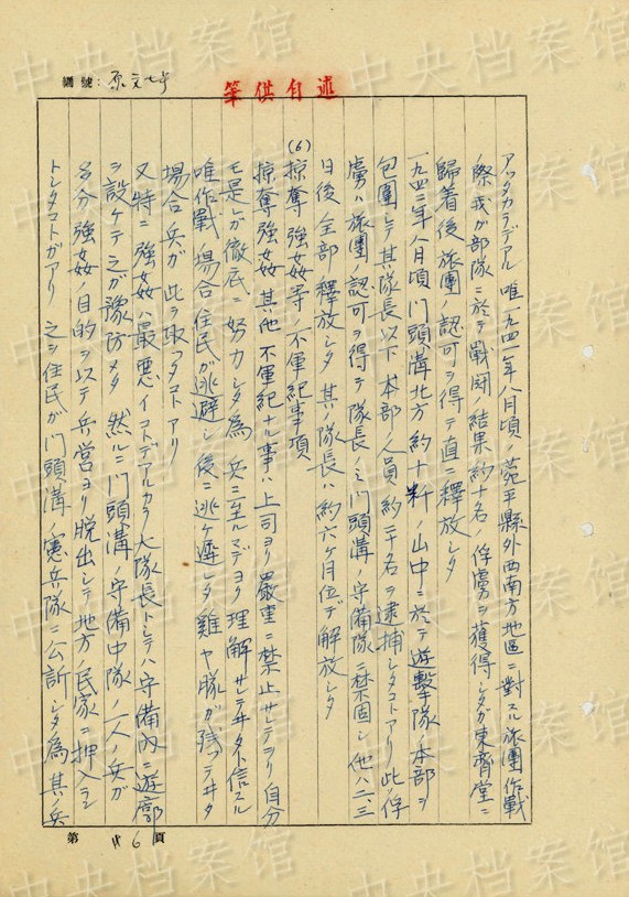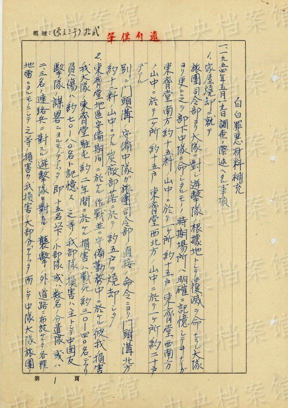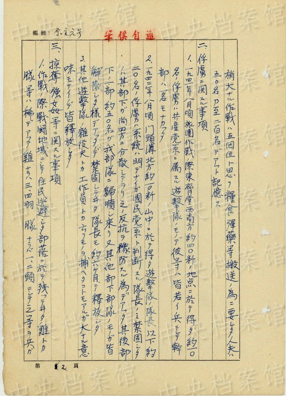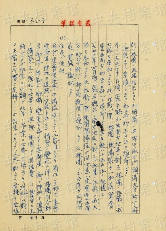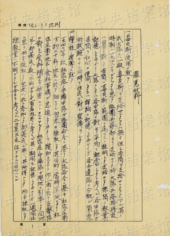 「毒瓦斯ノ使用ニ就テ。我大隊ニハ一般ノ毒瓦斯ヲ支給サレタコトハ無イ。但シ赤筒ヲ支給サレタコトハアル。其ノ時期ハ一九四ニ年デアッタト思フ。旅団兵器部ヨリ支給サレタ時、大隊兵器掛將校ハ自分ニ対シテ赤筒ハ毒瓦斯ノ範囲ニ屬セスト説明シタ。支給サレタ赤筒ノ數(shù)量ハ記憶シテヰナイ。大隊トシテハ各中隊ニ対シテ平均ニ配當(dāng)シタト考ヘル。各中隊ガ赤筒ヲ如何ニ使用シタカハ詳細ニ記憶シテヰナイ」(編集MA)