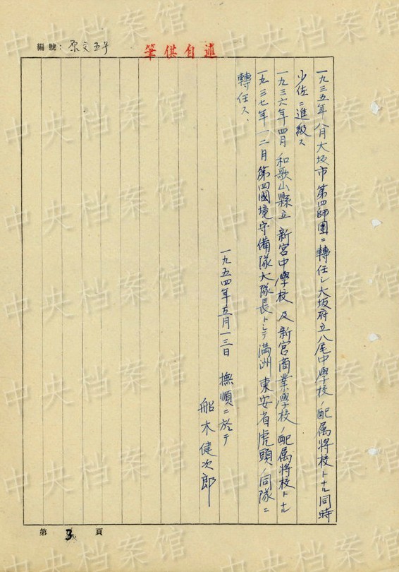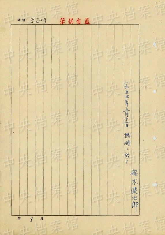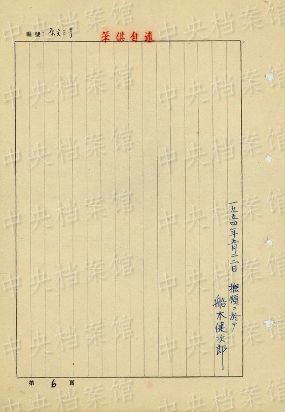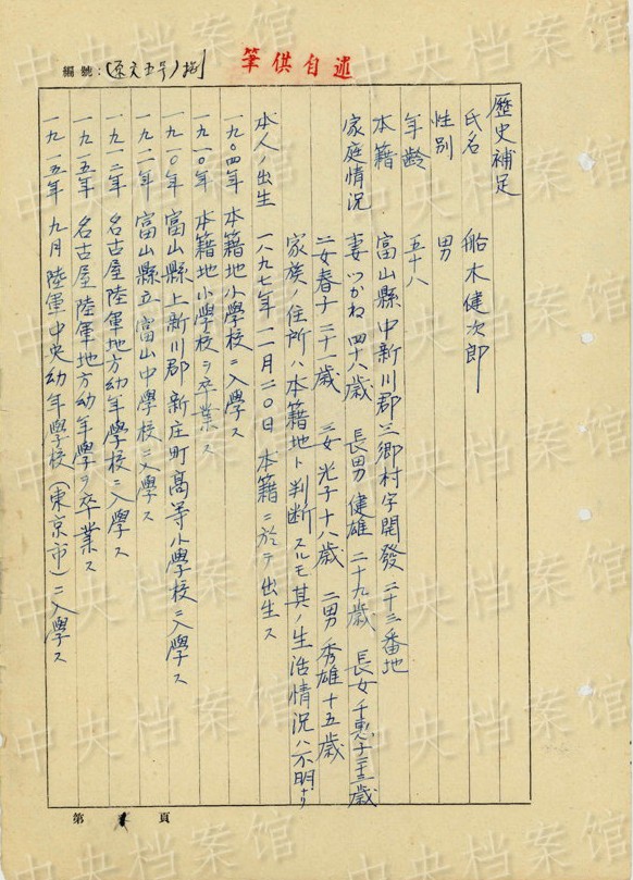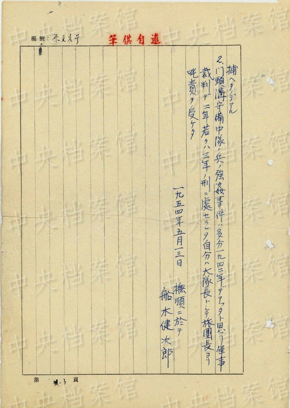 日本人戦犯?船木健次郎の1954年5月から6月の供述書によると、船木は1897年に日本の富山県に生まれ、1937年12月に中國東北部に赴き、第4國境守備隊歩兵少佐大隊長に任じられた。1943年8月に日本に帰國し、再び朝鮮に渡った。1945年6月には第137師団第375連隊大佐連隊長に任じられた。同年8月15日、ソ連赤軍の捕虜となった。