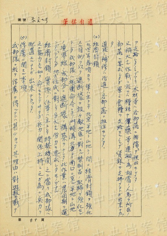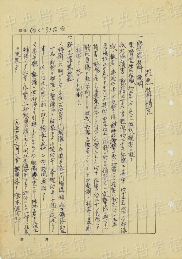 「一九四一年八月頃、宛平県外西南方地區(qū)ニ対スル旅団ノ作戦ニ我大隊モ參加シタガ此ノ作戦ノ際、旅団予備隊ガ一部落(東斎堂西南方約四十五粁)ヲ焼卻シタ。其戸數(shù)ハ一五戸位ト記憶ス」