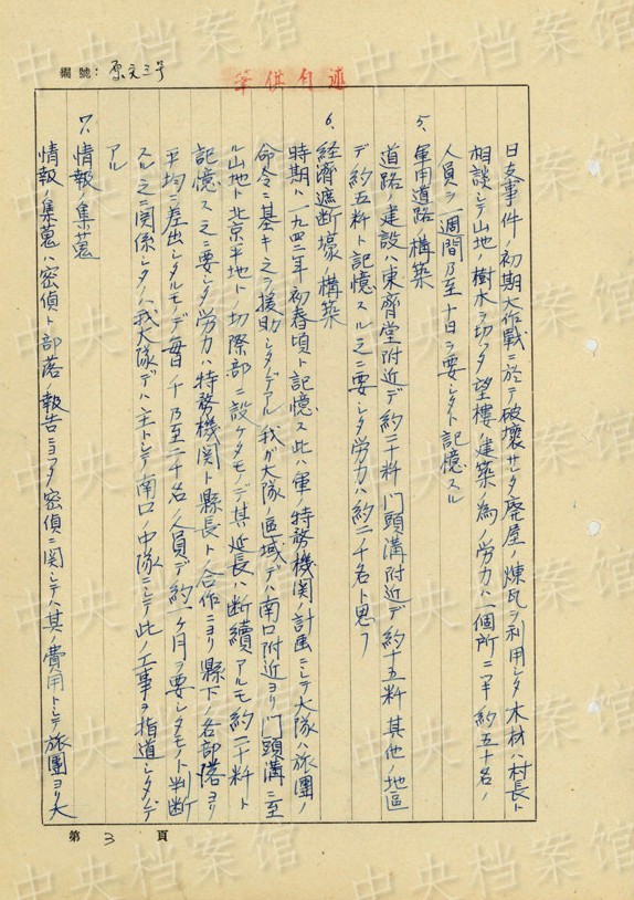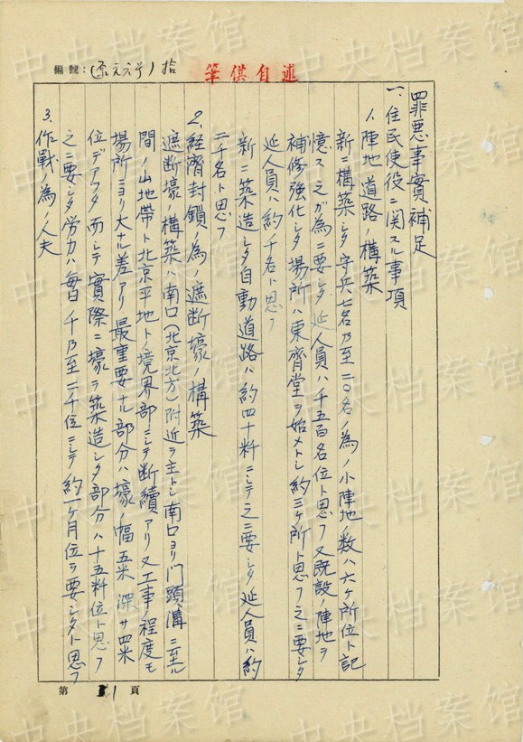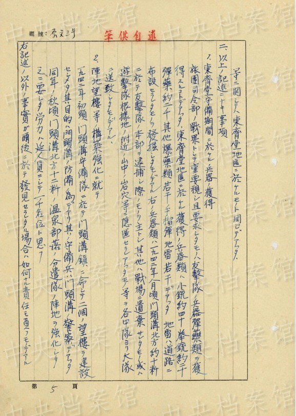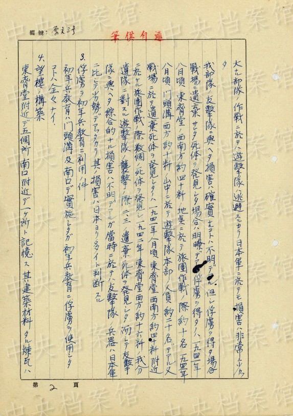 「住民使役ニ関スル事項」では、「新ニ構(gòu)築シタ守兵七名乃至二〇名ノ為ノ小陣地ノ數(shù)ハ6ヶ所位ト記憶ス。此ガ為ニ要シタ延人員ハ千五百名位ト思フ。又既設(shè)ノ陣地ヲ補修強化シタ場所ハ東斎堂ヲ始メトシテ約三ヶ所ト思フ。之ニ要シタ延人員ハ約千名ト思フ」