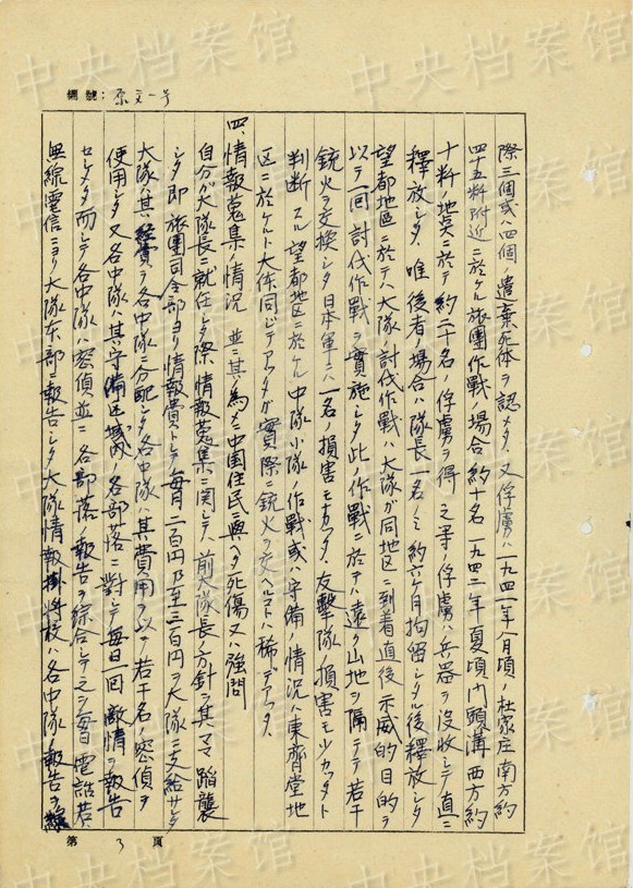 「一九四三年四月頃、宛平県外ノ南方地區(qū)ニ対スル旅団ノ作戦ニ我大隊モ參加シタガ此ノ作戦ノ際、旅団予備隊ガ同地區(qū)(東斎堂西南方約六十粁)ノ部落數(shù)個ヲ焼卻シタ」