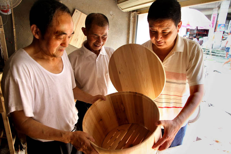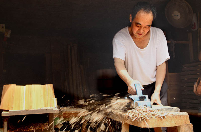 今年65歳になる余興華さんは18歳から円木大工の技法を?qū)Wび始め、江西省靖安県雙溪鎮(zhèn)で數(shù)十年にわたり円木技法で製作を続け、円木技法の興亡を見(jiàn)つめてきた。余さんによると、1970年代から同80年代が円木技法や円木による器具の全盛期で、同90年代に入るとプラスチックや鉄、ステンレスといった材質(zhì)の発展や普及、また現(xiàn)代的な機(jī)械が木製品生産で広く使われるようになったことから、円木器具の市場(chǎng)は縮小し続け、伝統(tǒng)的な円木技法も徐々に人々の日常生活から姿を消していった。(編集YH)
