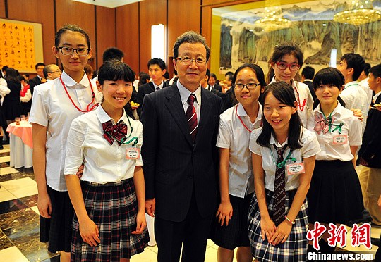 | 両國(guó)の中高生と記念撮影する程永華?駐日中國(guó)大使(緑のストラップをつけているのが日本人生徒、赤色のストラップをつけているのが中國(guó)人生徒) |