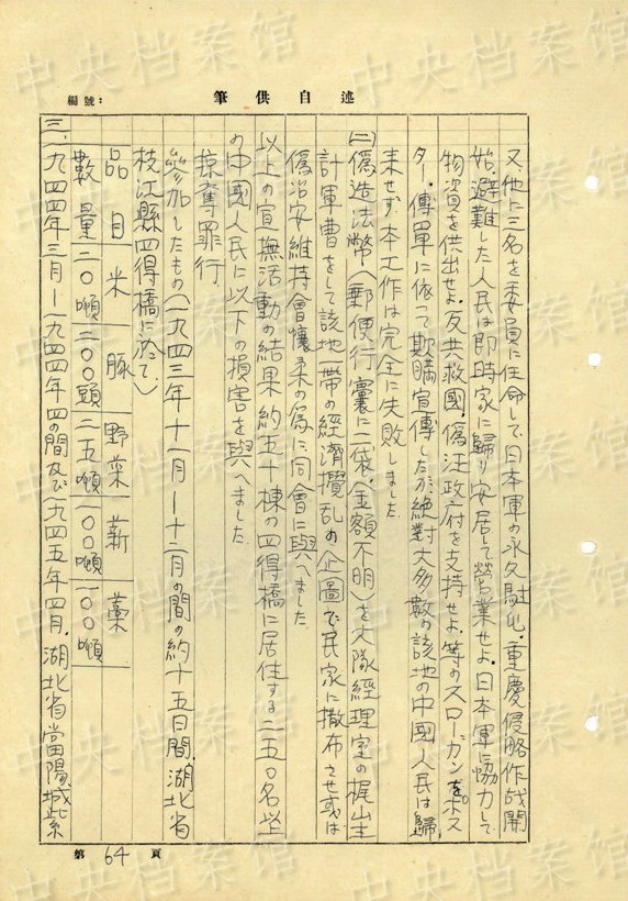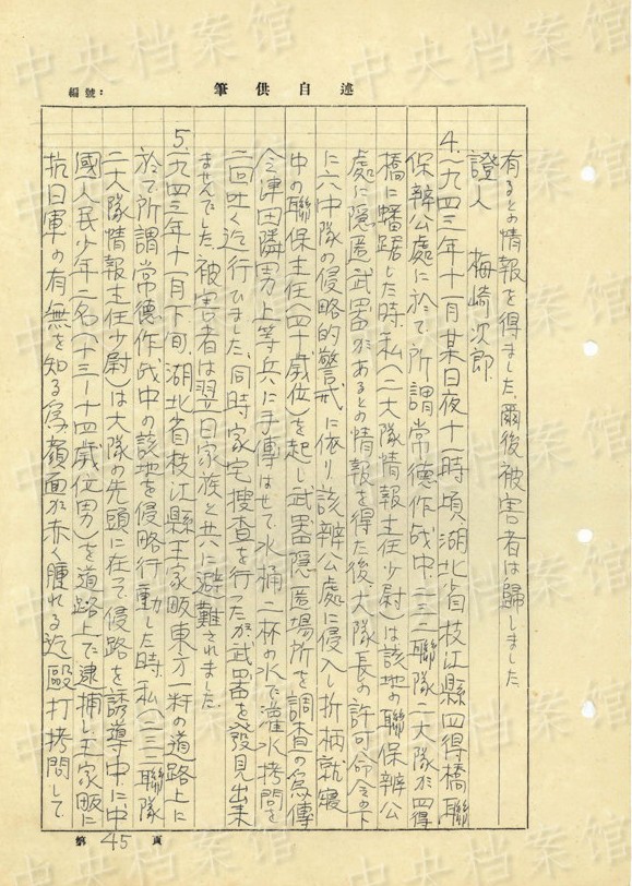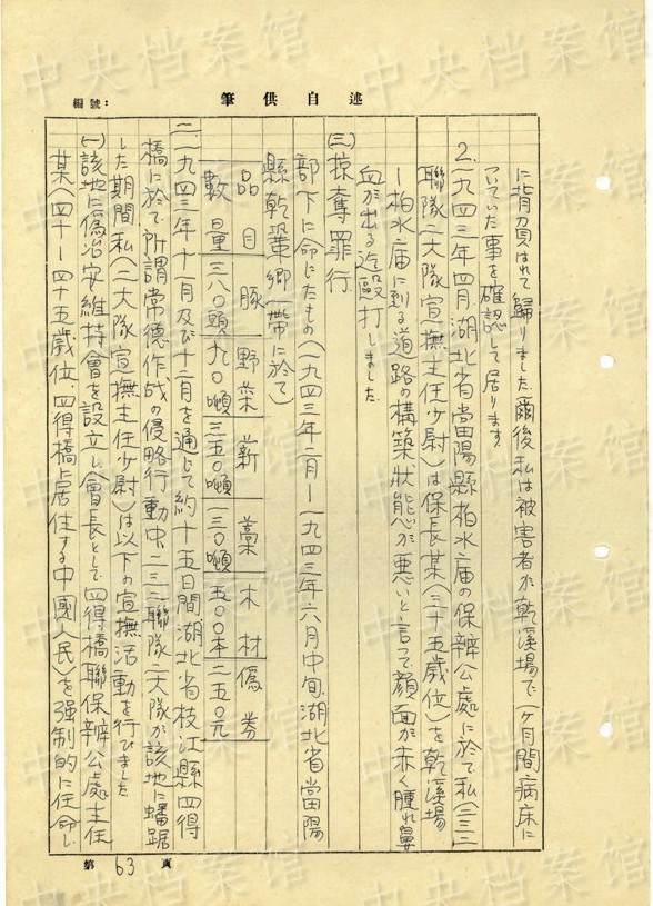 1942年5月下旬には、湖北省鐘祥県郭劉灣で、「該部落中國人民家屋十棟(30間)を(中略)燼滅の為放火全焼」し、「部落に居住する中國人民農(nóng)民一名(四十歳位男)を新四軍戦士容疑者の口実をつけ部下分隊(duì)長中田伍長に命じて潅水拷問の後、私は首を斬って殺し死體は現(xiàn)場に放置しました」