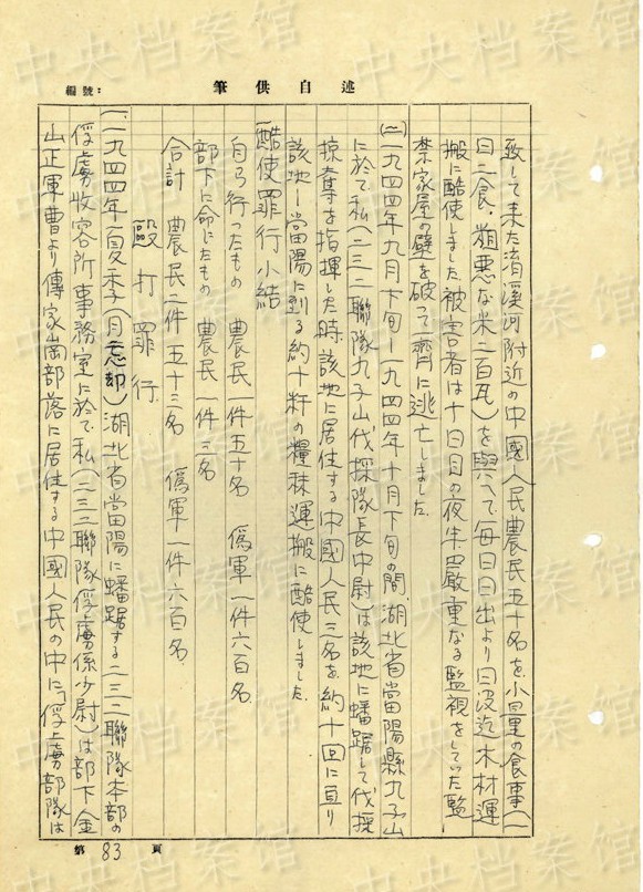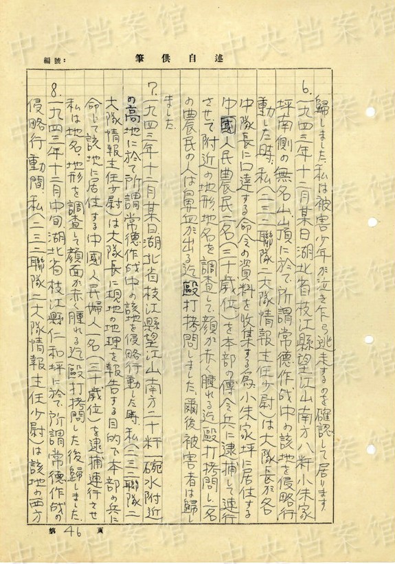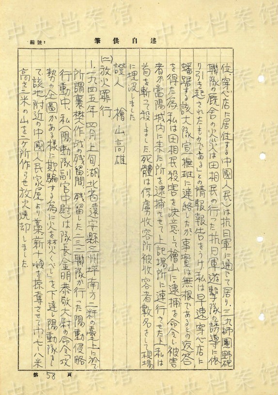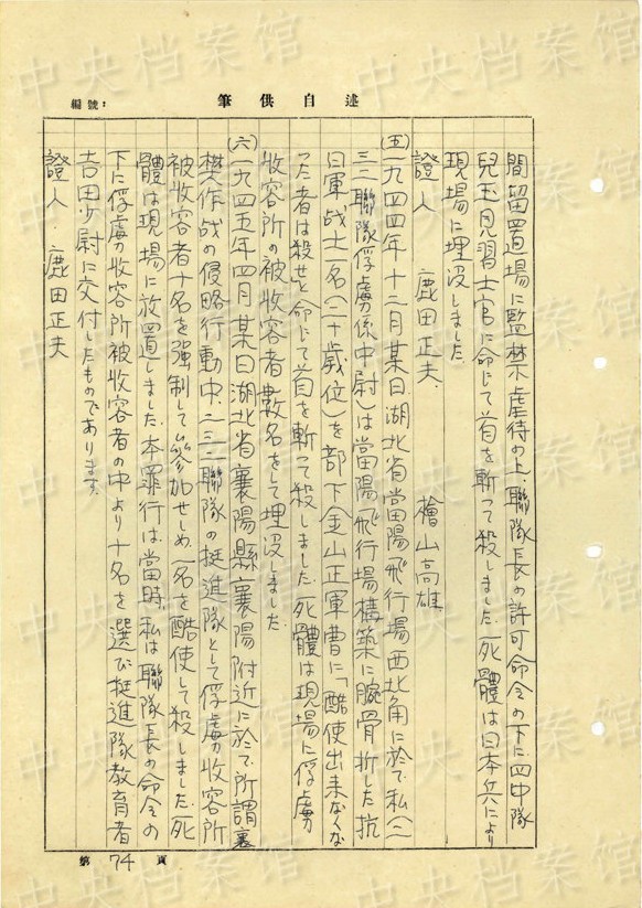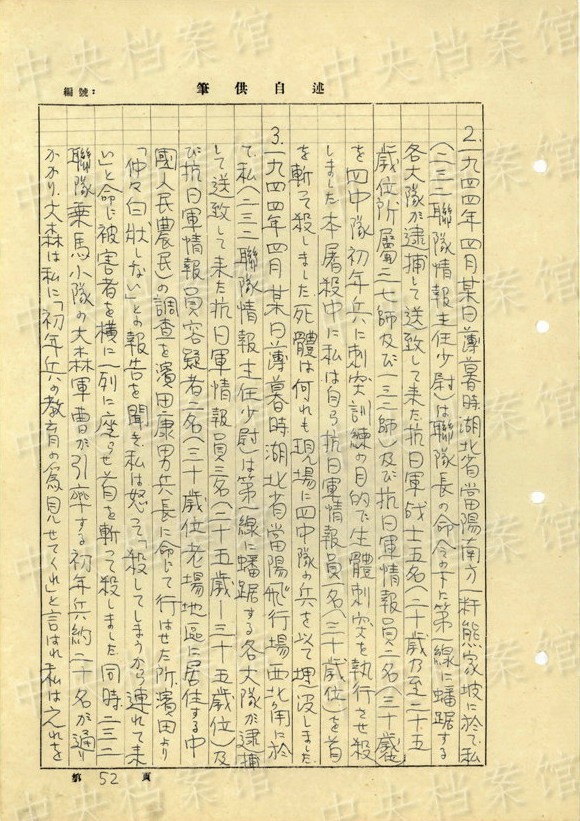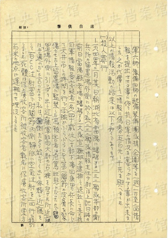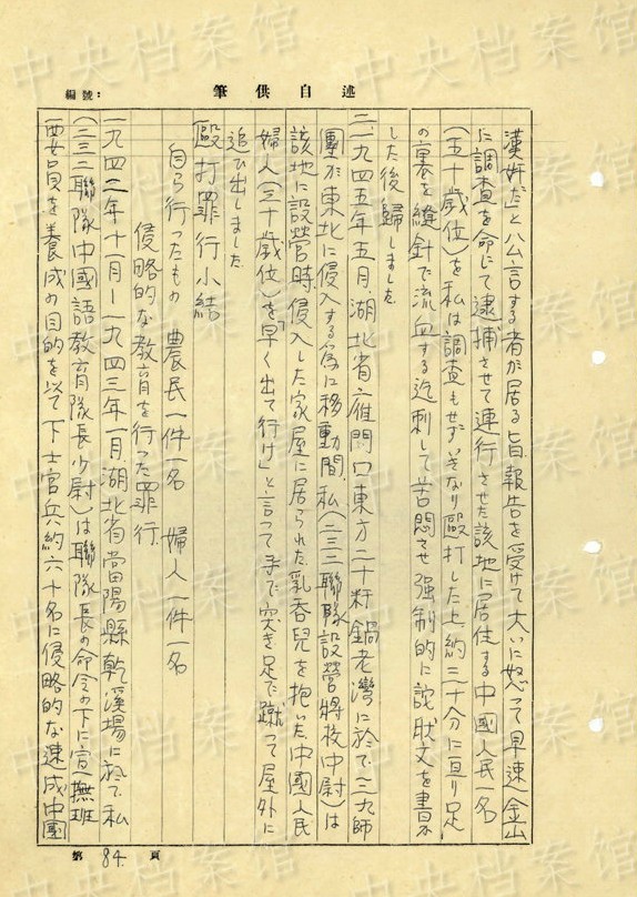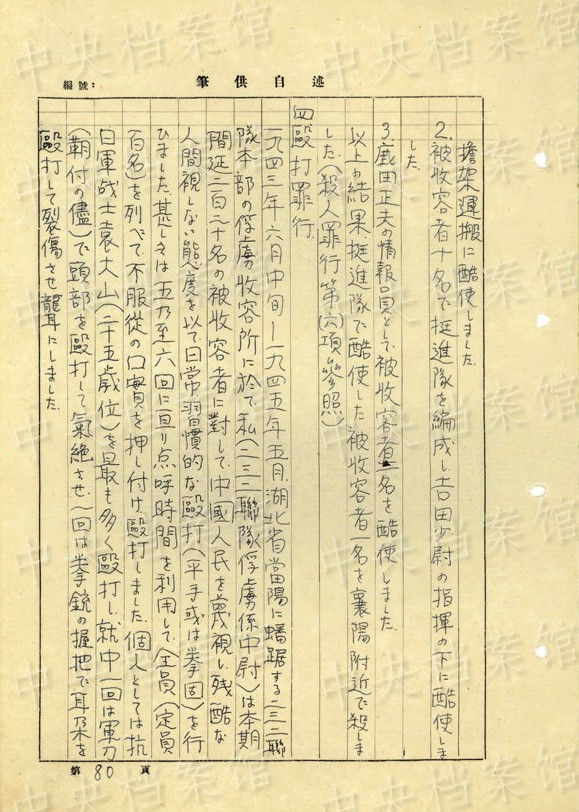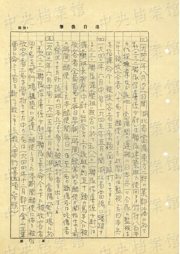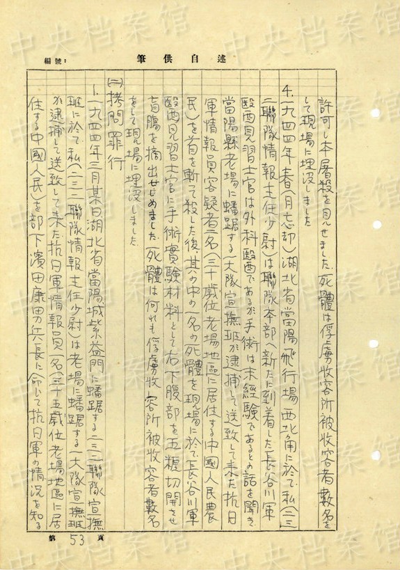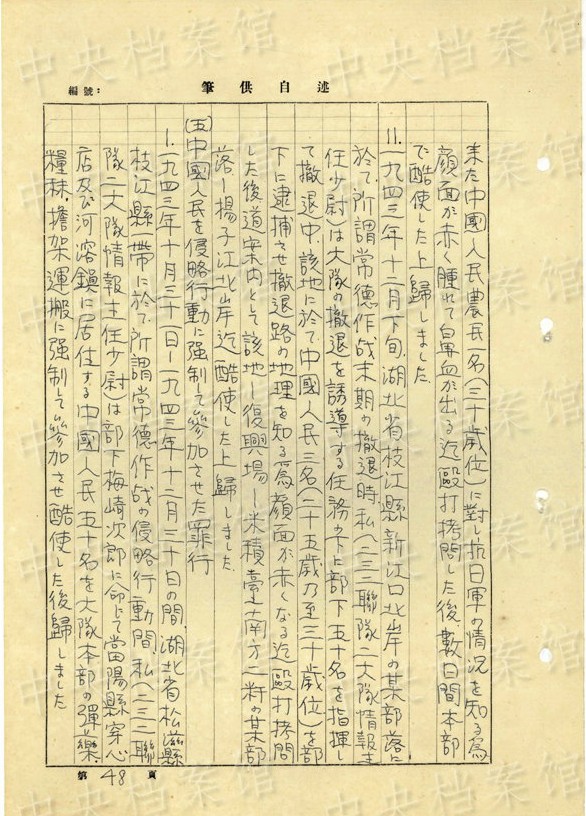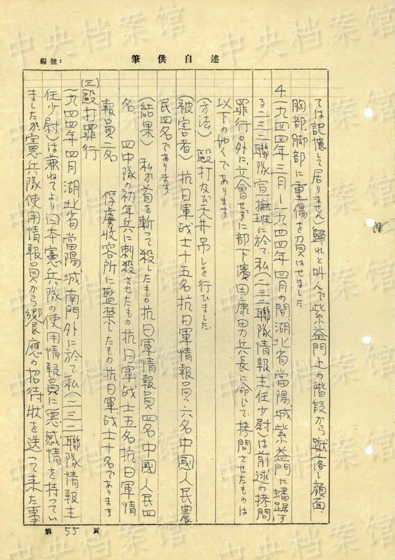 1944年9月,湖北省當(dāng)陽飛機(jī)場西北角で、監(jiān)禁中の抗日軍情報(bào)員の殺害を要請され、「被害者一名(二十五歳位)を首を斬って殺しました」(編集MA)