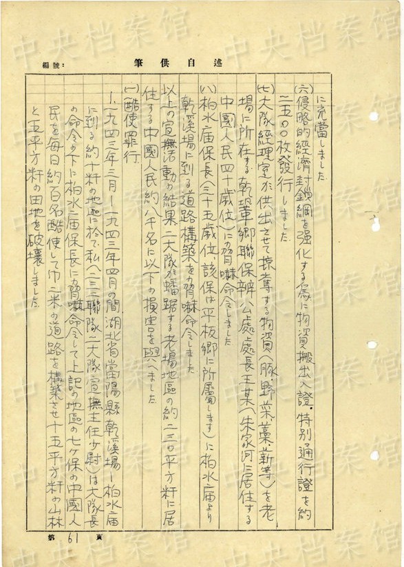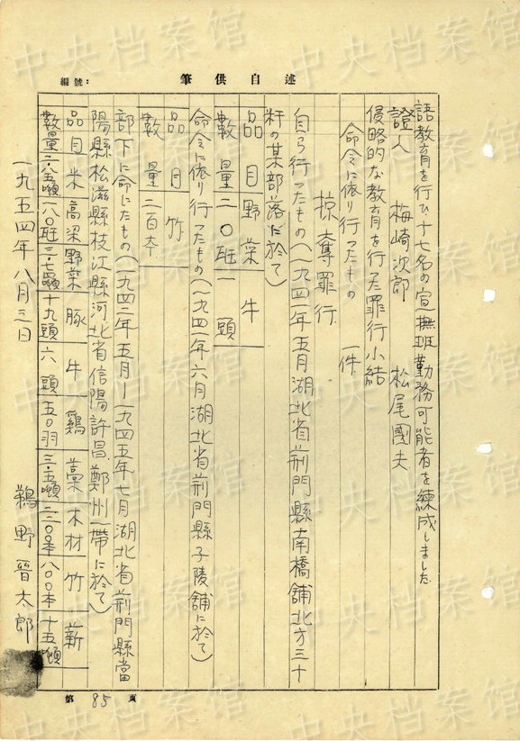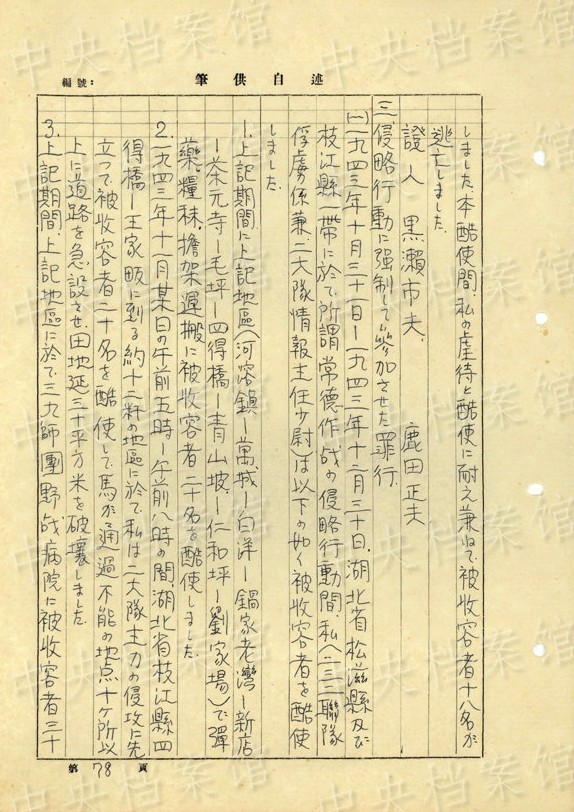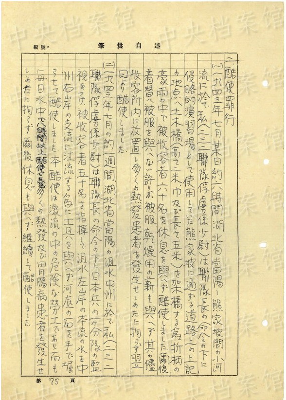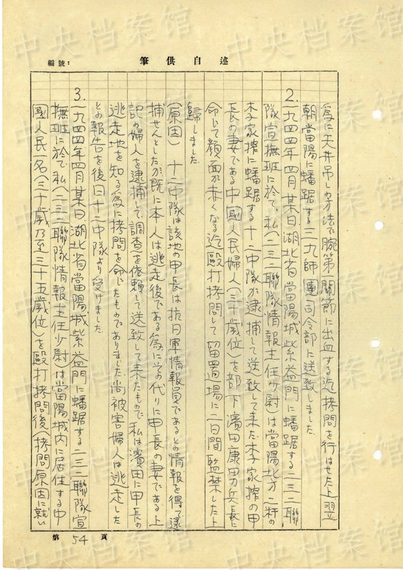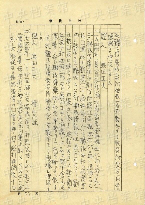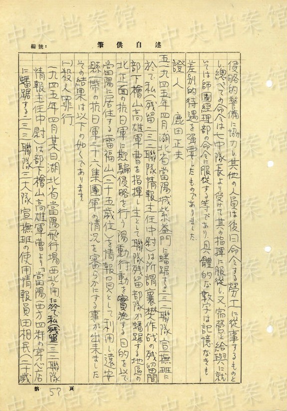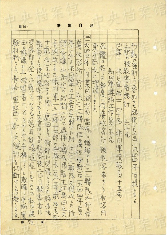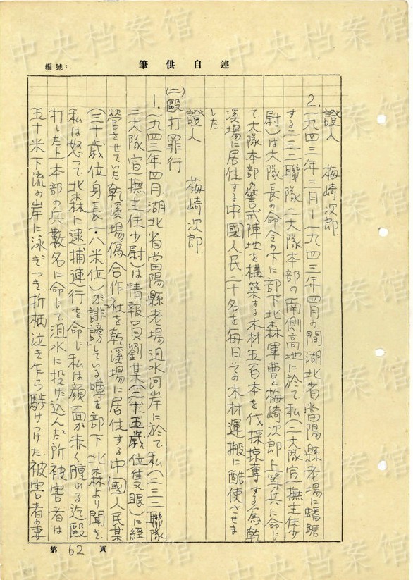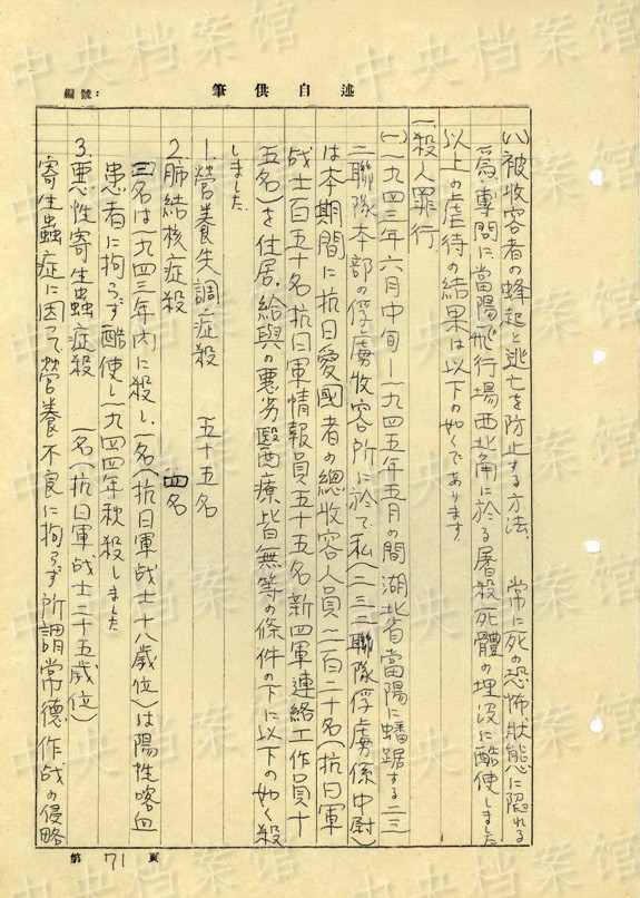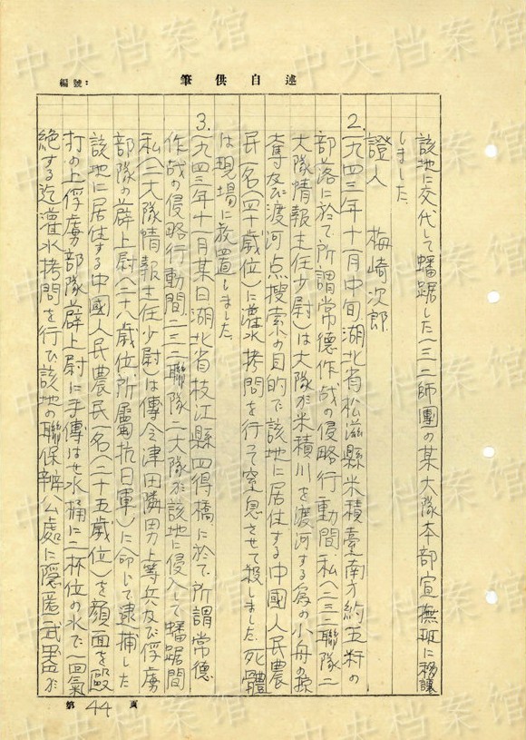 1944年9月,湖北省當(dāng)陽飛機(jī)場西北角で、監(jiān)禁中の抗日軍情報(bào)員の殺害を要請され、「被害者一名(二十五歳位)を首を斬って殺しました」(編集MA)