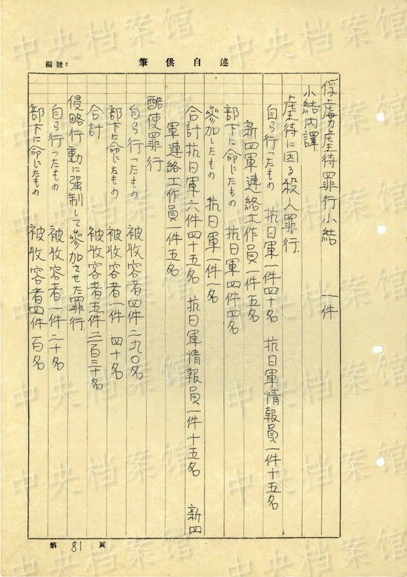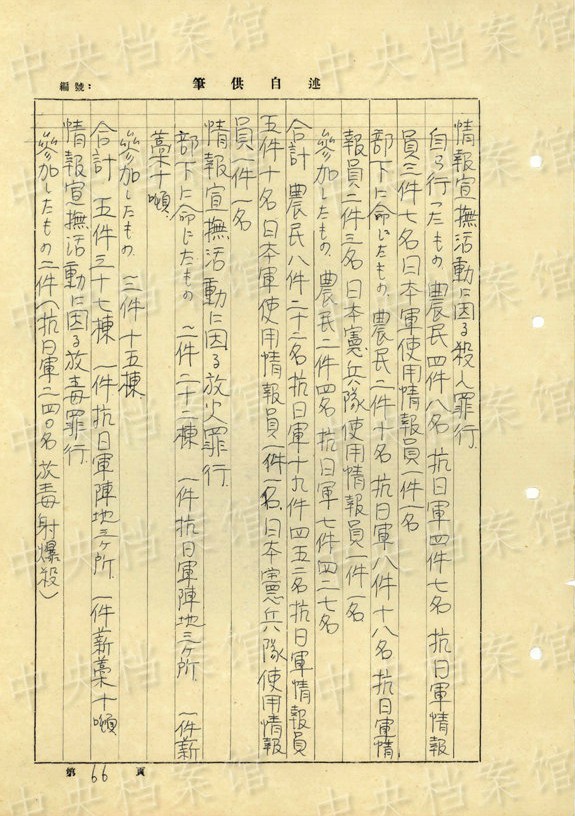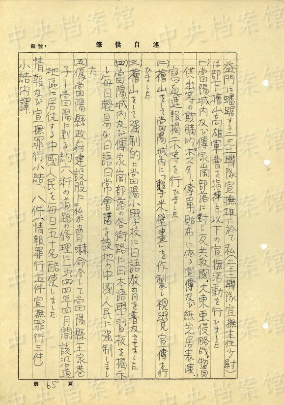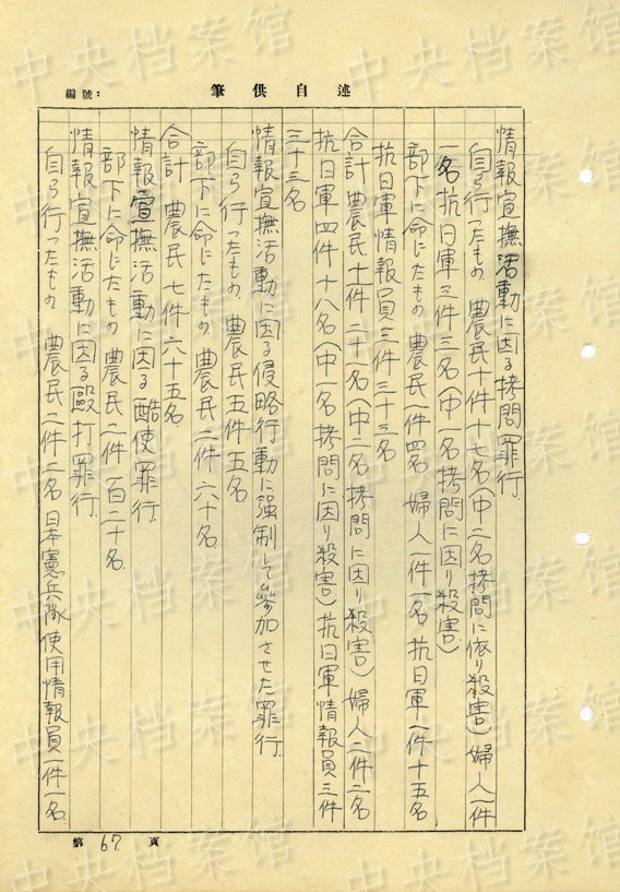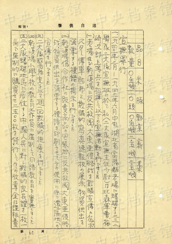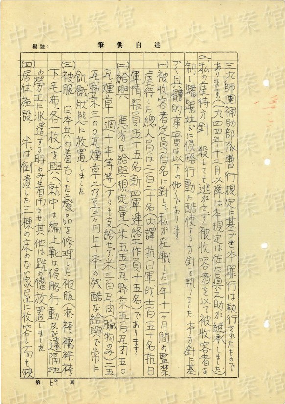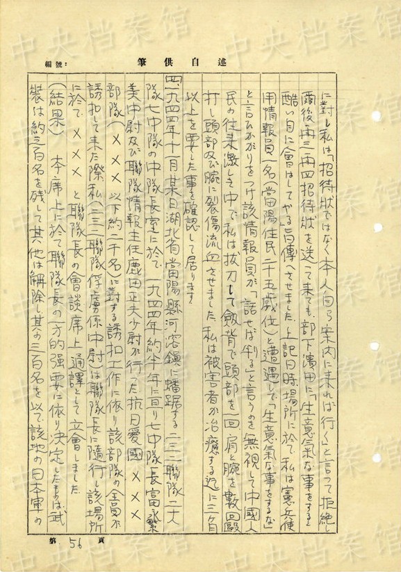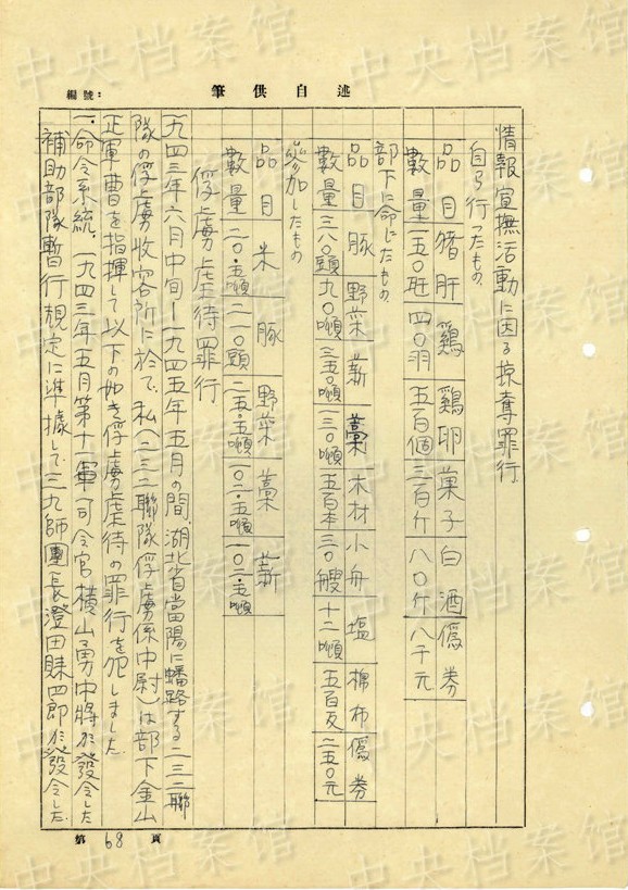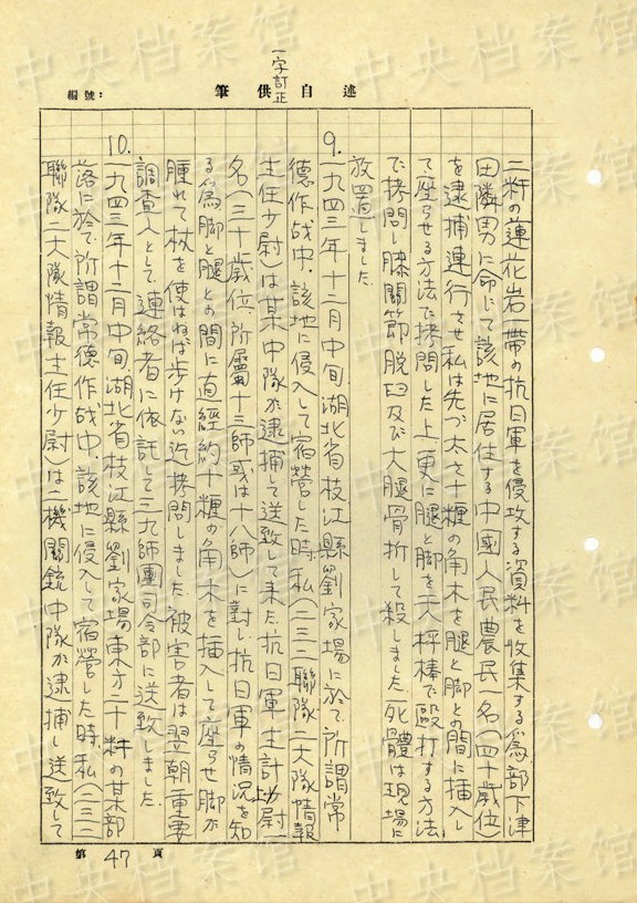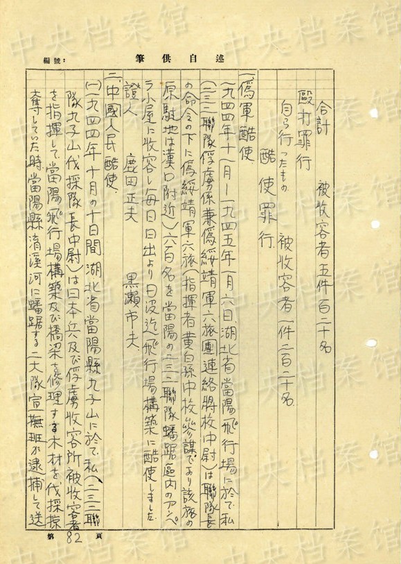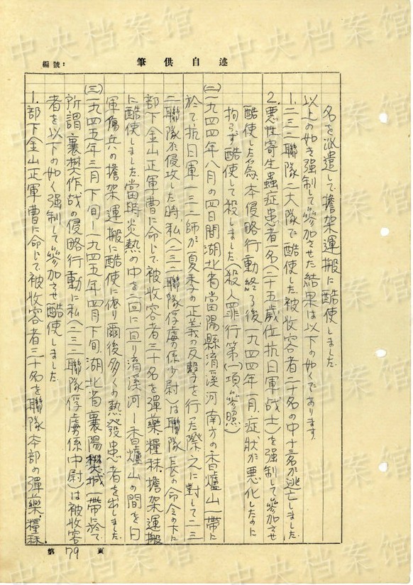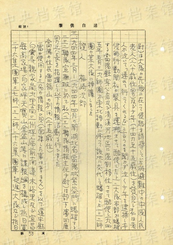 1944年9月,湖北省當(dāng)陽飛機(jī)場西北角で、監(jiān)禁中の抗日軍情報(bào)員の殺害を要請され、「被害者一名(二十五歳位)を首を斬って殺しました」(編集MA)