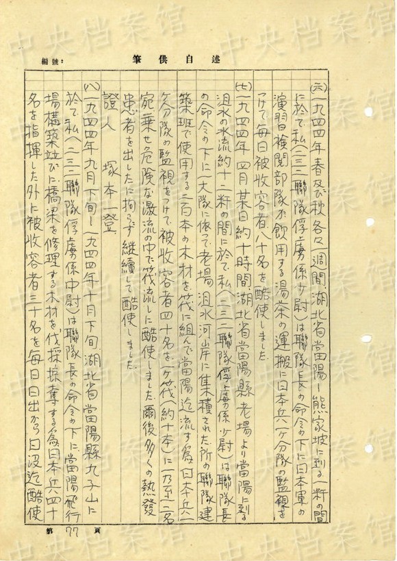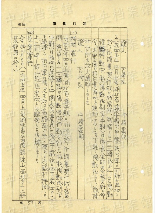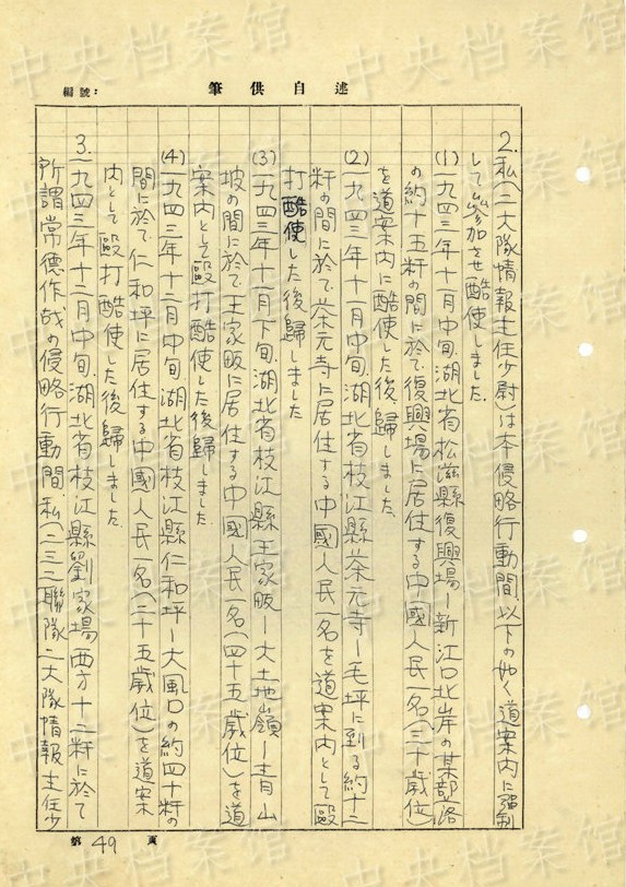 1943年12月中旬には、湖北省枝江県仁和坪で、「該地に居住する中國人民農(nóng)民一名(四十歳位)を逮捕連行させ、私は先づ太さ十糎の角木を腿と腳との間に挿入して座らせる方法で拷問した上、更に腿と腳を天秤棒で毆打する方法で拷問し、膝関節(jié)脫臼及び大腿骨折して殺しました」