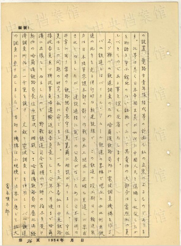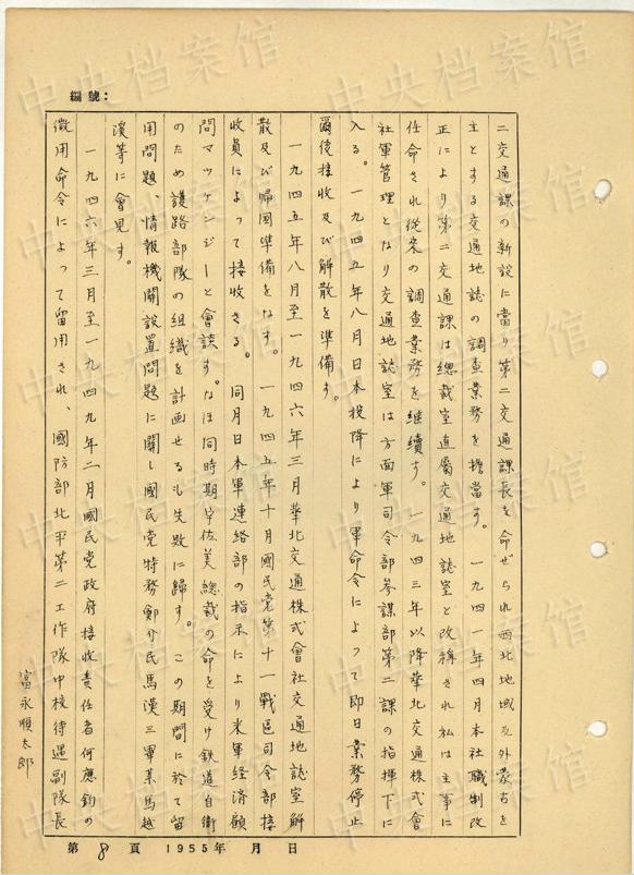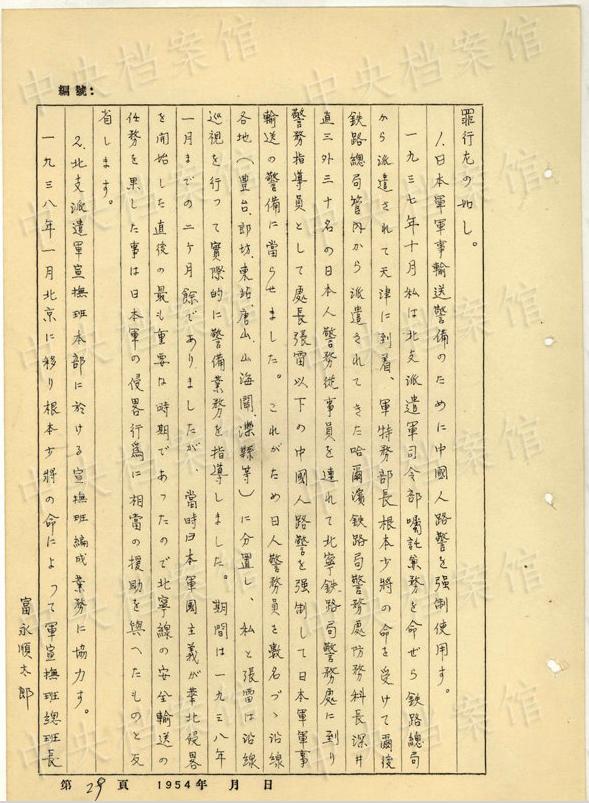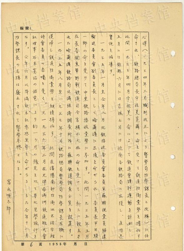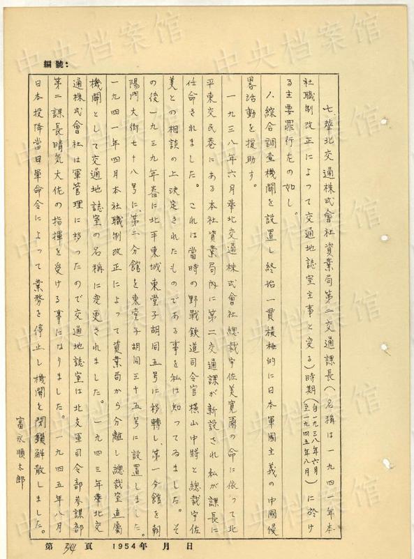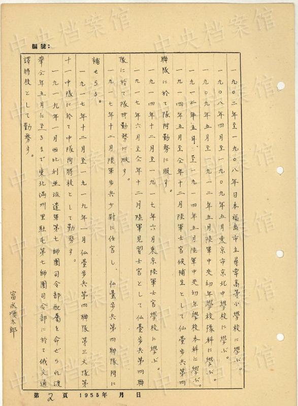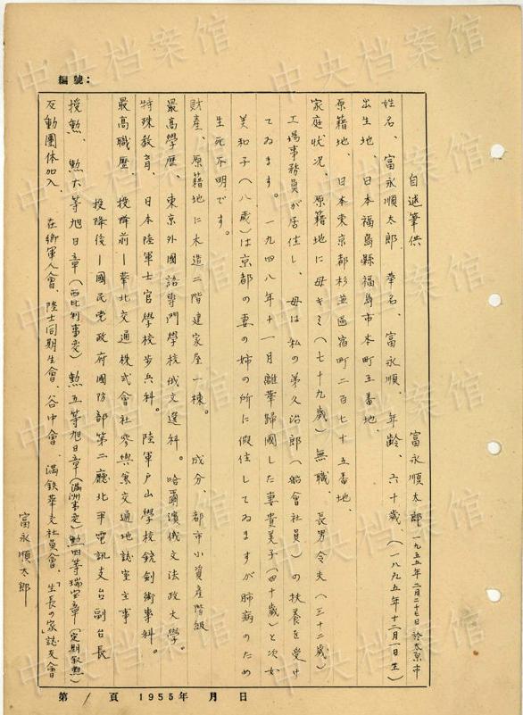 日本人戦犯?富永順太郎の1955年2月から12月の供述書によると、富永は1895年に日本の福島県で生まれた。1926年から1931年1月までハルビン日本內(nèi)務(wù)事務(wù)官石川銀三の事務(wù)所で勤務(wù)した。1939年6月以降は、華北交通株式會(huì)社の課長(zhǎng)、資業(yè)局次長(zhǎng)、総裁室交通地誌室主事を務(wù)めた。
