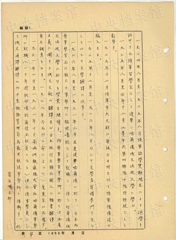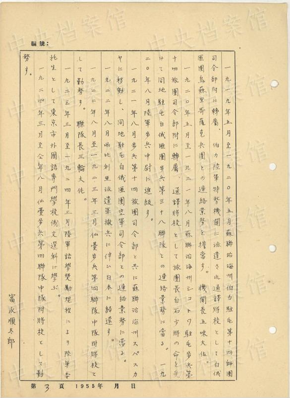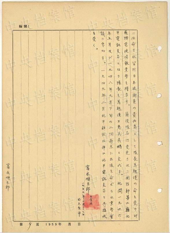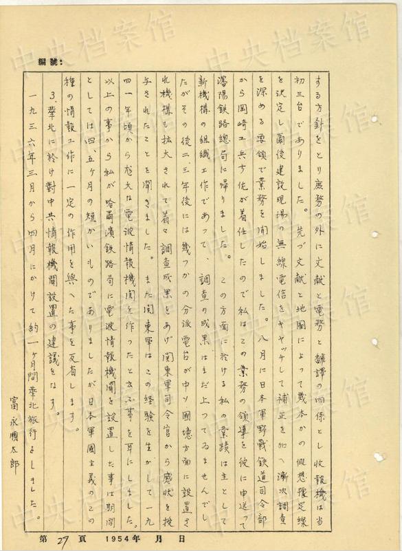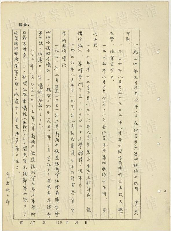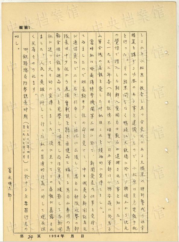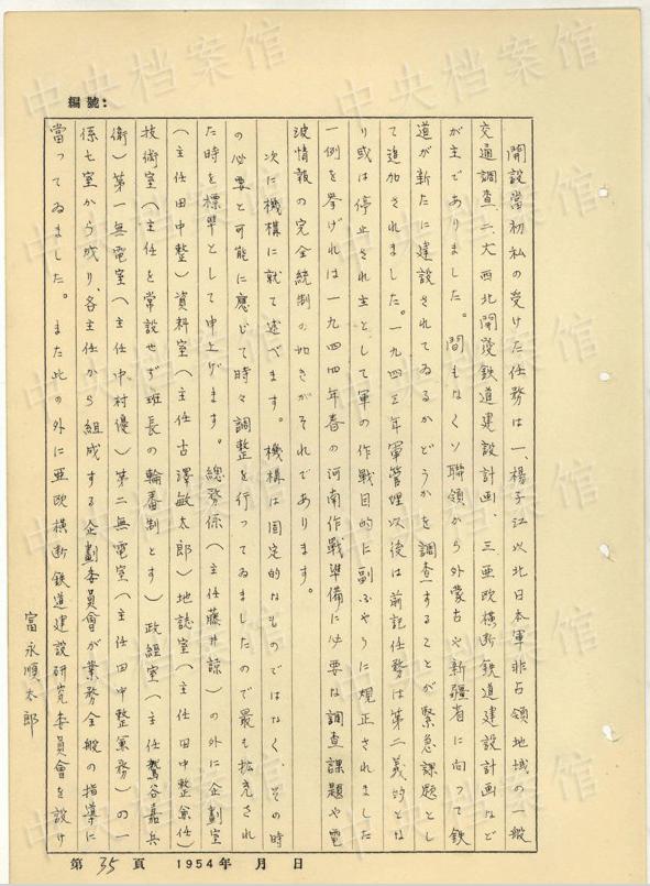 日本人戦犯?富永順太郎の1955年2月から12月の供述書によると、富永は1895年に日本の福島県で生まれた。1926年から1931年1月までハルビン日本內(nèi)務(wù)事務(wù)官石川銀三の事務(wù)所で勤務(wù)した。1939年6月以降は、華北交通株式會(huì)社の課長(zhǎng)、資業(yè)局次長(zhǎng)、総裁室交通地誌室主事を務(wù)めた。