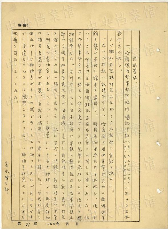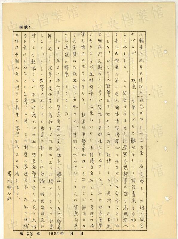 1941年12月以降は、「私は在京華北交通株式會(huì)社本社警務(wù)局所屬中央特務(wù)班班長(zhǎng)を兼務(wù)していましたので」、「第三國(guó)人特に交戦國(guó)たる英米仏國(guó)僑民に対する取締監(jiān)視を厳重にしました」?!弗攻靴は右蓾夂瘠胜猡韦洗队崋枻菲鋬?nèi)之四名は前記日高機(jī)関に送附しました。その內(nèi)一名は白俄人、他は中國(guó)人でありました」