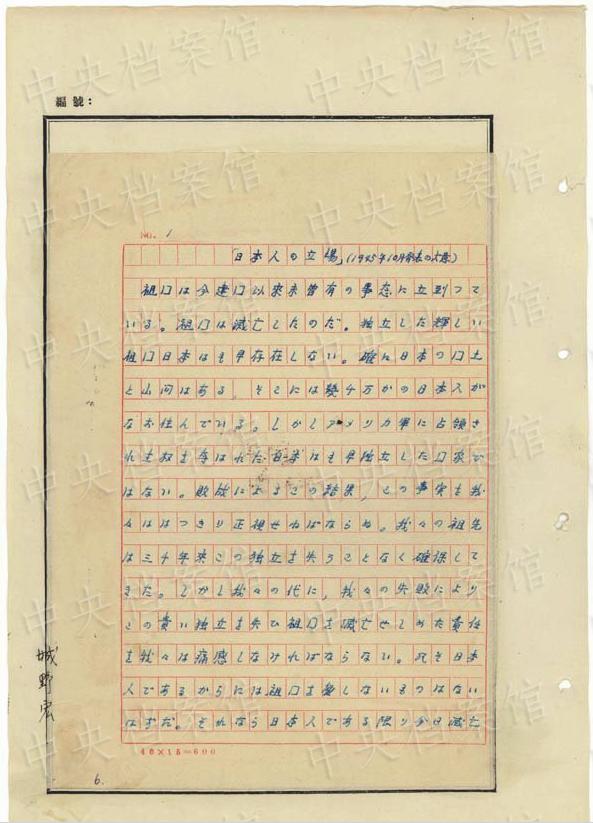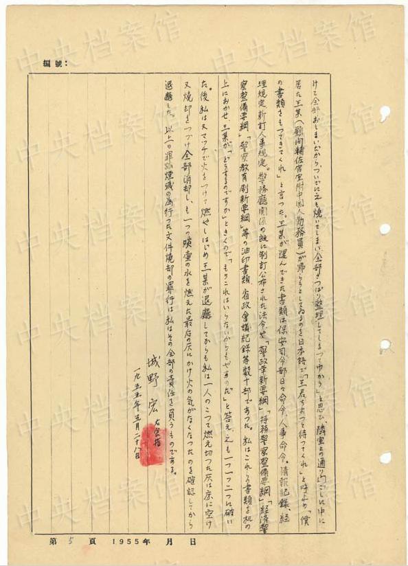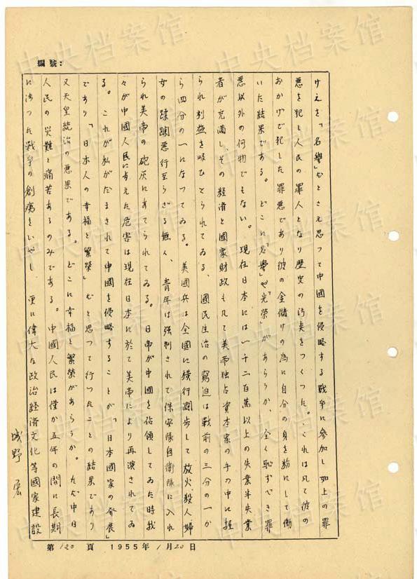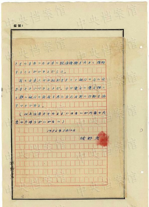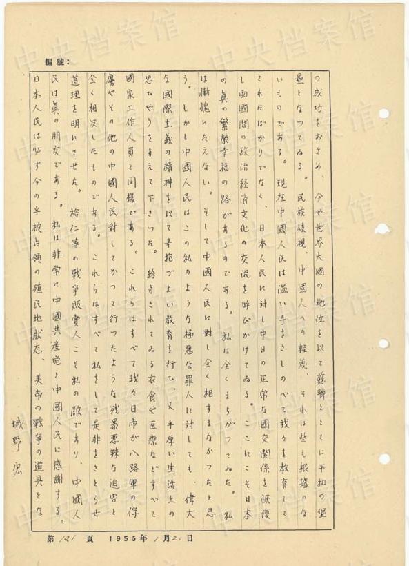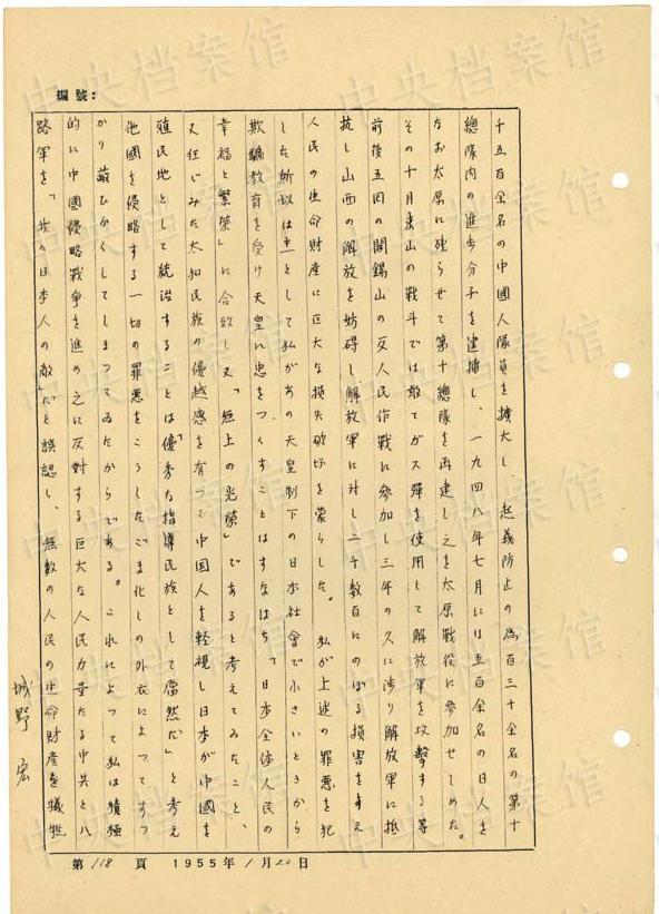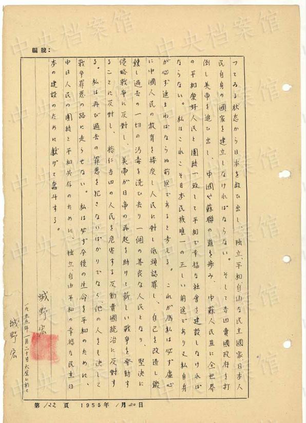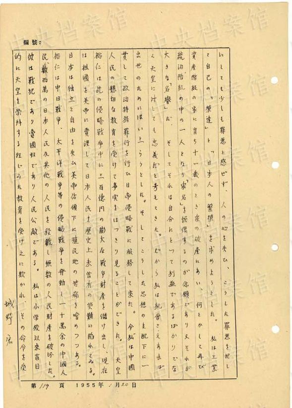 日本人戦犯?城野宏の1955年1月の供述書によると、城野は1914年に日本の長(zhǎng)崎市で生まれ、1938年に中國(guó)東北部での中國(guó)侵略戦爭(zhēng)に參加し、1949年4月に捕虜となった。