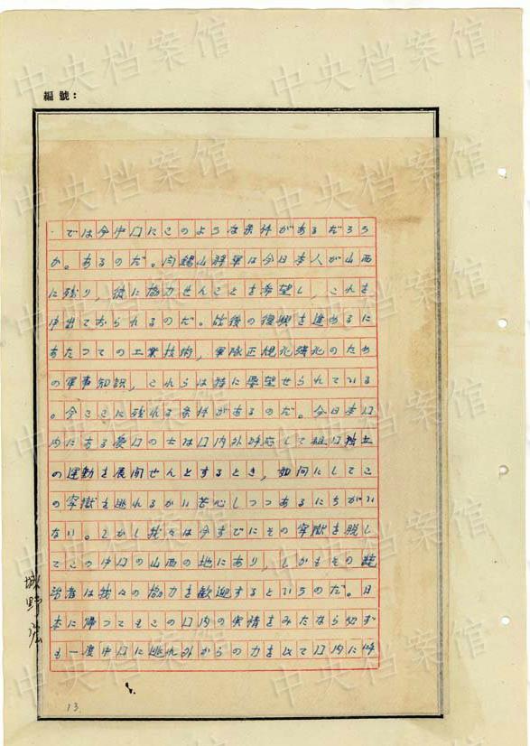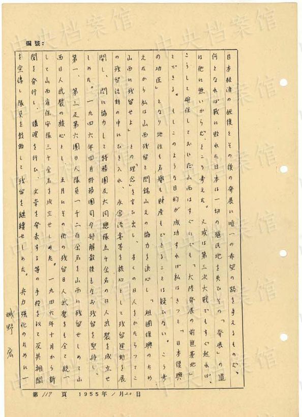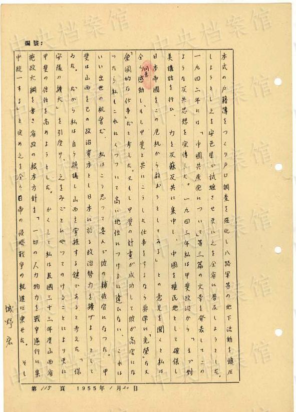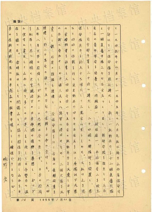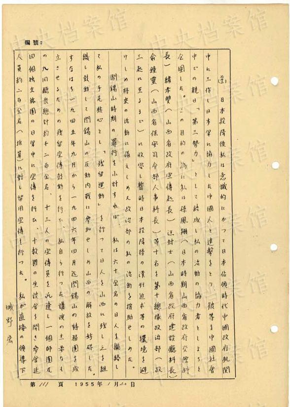 1948年10月、「私は今村方策と共謀畫策し第十総隊(duì)を太原東山戦闘に投入し解放軍に約一千余名の損害を與え太原の解放を妨礙した」。「私は解放軍陣地に落下する十?dāng)?shù)発のガス弾の炸裂を目撃した」(編集MA)
