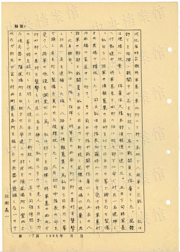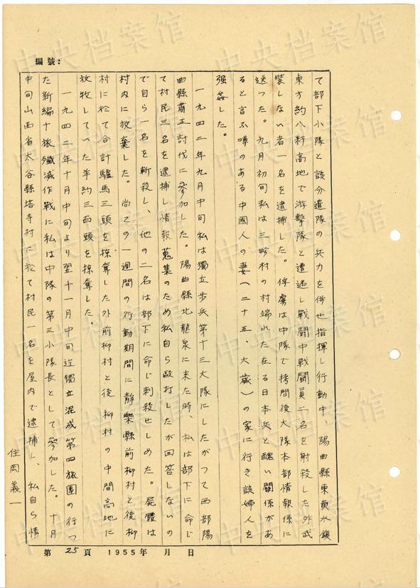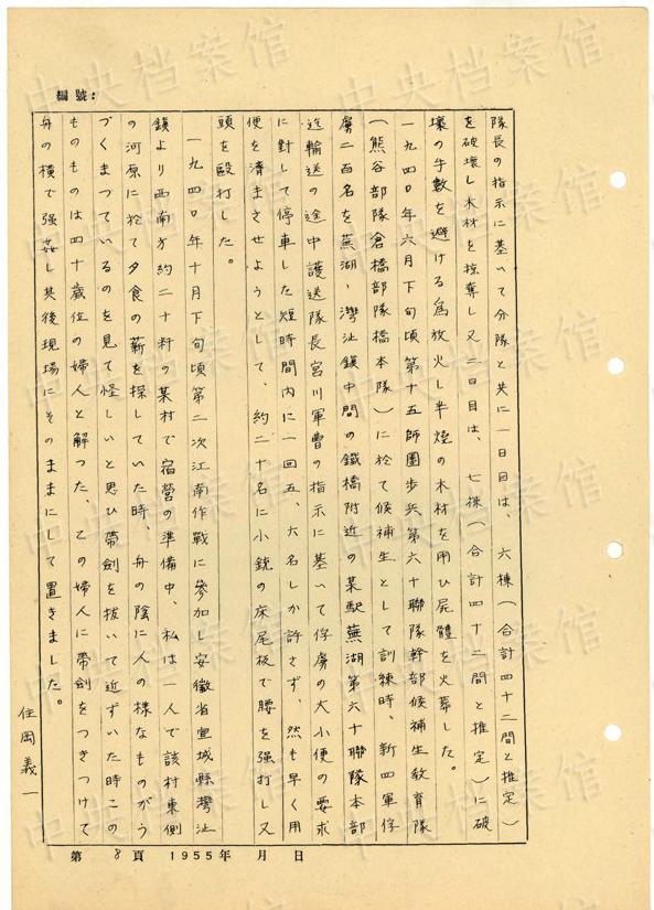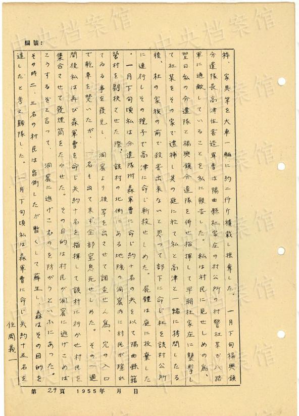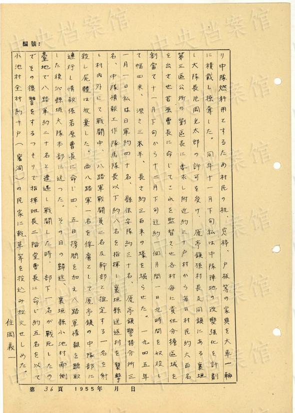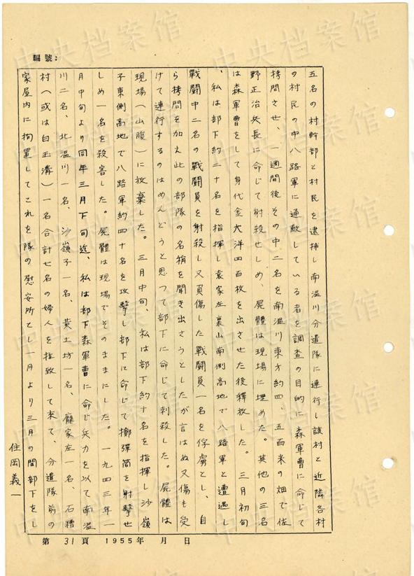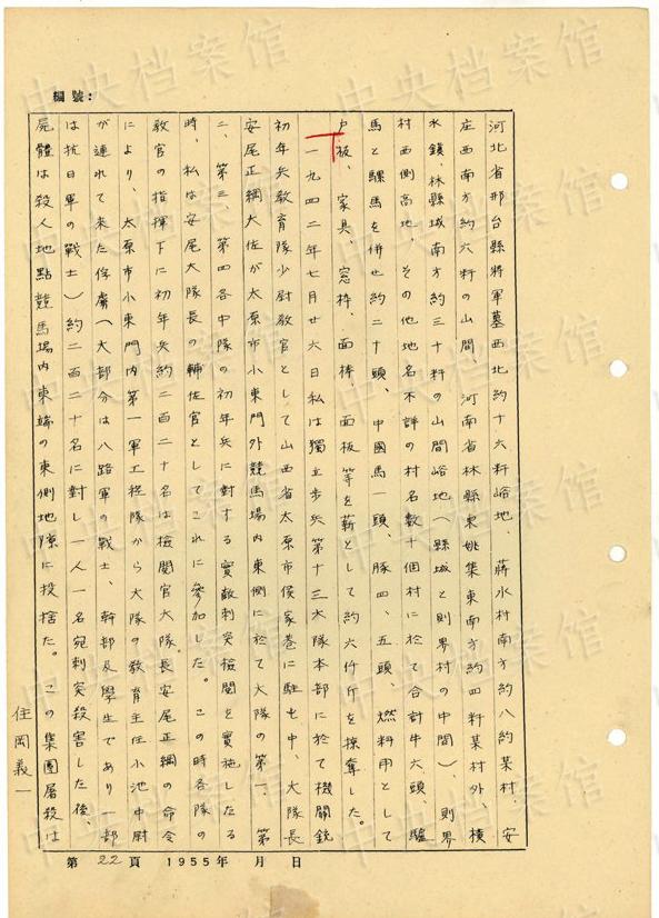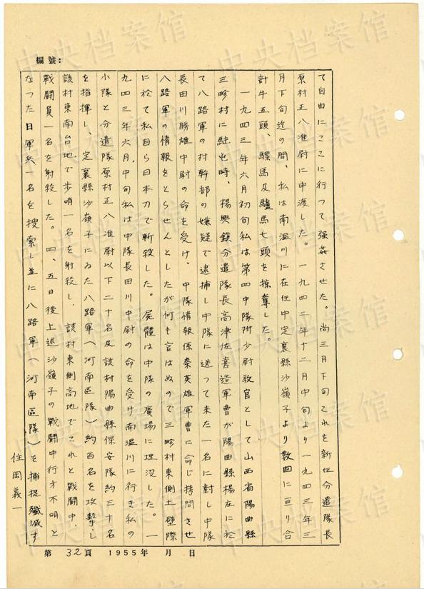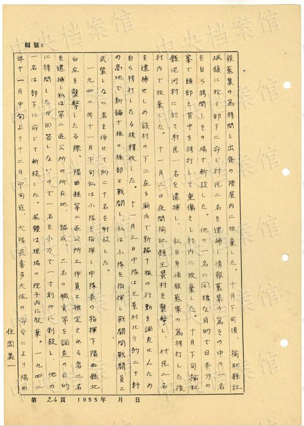 1944年8月下旬には、沁県で、「暖柳村及小河村より各一名の村民を逮捕し」、「私は馬隊長に命じこの二名を沁県城西側(cè)の河原で射殺」した。(編集MA)