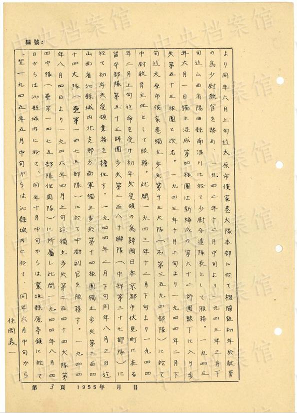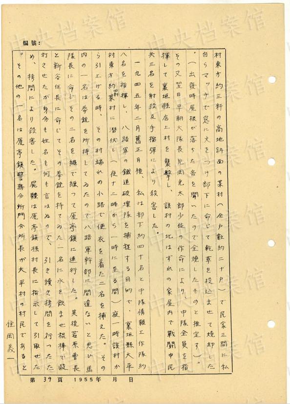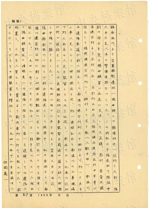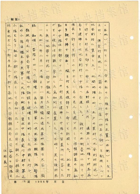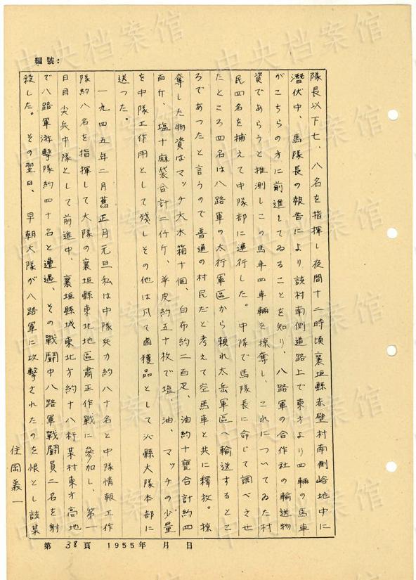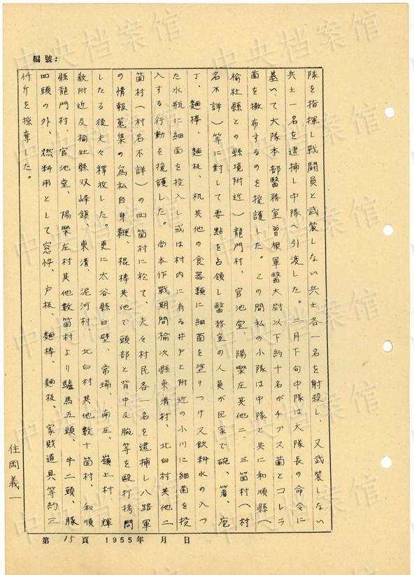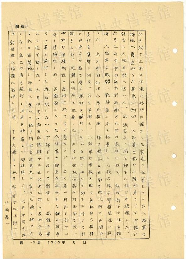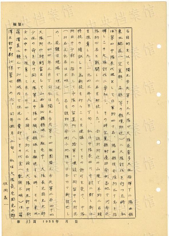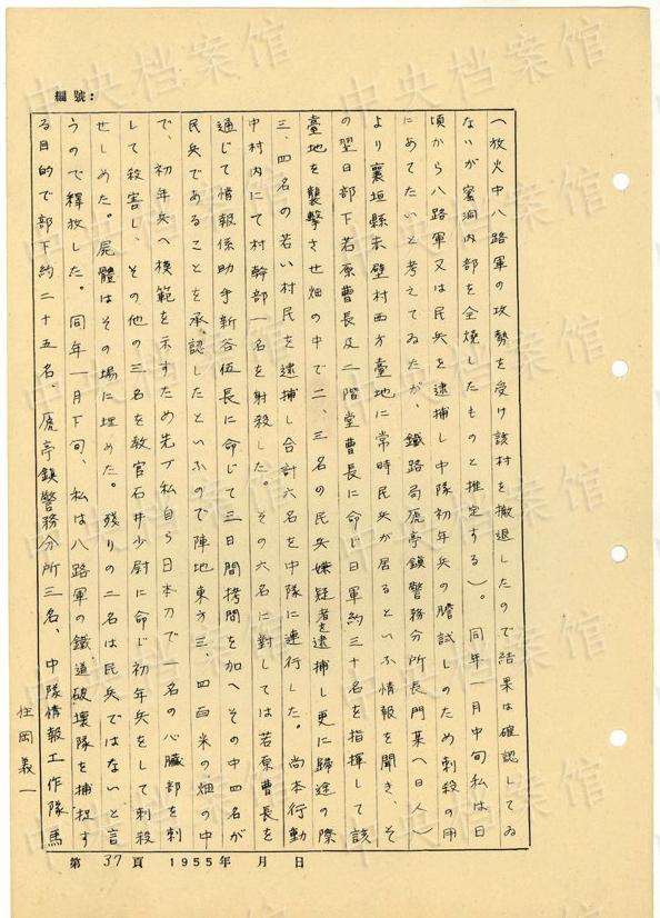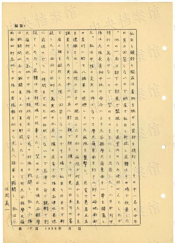 1944年8月下旬には、沁県で、「暖柳村及小河村より各一名の村民を逮捕し」、「私は馬隊長に命じこの二名を沁県城西側(cè)の河原で射殺」した。(編集MA)