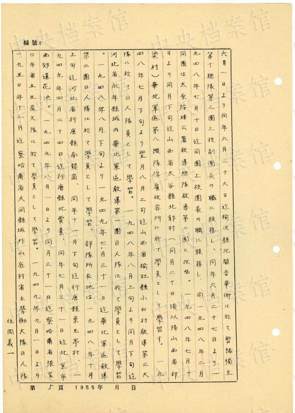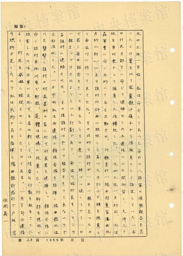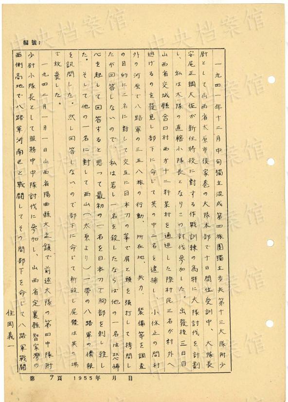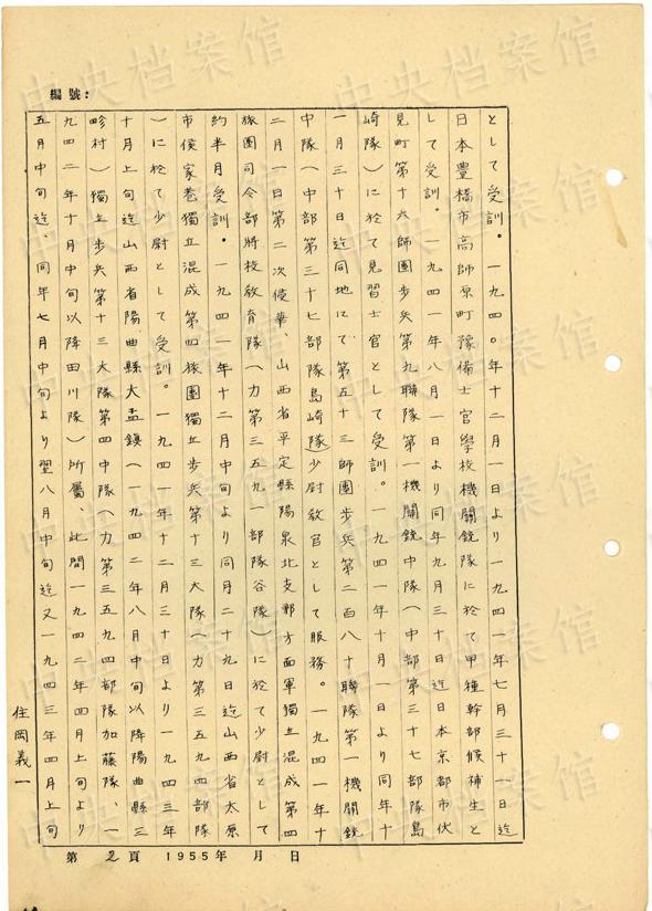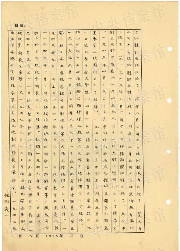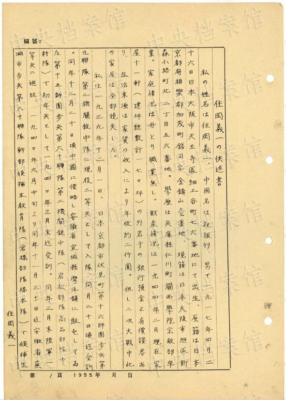 日本人戦犯?住岡義一の1955年5月の供述書によると、住岡は1917年に日本の大阪市で生まれた。1939年12月に日本軍に入隊し、同月、中國安徽省宣城県に赴いた。1945年8月、日本軍の投降後、國民黨閻錫山の部隊に入った。1948年7月10日に山西省太原で捕虜となった。