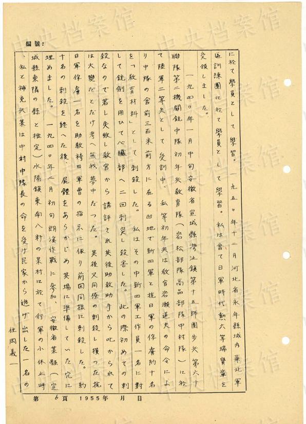 1940年1月には、安徽省宣城で初年兵として受訓(xùn)中に、「新四軍と抗日軍の俘虜約十名を『教育材料』として刺殺した」