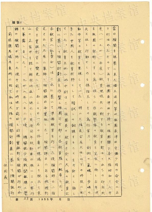 1943年6月下旬には、「中隊附田中少尉に支持して中隊の留置所に八路軍の嫌疑で拘留中の村民(中略)一名を該村外南側(cè)小地隙で日本刀で斬殺せしめ」た。