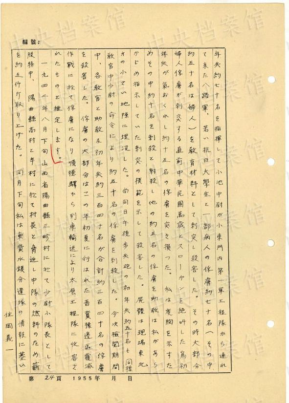 1942年7月には、太原市侯家巷に駐屯中、「実敵刺突検閲を?qū)g施したる時(中略)連れて來た俘虜(大部分は八路軍の戦士、幹部及學(xué)生であり一部は抗日軍の戦士)約二百二十名に対し一人一名宛刺突殺害した」?!笍諈КF(xiàn)役兵に対する教育方針は(中略)生きた中國人を教育材料として肝試しの鍛錬することを方針とし話していた。(中略)各教官(私を含む)はこれに基いて準(zhǔn)備教育を行った後(中略)検閲課目にある仮標(biāo)刺突を?qū)g敵刺突に変更した」