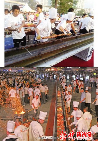 15日午後9時ごろ、300キログラム以上の肉と100箱以上の炭を使った、長さ100メートル以上の串焼きバーベキューが、中ロ國境にある黒竜江省綏芬河市で誕生した?,F場にいた「ギネス世界記録」認定員が、ギネス世界記録として認定すると発表した。鉄製レールを利用して作られたコンロ上で焼かれたこの串焼きバーベキューは、ギネス世界記録が求める基準をクリアしており、新ギネス記録が誕生した。新華網が伝えた。