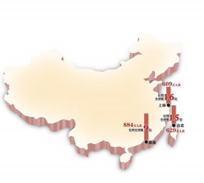 同指數(shù)によると、香港、臺北、上海は大中華圏で國際化が最も進んだ都市だ。推計によれば、2014年の海外からの観光客數(shù)は、香港が884萬人に達して世界9位、臺北が629萬人で15位、上海が609萬人で16位と見込まれる。前年同期に比べ、3都市とも観光客増加率が7-9%と好調(diào)を維持する見込みだが、3都市の中で4年連続の増加を達成するのは臺北だけと予想される。