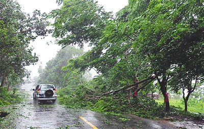 | 文昌市の193県道では、臺風(fēng)により街路樹が折れ、路上に倒れていた=18日 |