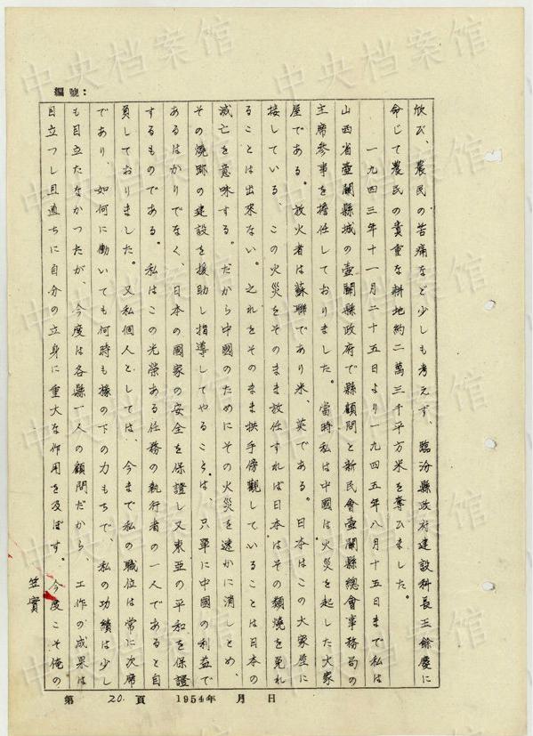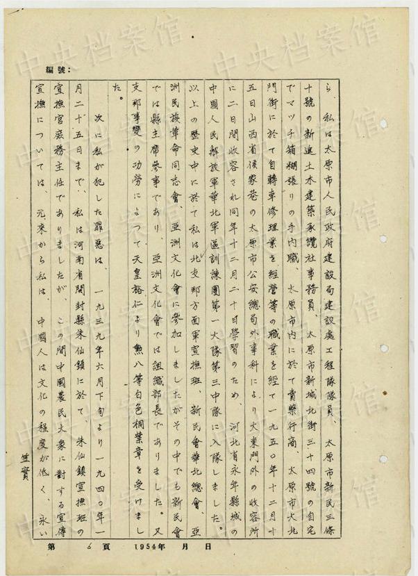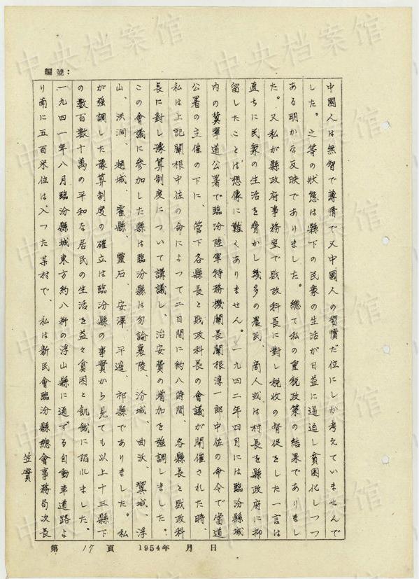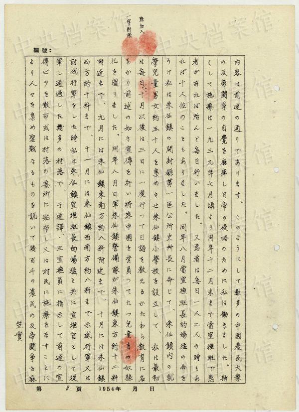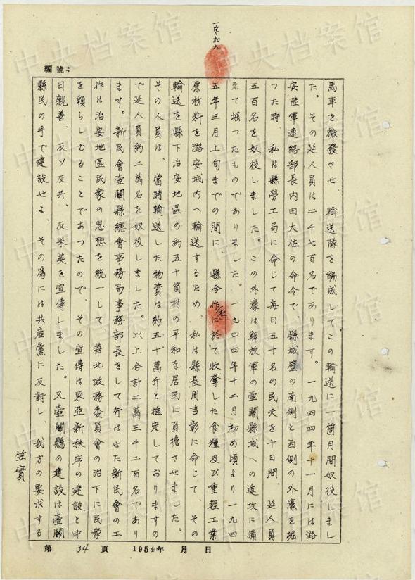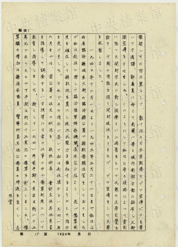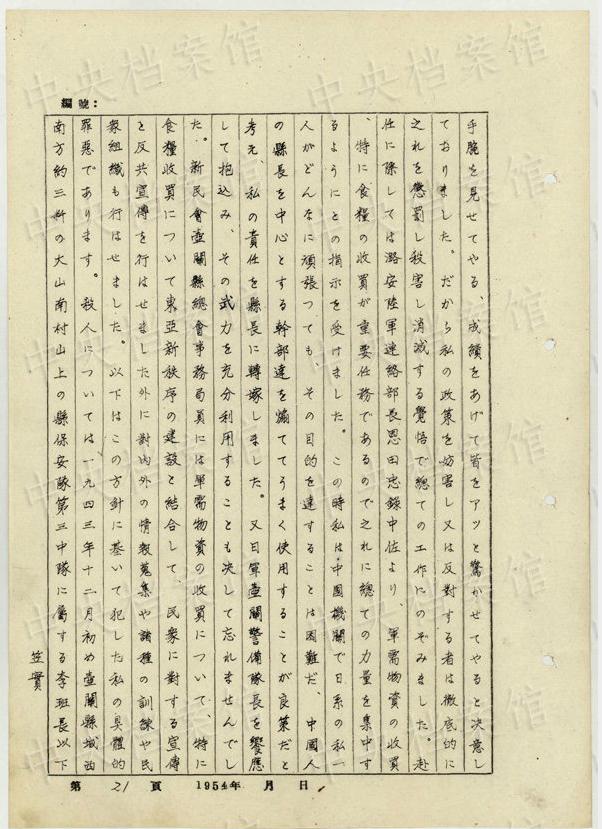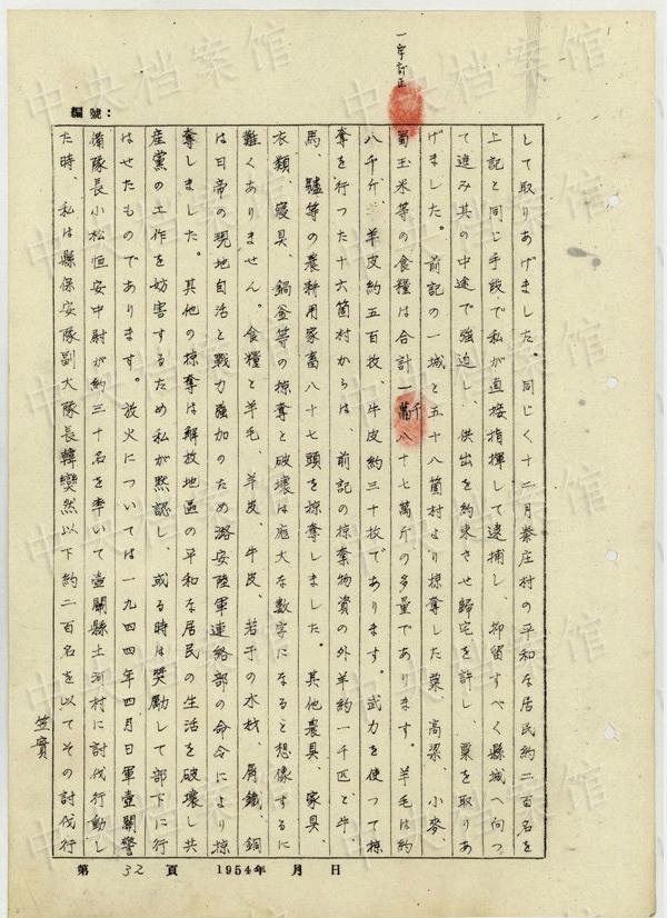 1943年11月25日から1945年8月15日までは、「私が壷関県政府顧問として在任中、食糧及軽重工業(yè)原材料を収奪しましたので該県下の平和な居民百十名を餓死させました」?!敢怀扦任迨斯w村より略奪した粟、高粱、小麥、蜀玉米等の食糧は合計(jì)一千八十七萬斤の多量であります。羊毛は約八千斤、羊皮約五百枚、約三十枚であります」