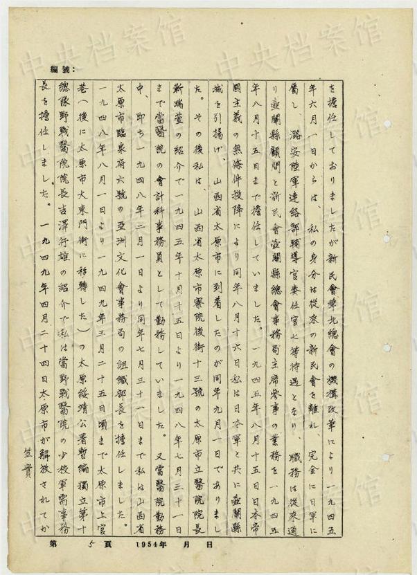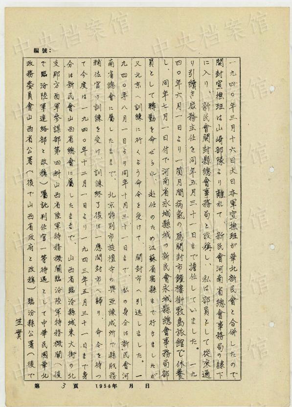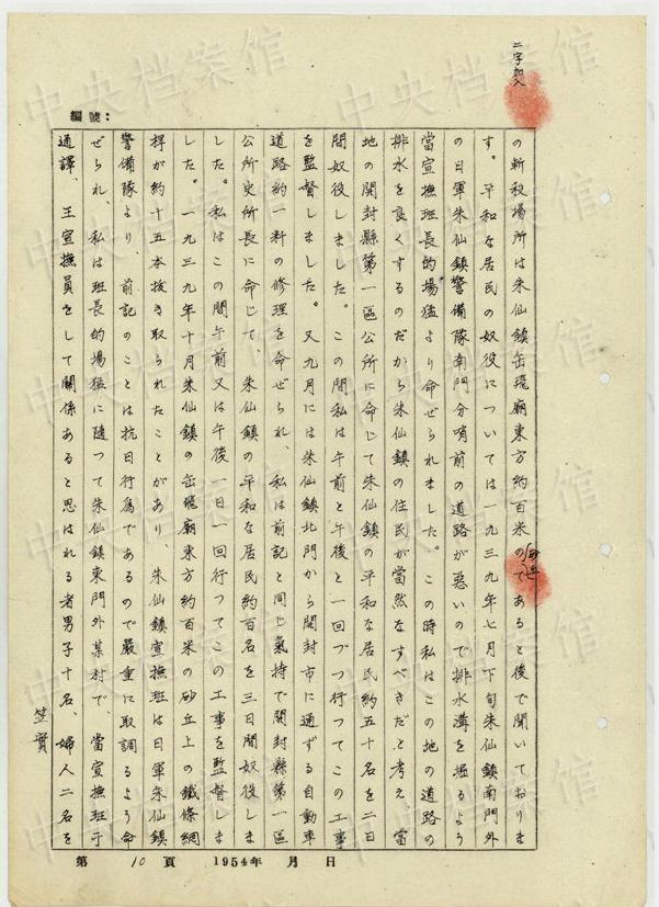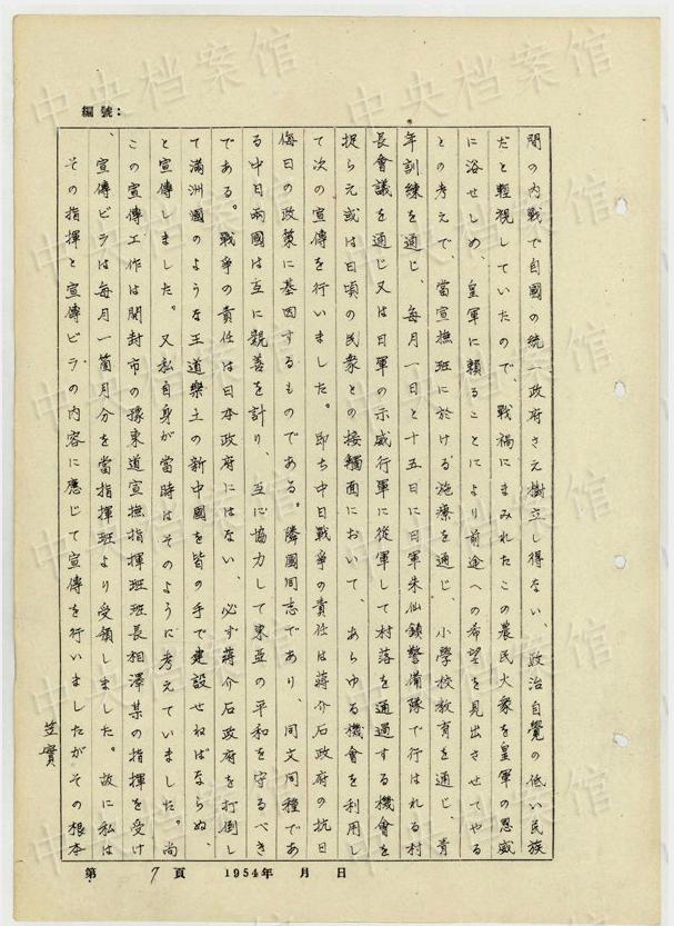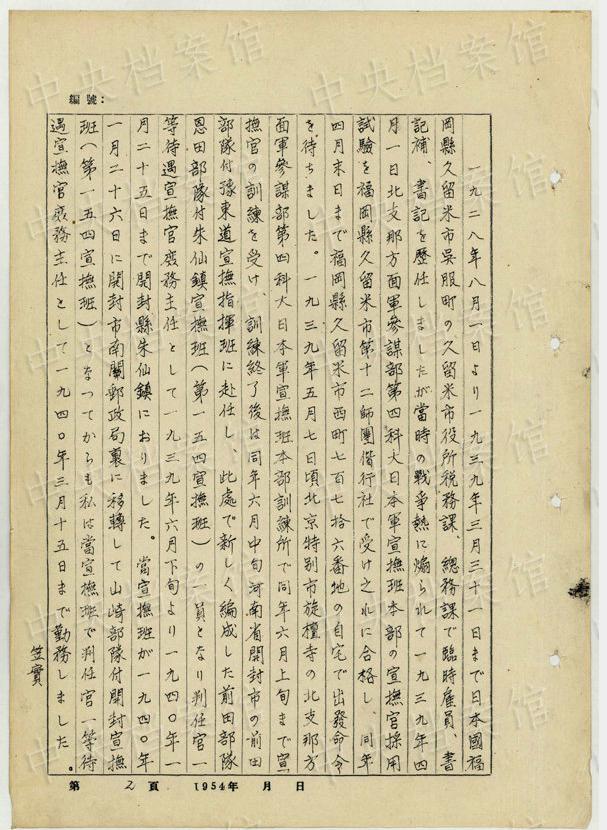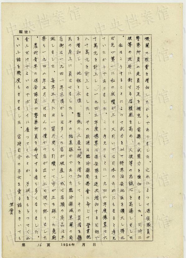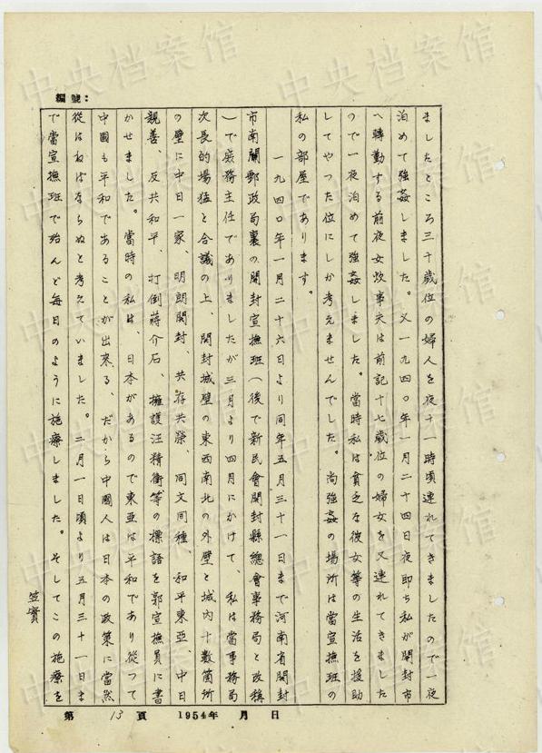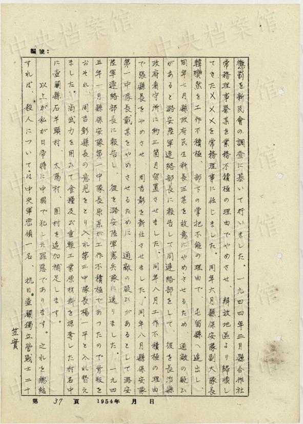 1943年11月25日から1945年8月15日までは、「私が壷関県政府顧問として在任中、食糧及軽重工業(yè)原材料を収奪しましたので該県下の平和な居民百十名を餓死させました」?!敢怀扦任迨斯w村より略奪した粟、高粱、小麥、蜀玉米等の食糧は合計(jì)一千八十七萬斤の多量であります。羊毛は約八千斤、羊皮約五百枚、約三十枚であります」