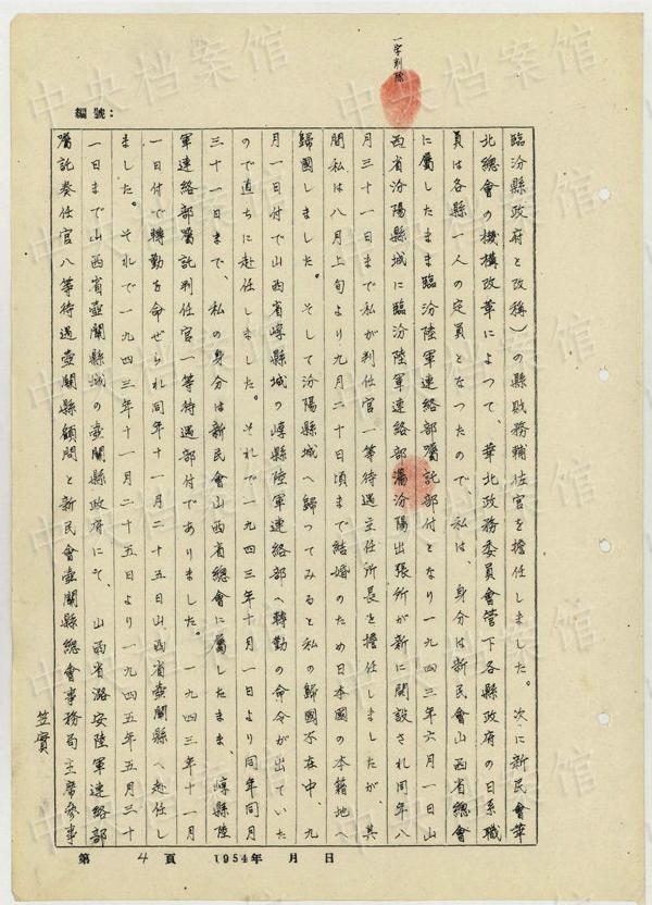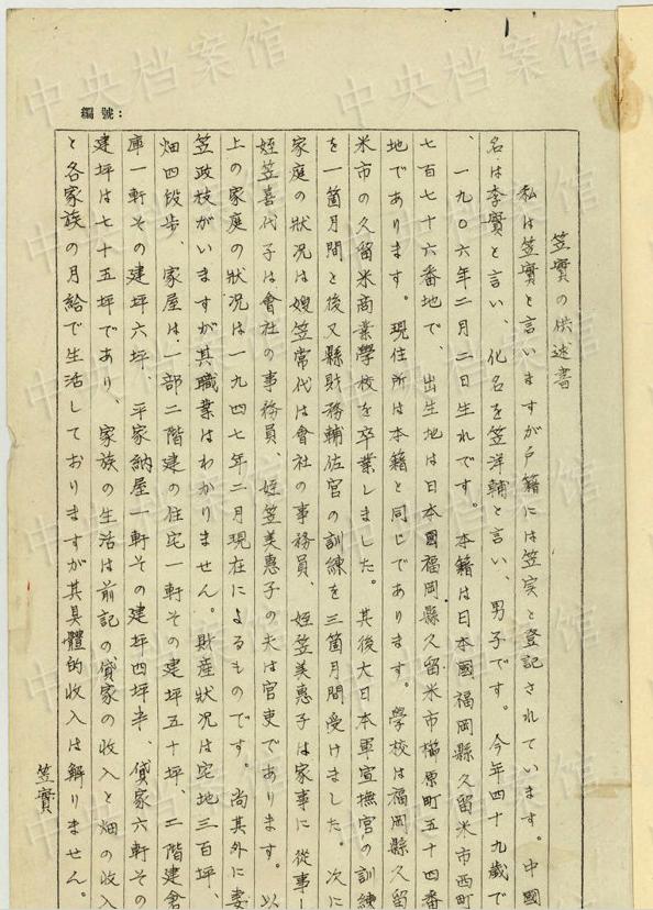 日本人戦犯?笠実の1954年11月の供述書によると、笠は1906年に日本の福岡県で生まれ、李実という中國名を持つ。1939年に中國に赴き、偽山西省臨汾県公署財(cái)務(wù)輔佐官や壷関県政府顧問などを務(wù)めた。