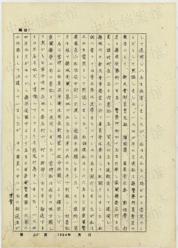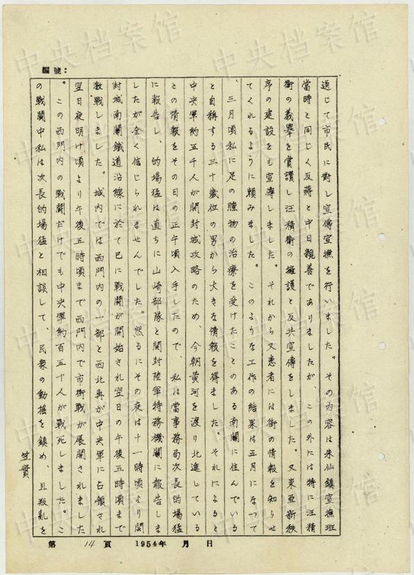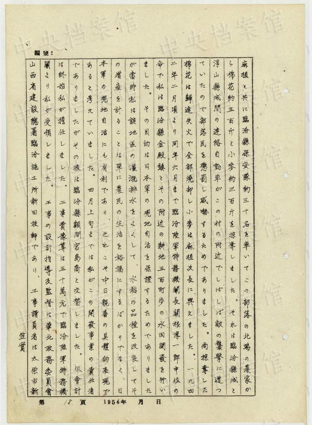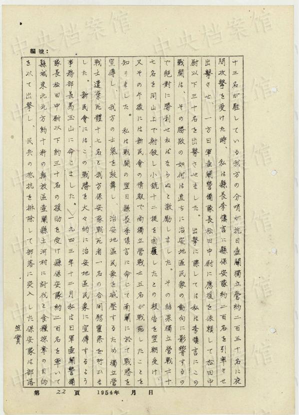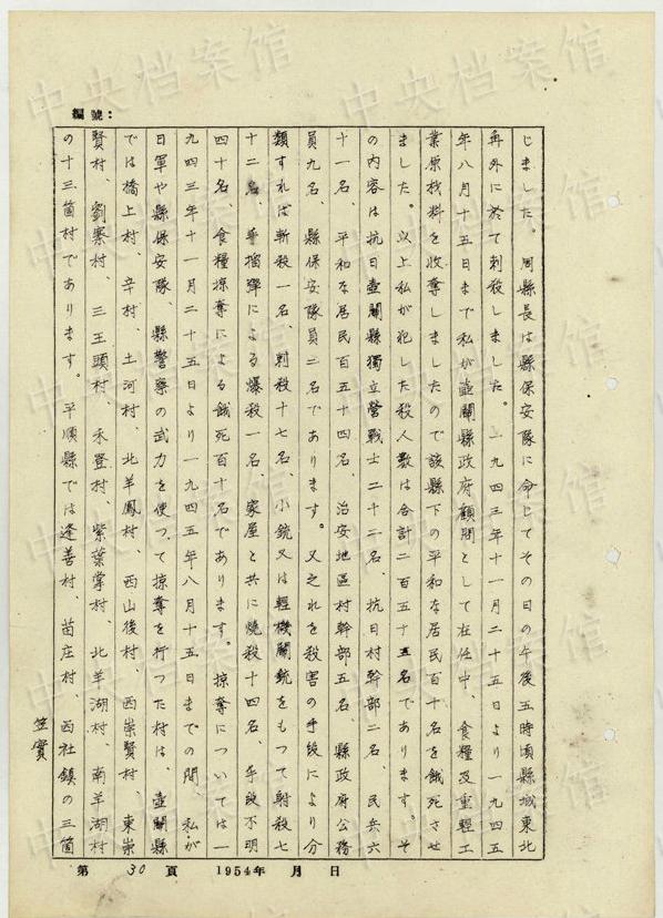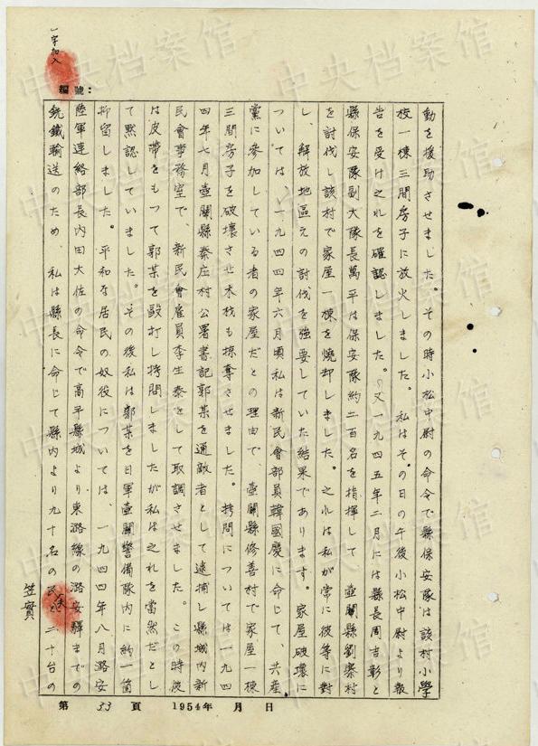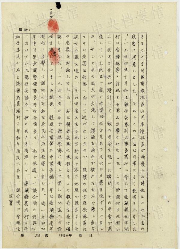 1945年2月には、壷関県県長に土河村への進(jìn)攻を命じ、「該村民兵十八名を殺害しました」。同月、劉寨村への進(jìn)攻を命じ、「該村民兵十四名を一軒の家屋と共に焼殺しました」