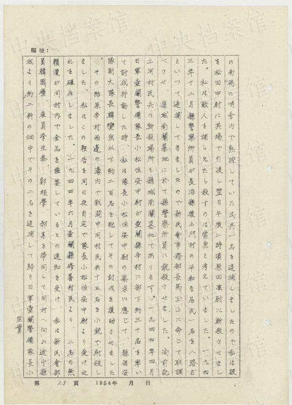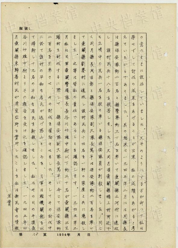 1945年3月には、部下に命じて「壷関県三王頭村を討伐」し、「日軍は軽機(jī)関銃を以て掃射し十九名の平和な居民を射殺しました」(編集MA)