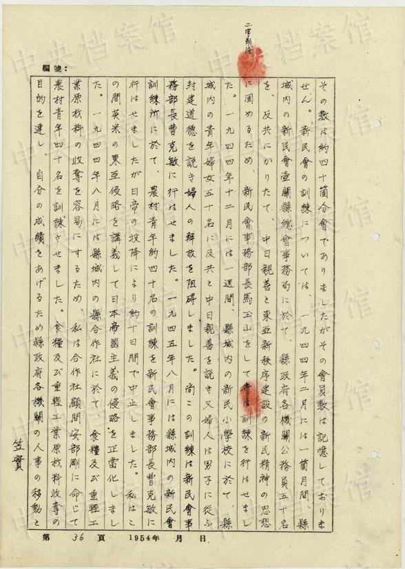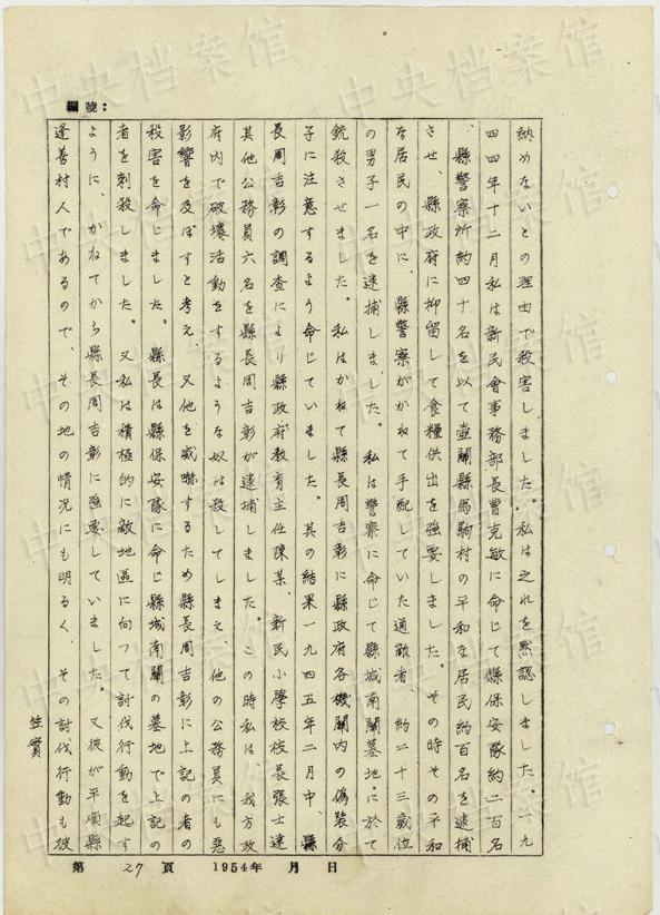 1945年2月には、「県政府教育主任陳某、新民小學(xué)校校長張士達(dá)其他公務(wù)員六名」を逮捕し、県長に「上記の者の殺害を命じました」