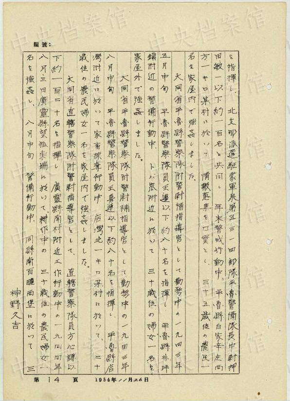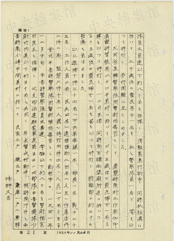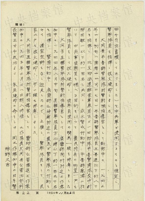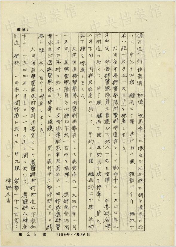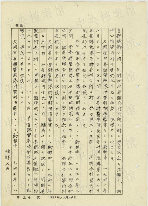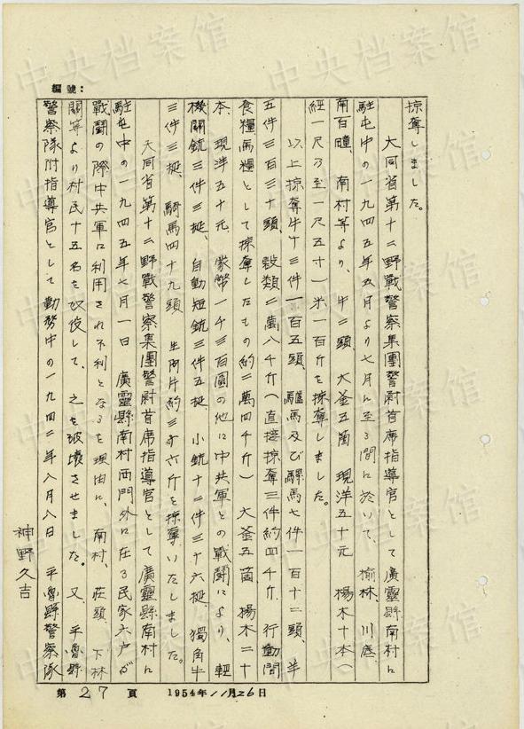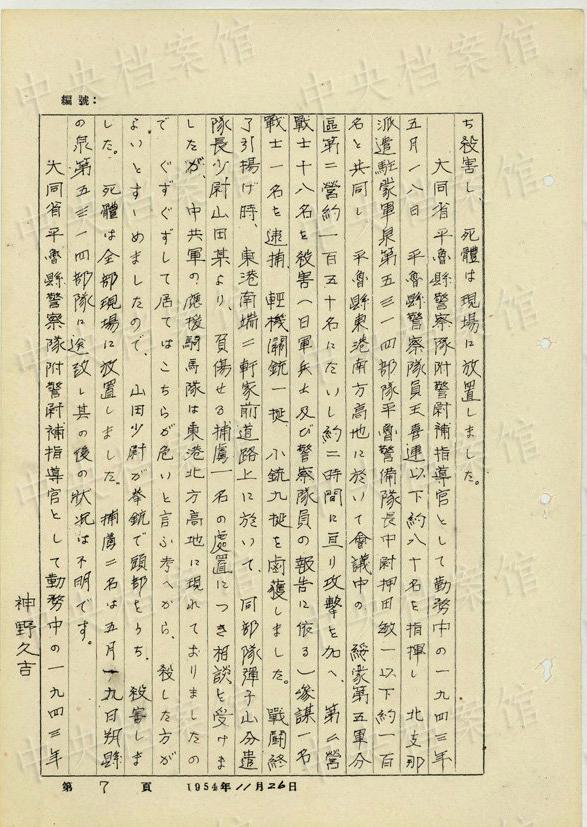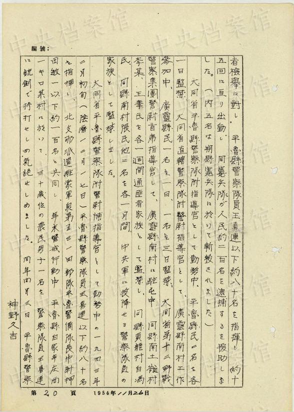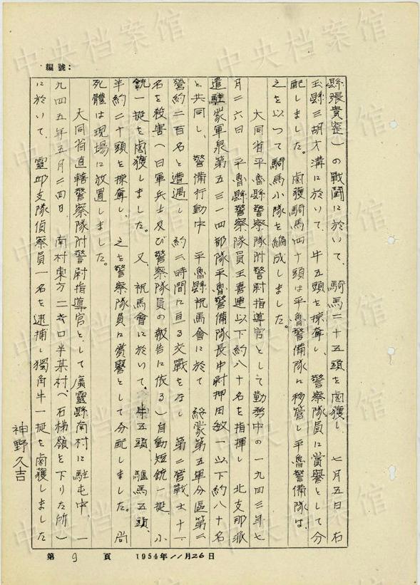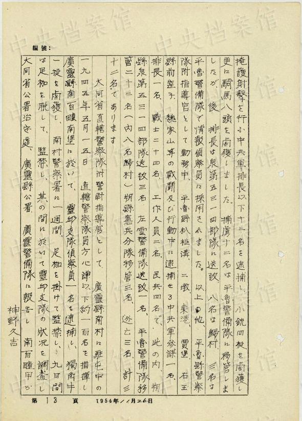 神野久吉の1954年11月の供述書によると、神野は1908年愛媛県生まれ。1941年3月に中國侵略戦爭に加わり、偽大同省公署警察隊(duì)首席指揮官、閻錫山大同保安総隊(duì)少校部附を歴任した。