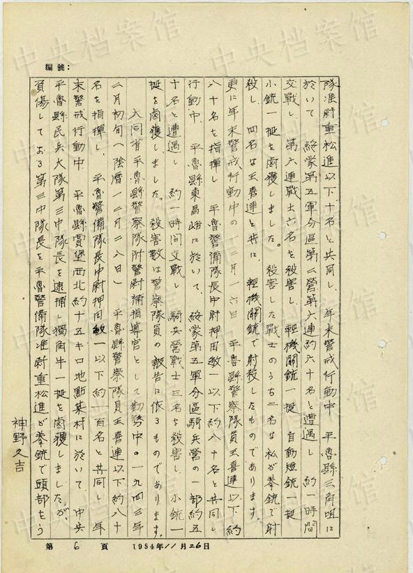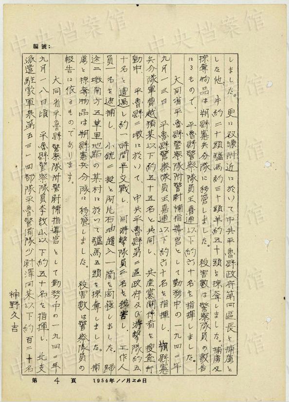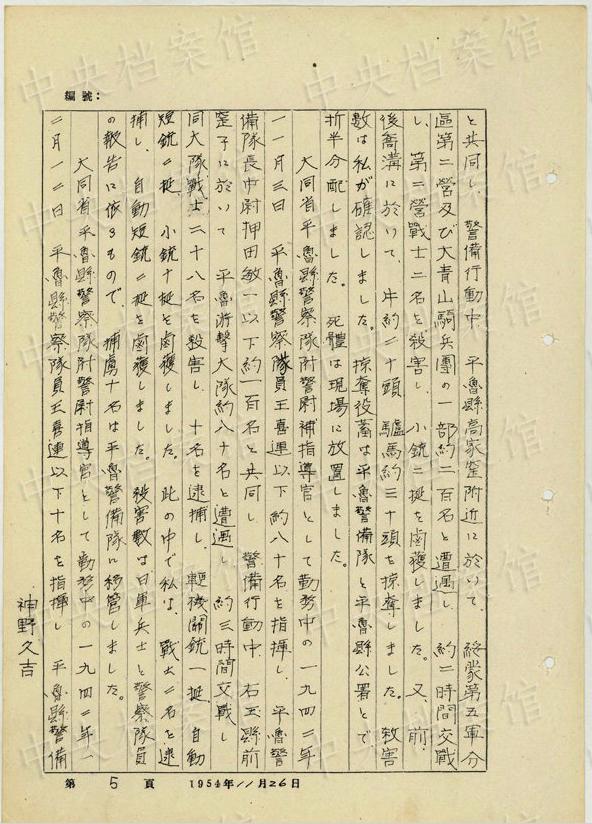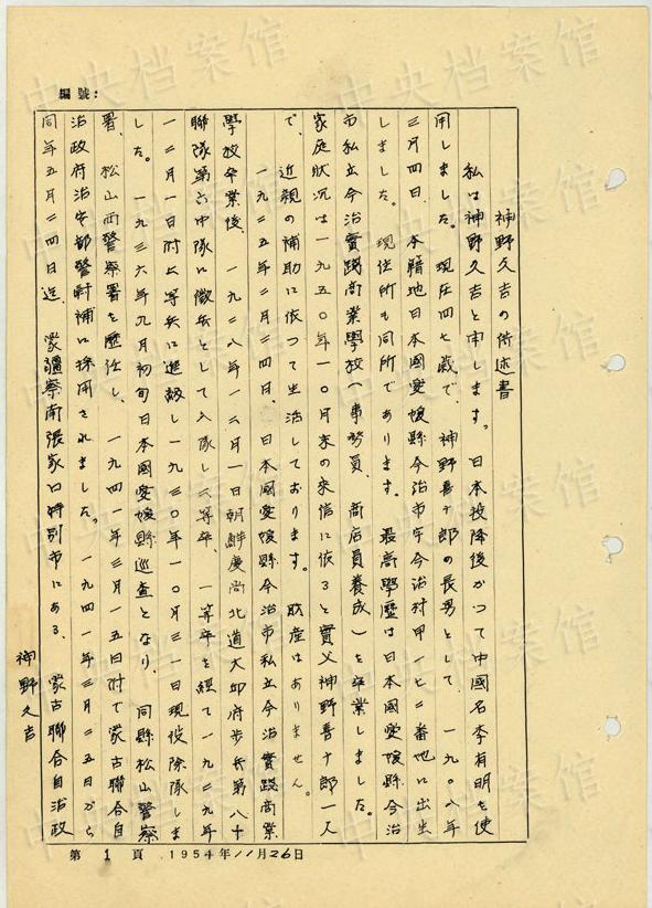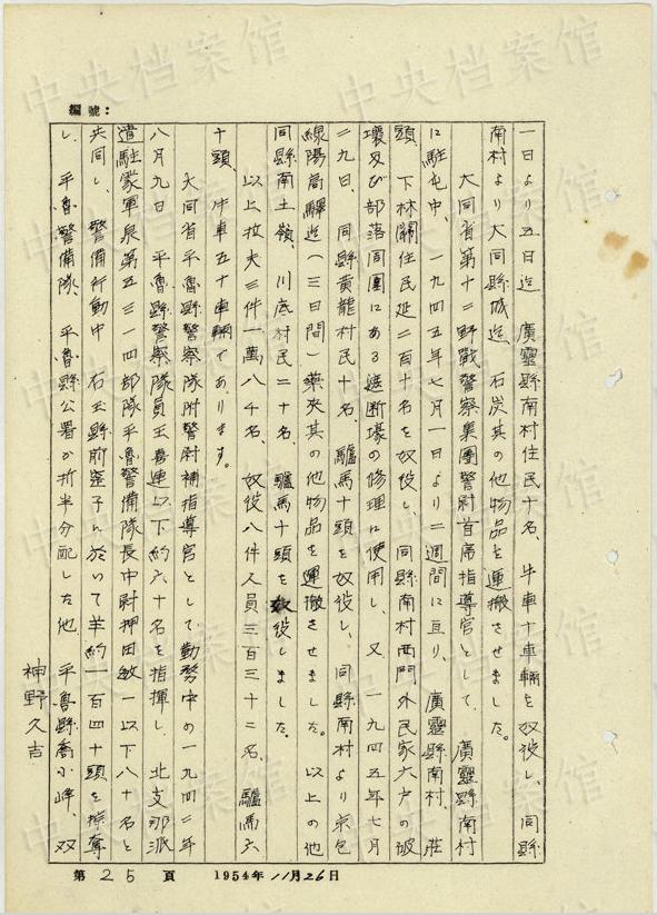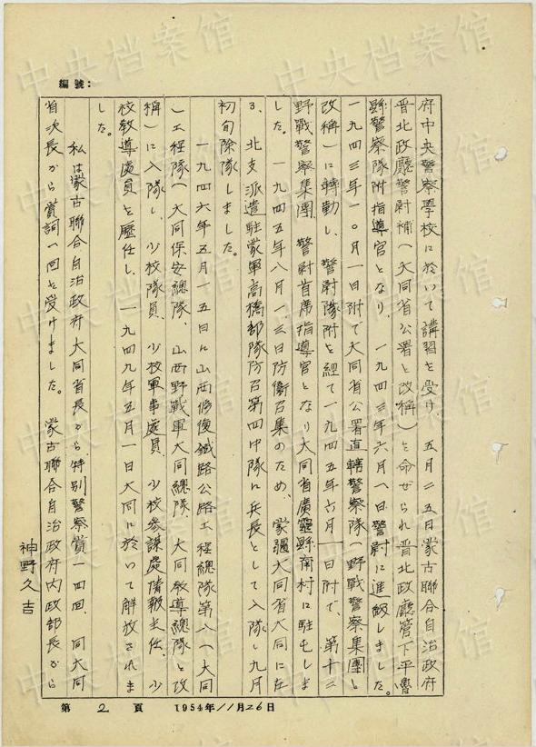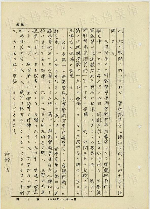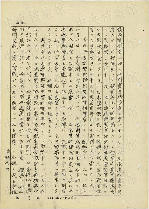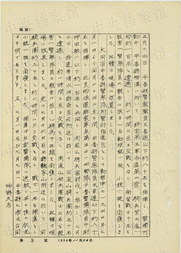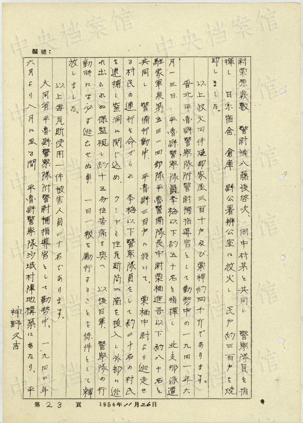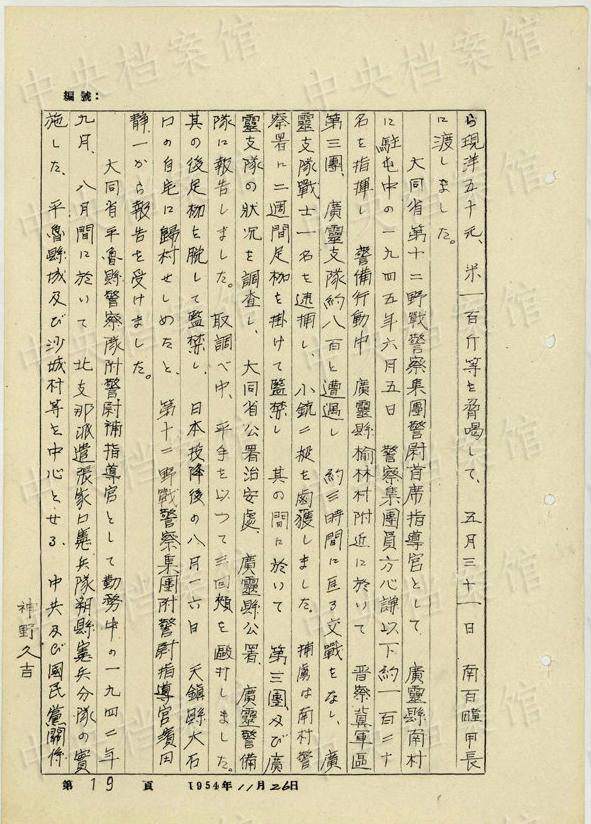 神野久吉の1954年11月の供述書によると、神野は1908年愛媛県生まれ。1941年3月に中國侵略戦爭に加わり、偽大同省公署警察隊(duì)首席指揮官、閻錫山大同保安総隊(duì)少校部附を歴任した。