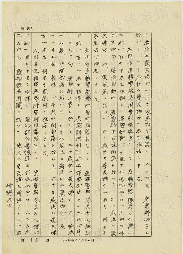 1942年7月15日、「平魯縣城內(nèi)十字路北街の農(nóng)民家屋內(nèi)に於いて、三十二歳位の農(nóng)民婦女一名を強(qiáng)姦しました」。