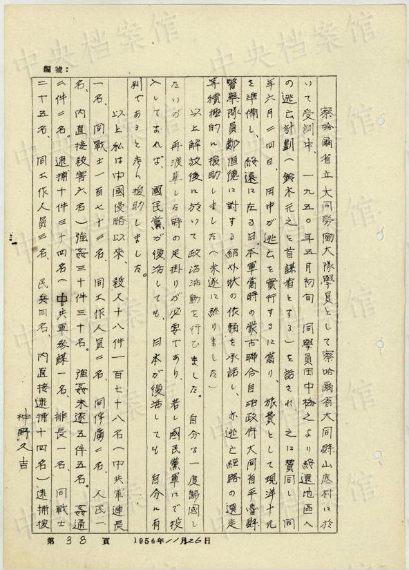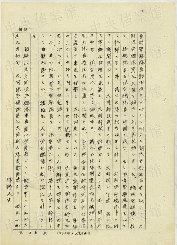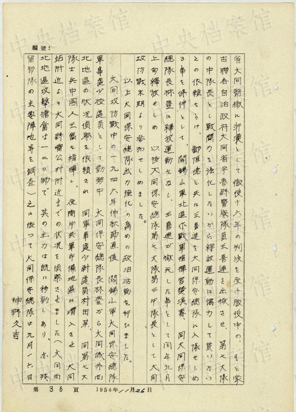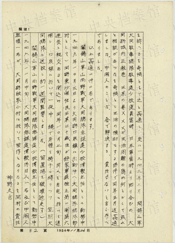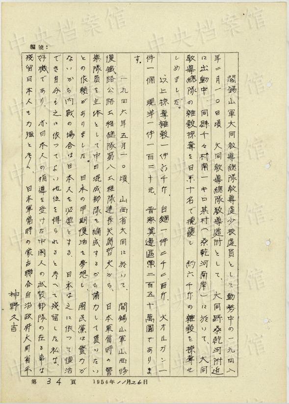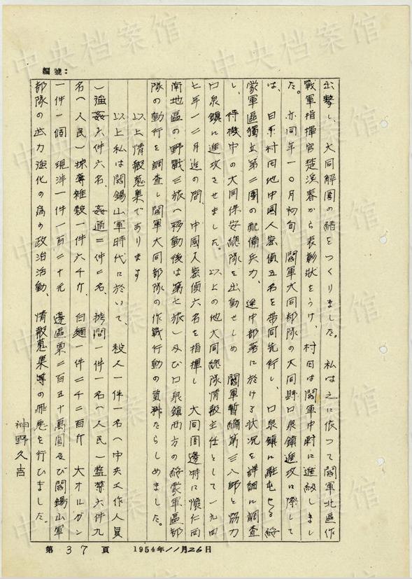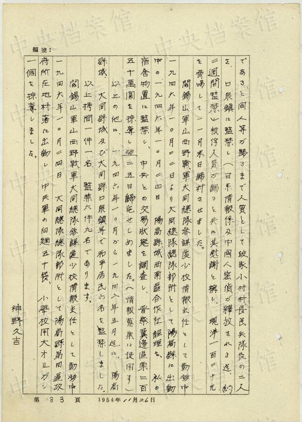神野久吉の1954年11月の供述書によると、神野は1908年愛媛県生まれ。1941年3月に中國(guó)侵略戦爭(zhēng)に加わり、偽大同省公署警察隊(duì)首席指揮官、閻錫山大同保安総隊(duì)少校部附を歴任した。