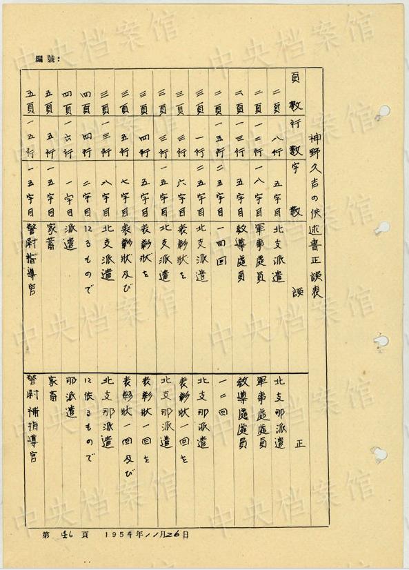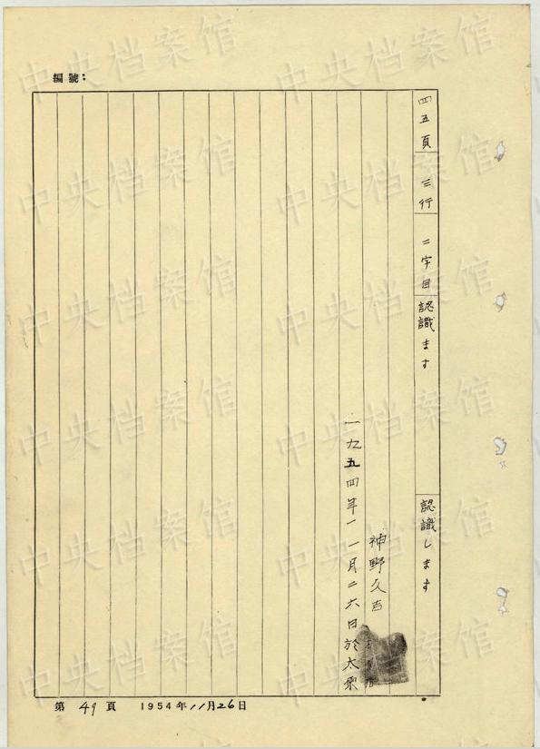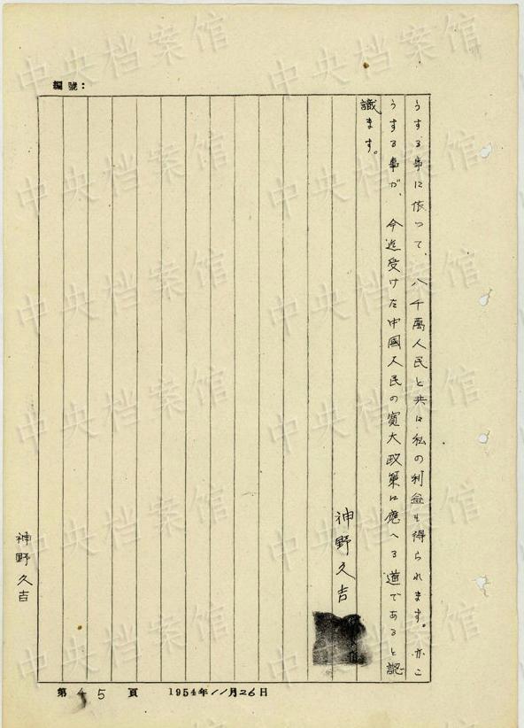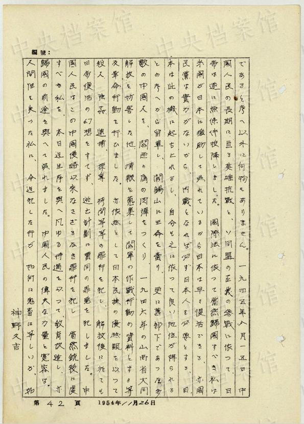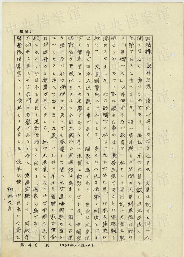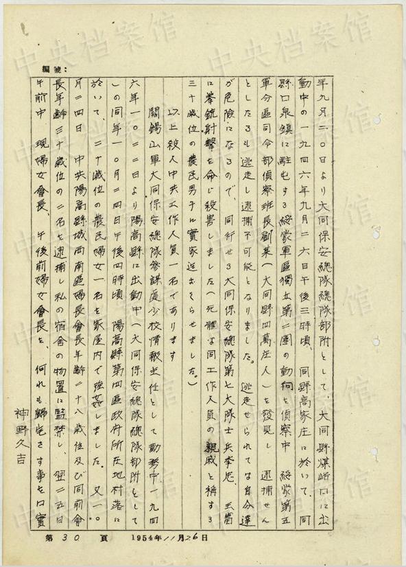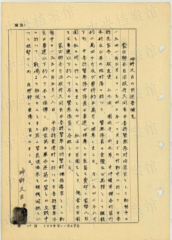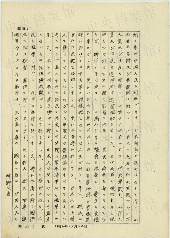 神野久吉の1954年11月の供述書によると、神野は1908年愛媛県生まれ。1941年3月に中國(guó)侵略戦爭(zhēng)に加わり、偽大同省公署警察隊(duì)首席指揮官、閻錫山大同保安総隊(duì)少校部附を歴任した。